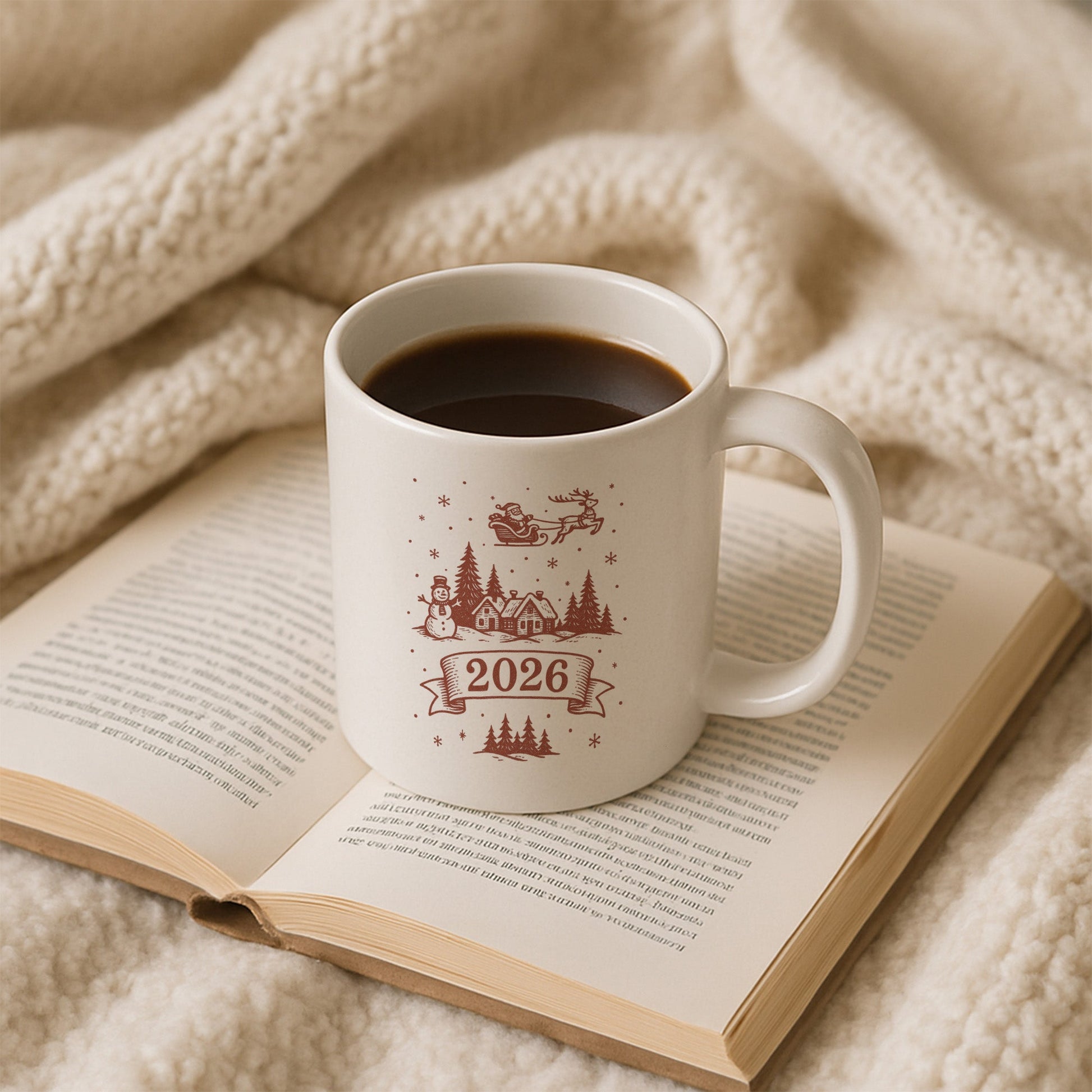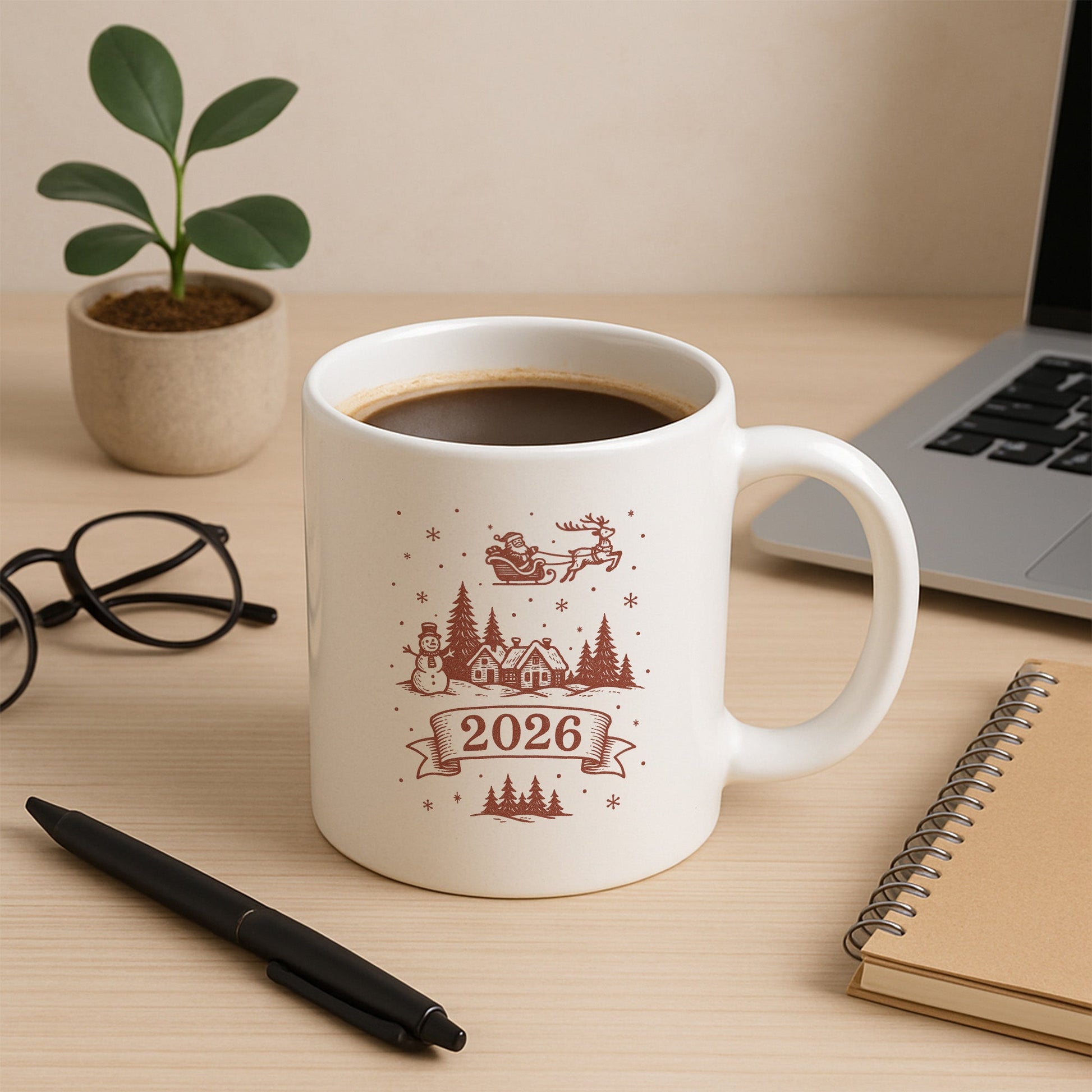 Bu özel tasarım kupa, yeni yılın nostaljik ve huzurlu ruhunu bakır tonlu illüstrasyonlarla buluşturur. Kış köyü evleri, çam ağaçları, kardan adam ve gökyüzünde ilerleyen Noel Baba’nın kızağı; yılbaşı gecelerinin sakinliğini ve sıcaklığını anlatan bütüncül bir sahne oluşturur. Alt kısımda yer alan 2026 detayı, tasarımı yeni yıla özel kalıcı bir hatıraya dönüştürür.