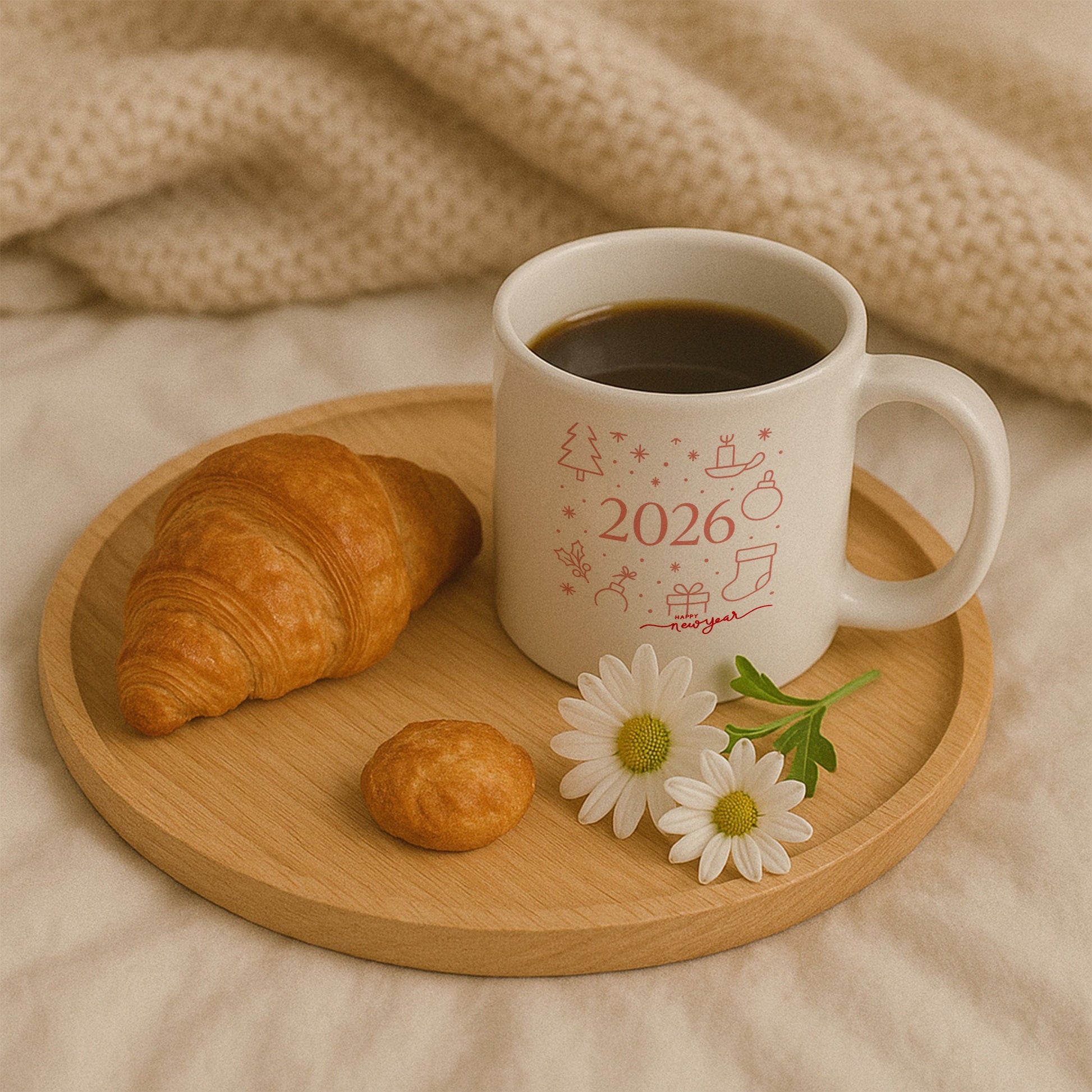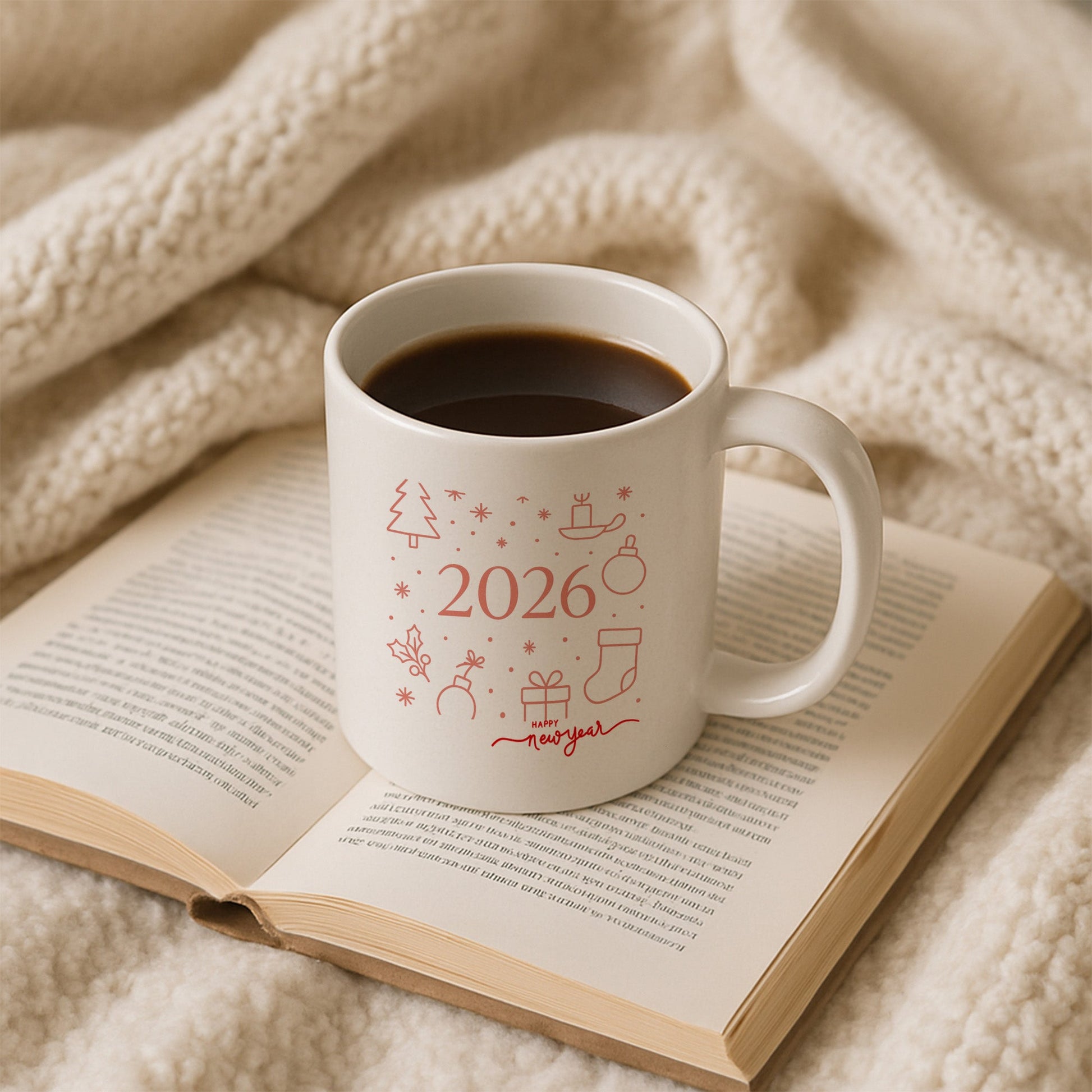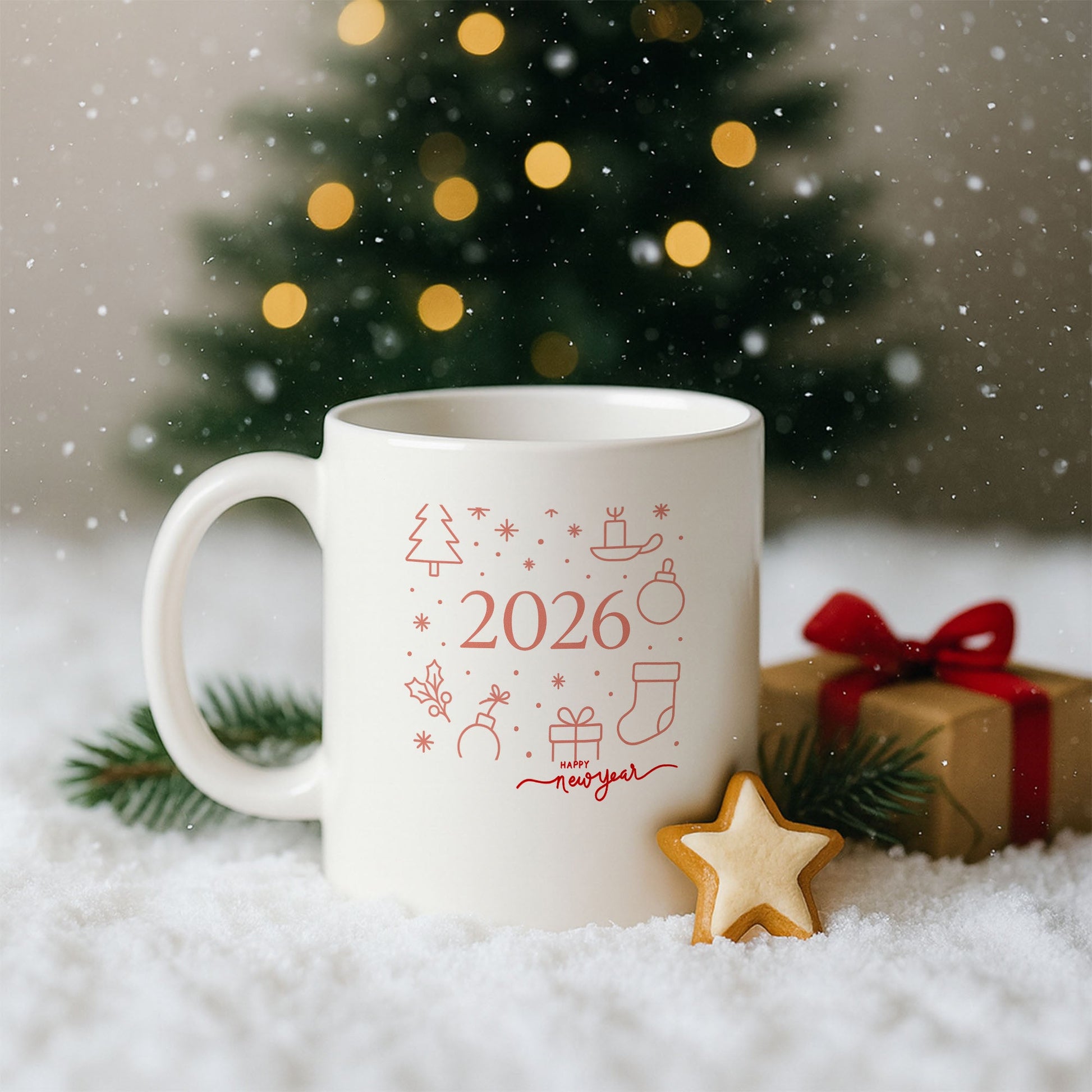 Bu özel tasarım kupa, yeni yıl temasını modern ve sade bir çizgi diliyle yorumlar. Çam ağacı, mum, hediye, yılbaşı çorabı ve süs ikonlarından oluşan minimal kompozisyon, tasarıma ferah ve dengeli bir görünüm kazandırır. Ortadaki 2026 detayı ve alt kısımda yer alan “Happy New Year” yazısı, kupayı yeni yıla özel anlamlı bir hatıraya dönüştürür.