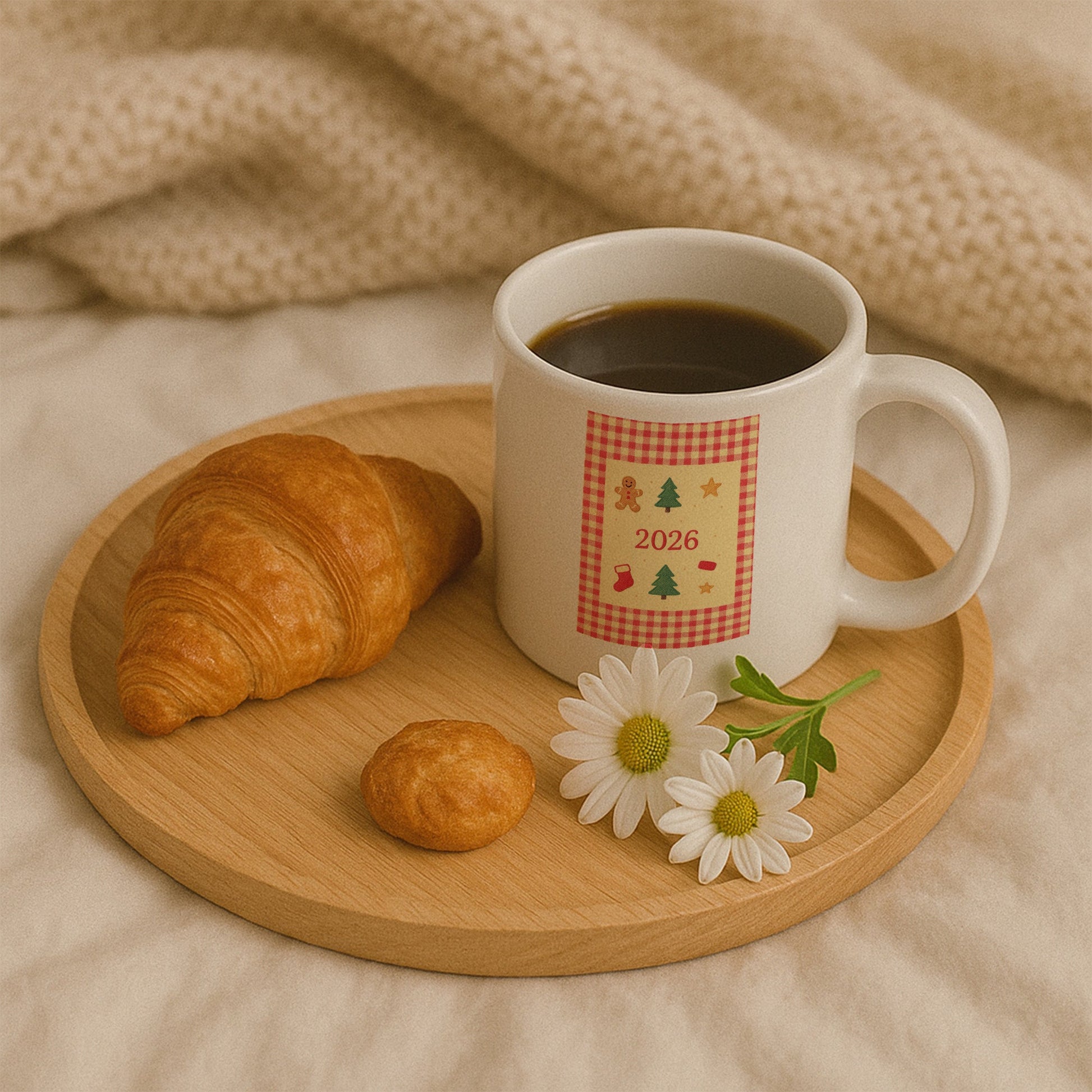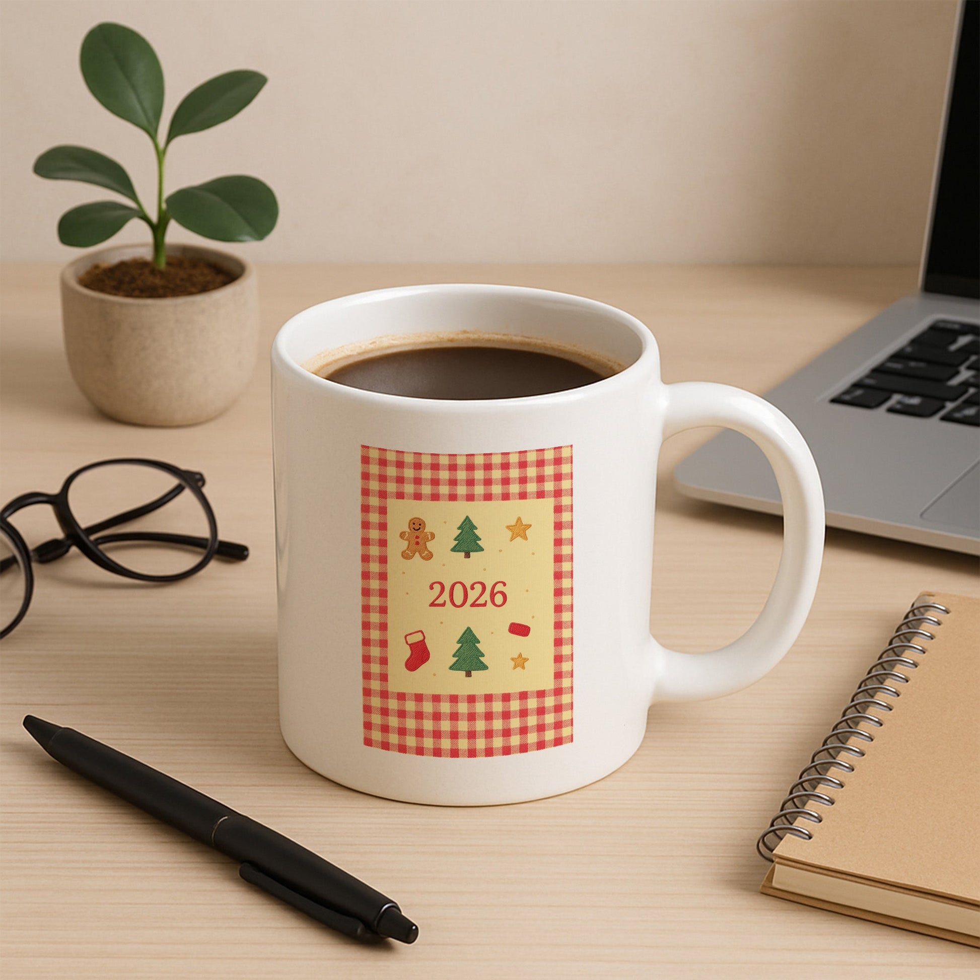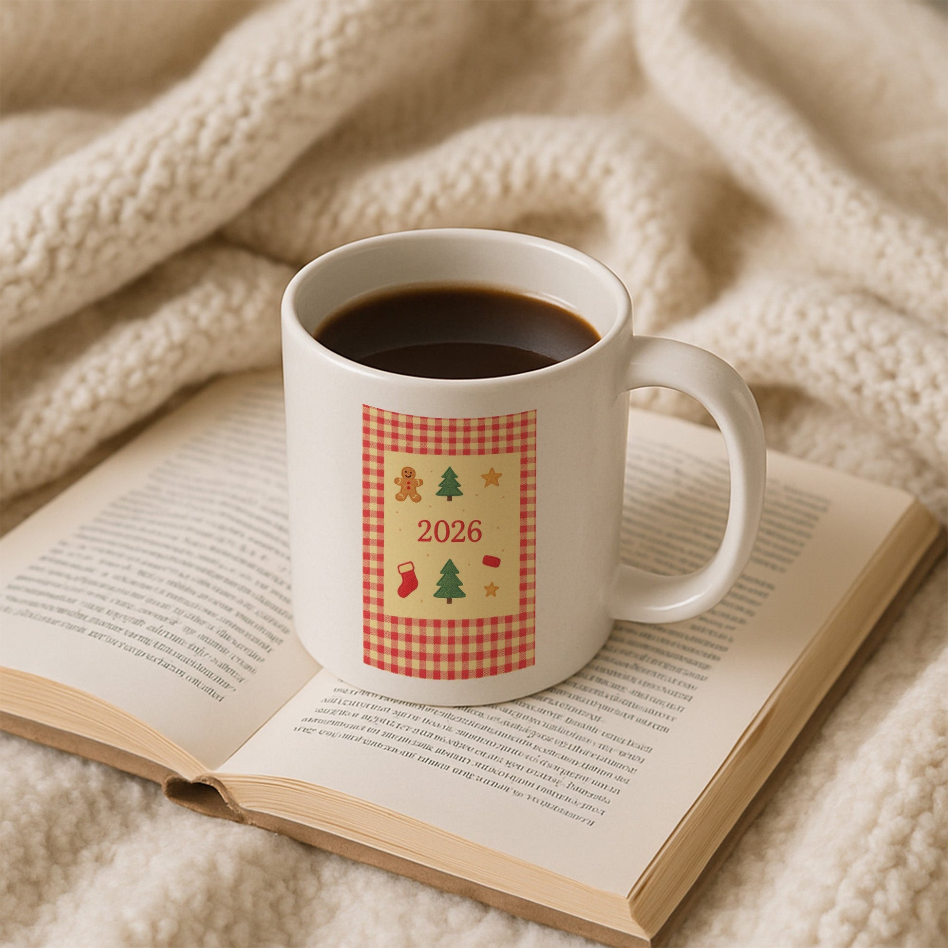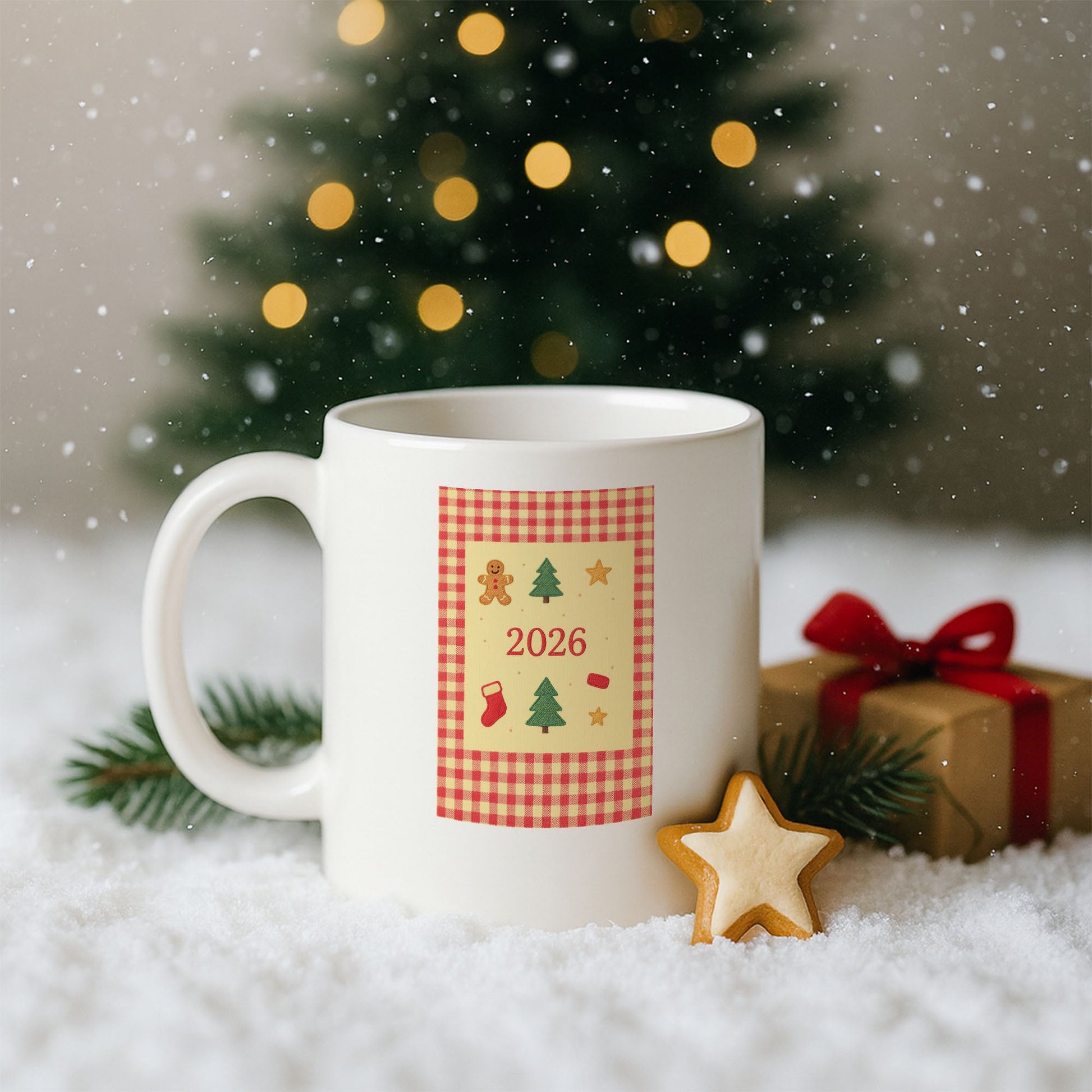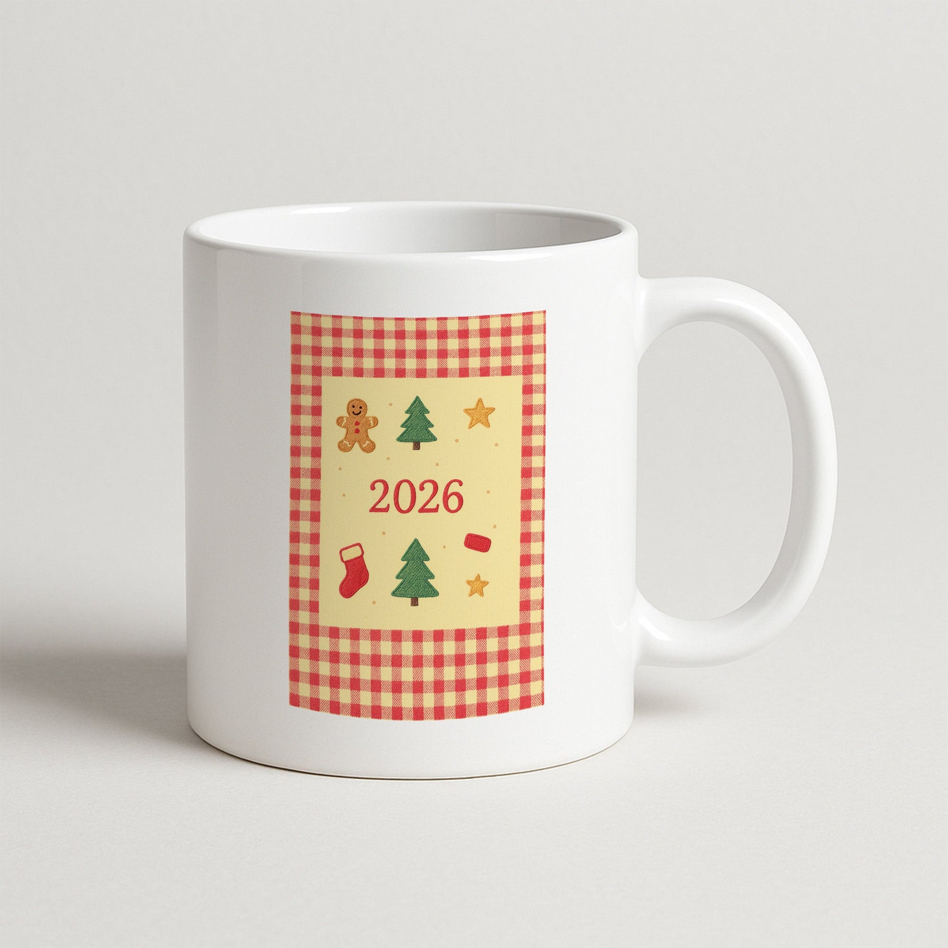 Bu özel tasarım kupa, yeni yılın nostaljik ve sıcak atmosferini pötikare desen ve kurabiye dokulu yılbaşı figürleriyle bir araya getirir. Zencefilli kurabiye figürü, çam ağaçları, yıldızlar ve çorap detayları; yılbaşı sofralarının samimi ve ev hissi veren ruhunu yansıtır. Ortada yer alan 2026 yazısı, kupayı yeni yıla özel kalıcı bir hatıraya dönüştürür.