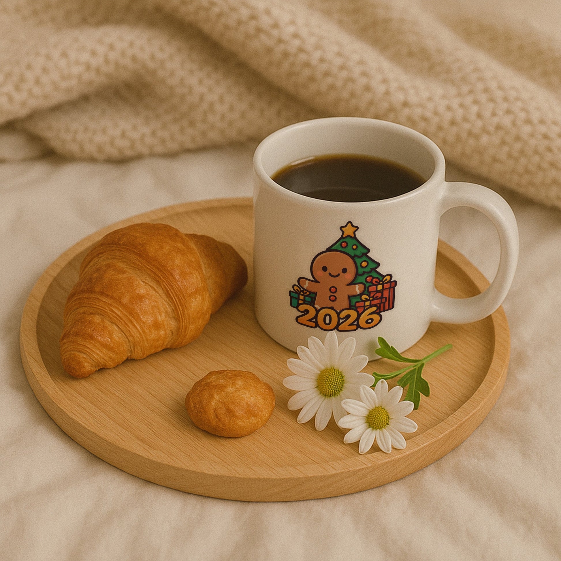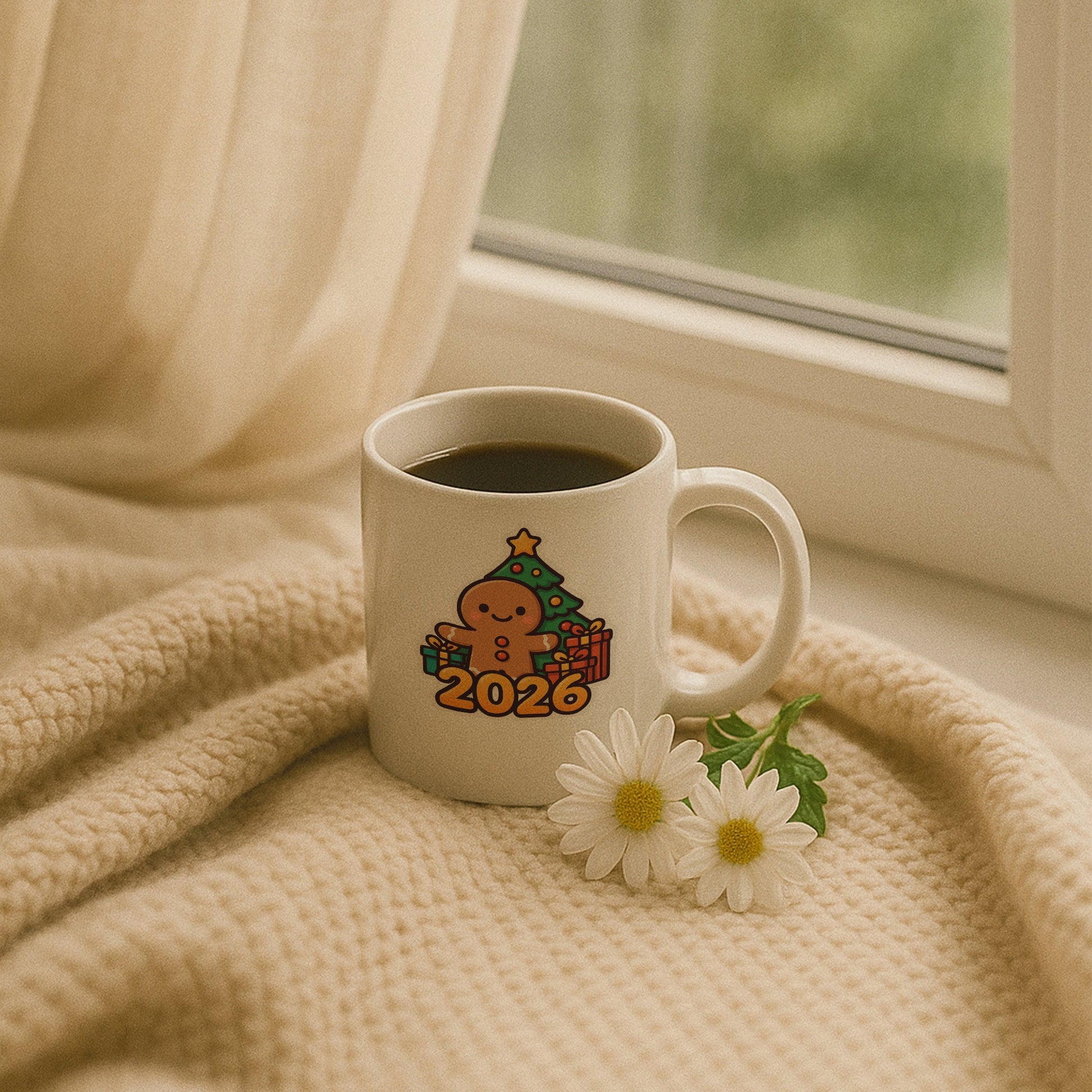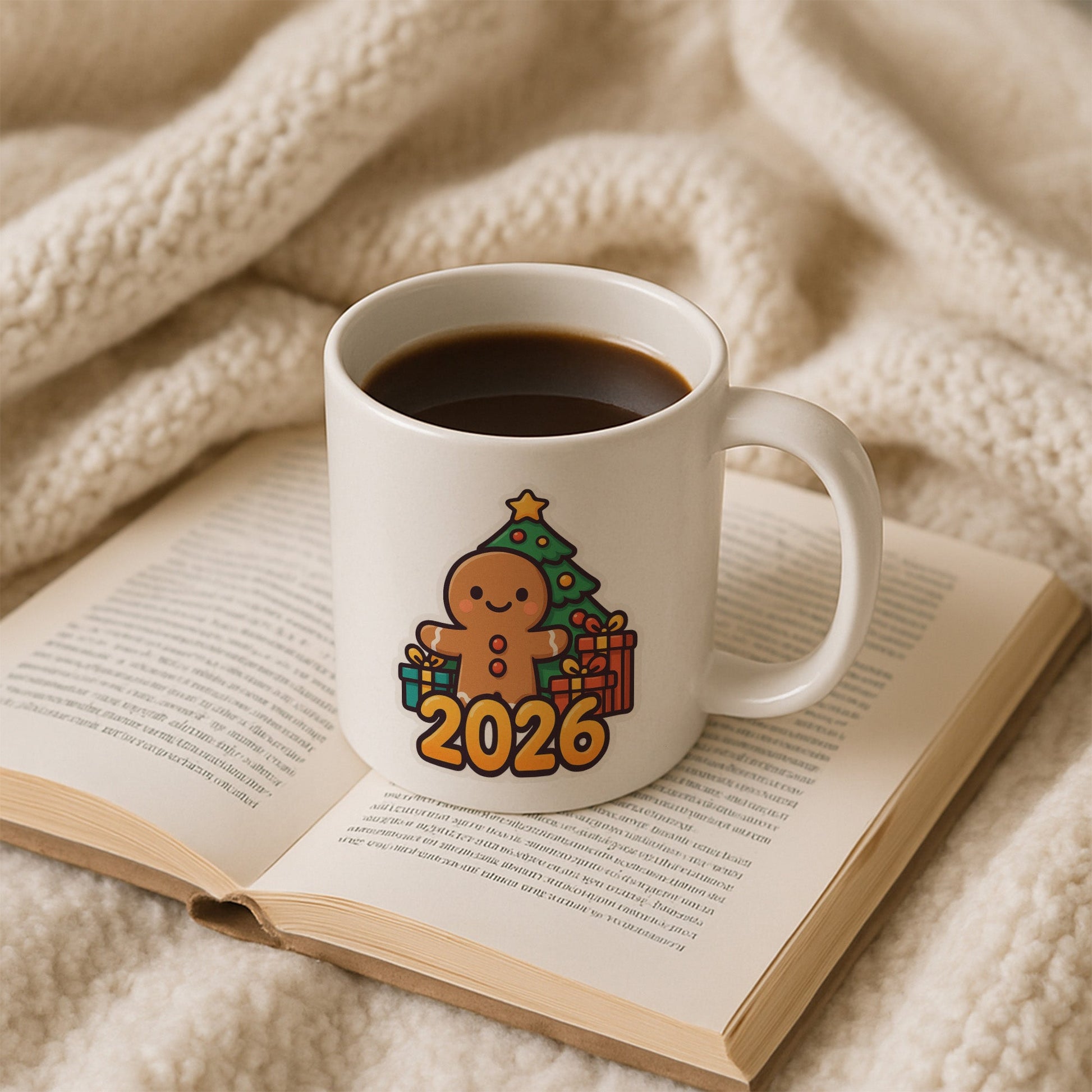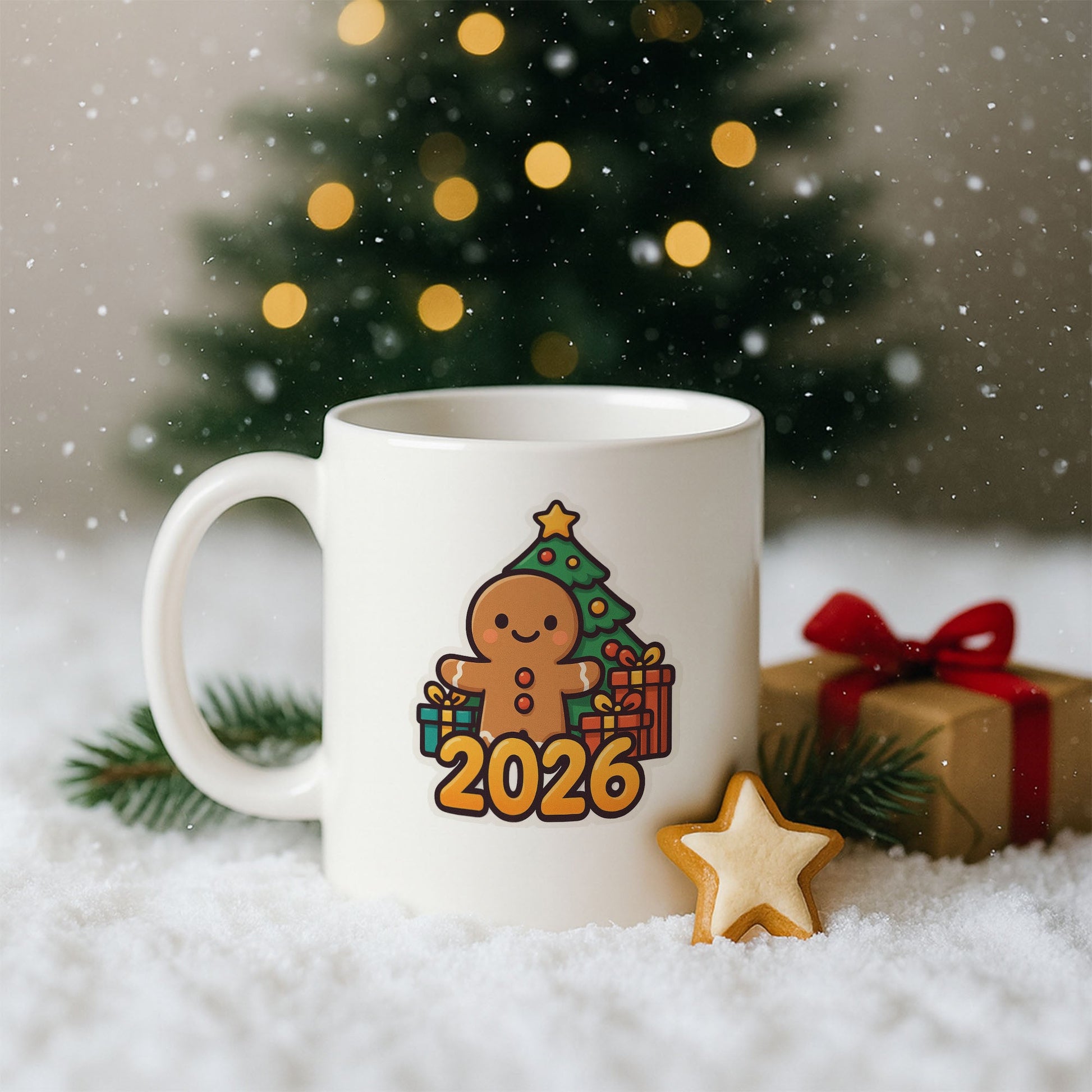 Bu özel tasarım kupa, yeni yılın samimi ve neşeli atmosferini yansıtan zencefilli kurabiye figürüyle dikkat çeker. Arka plandaki süslenmiş çam ağacı ve hediyeler, yılbaşı heyecanını tamamlayan sıcak bir görsel bütünlük sunar. Üzerindeki 2026 detayı sayesinde yalnızca bir kupa değil, aynı zamanda yeni yıla ait güzel bir hatıra niteliği taşır.