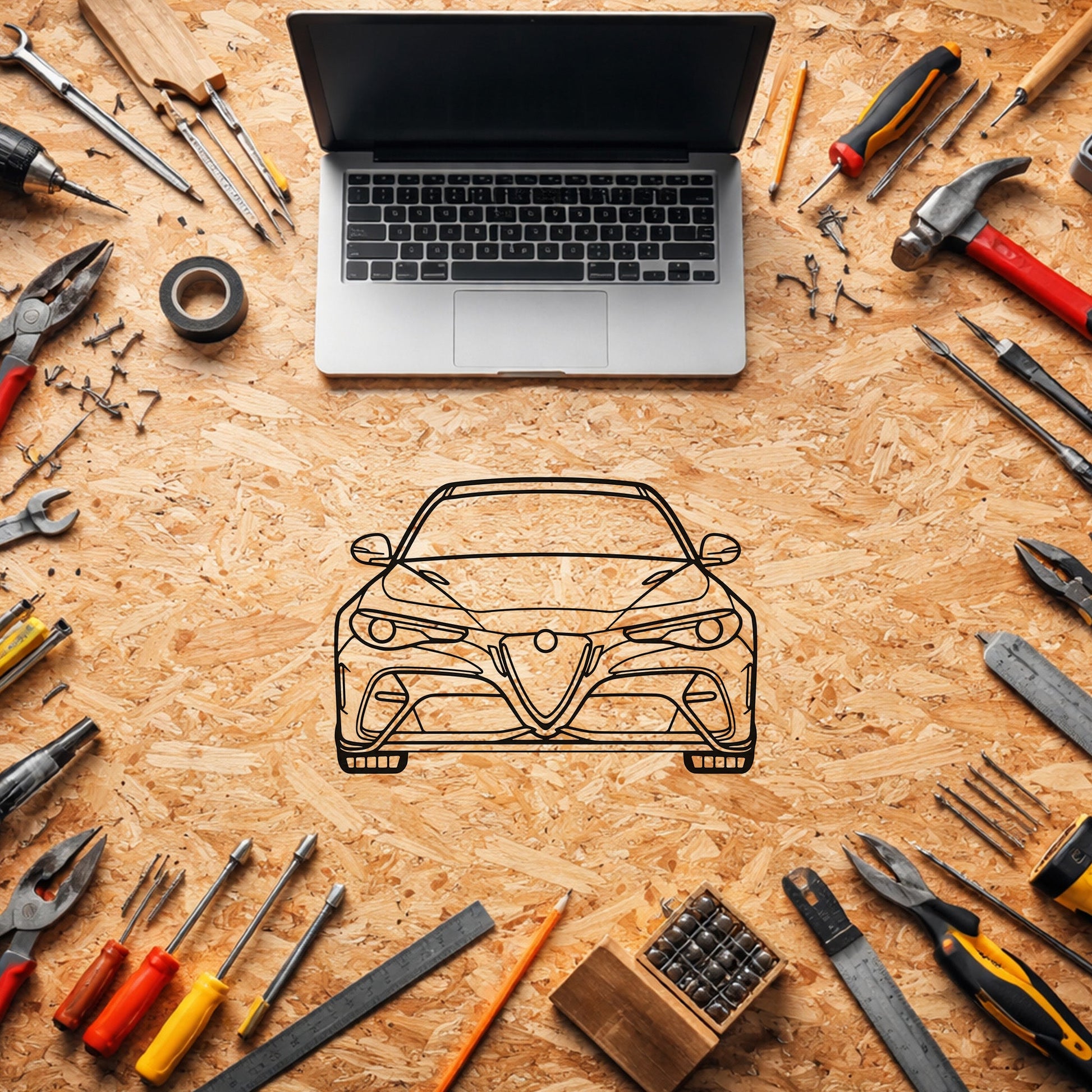 Alfa Romeo Giulia GTA 2020 metal duvar tablosu, lazer kesim detaylara sahip metal tasarımı ve elektrostatik siyah boya kaplaması ile net ve temiz bir görünüm sunar. Minimal çizgileri sayesinde bulunduğu ortama kolayca uyum sağlar ve dekorasyonu yormadan tamamlar. Hafif yapısı sayesinde duvara kolayca monte edilebilir ve iç mekân kullanımında bakım gerektirmeden uzun süre estetik görünümünü korur. Keskin hatlarla elde edilen siluet, aracın sportif karakterini güçlü biçimde yansıtır.