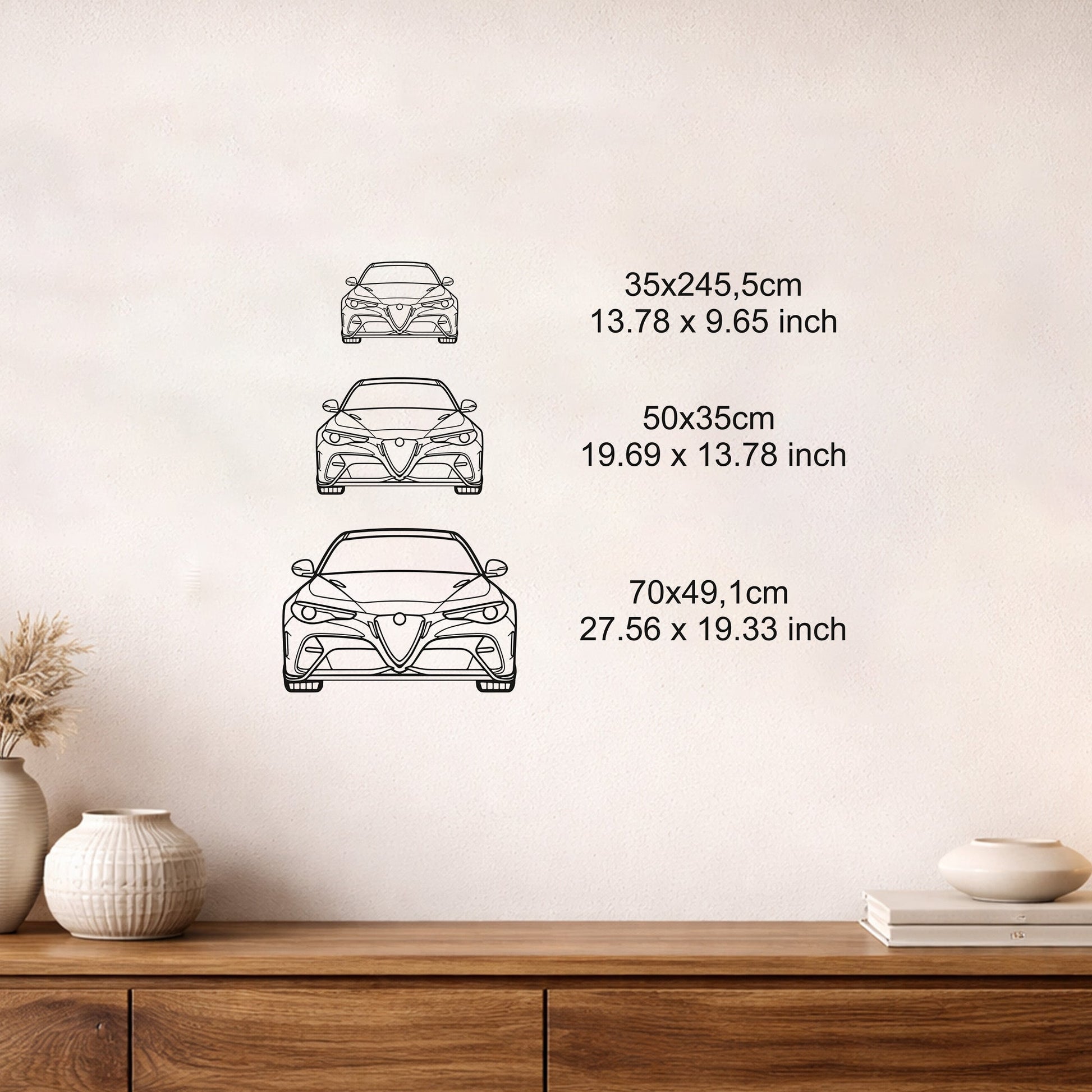Alfa Romeo Giulia GTA 2020 metal duvar tablosu, farklı alan ihtiyaçlarına uyum sağlayabilmesi için üç farklı ölçü seçeneği ile sunulmaktadır. Dengeli oranları sayesinde hem dar hem de geniş duvar yüzeylerinde güçlü bir kompozisyon oluşturur. Performans ve tasarımı bir araya getiren bu siluet, mekâna sportif ve prestijli bir karakter kazandırır.