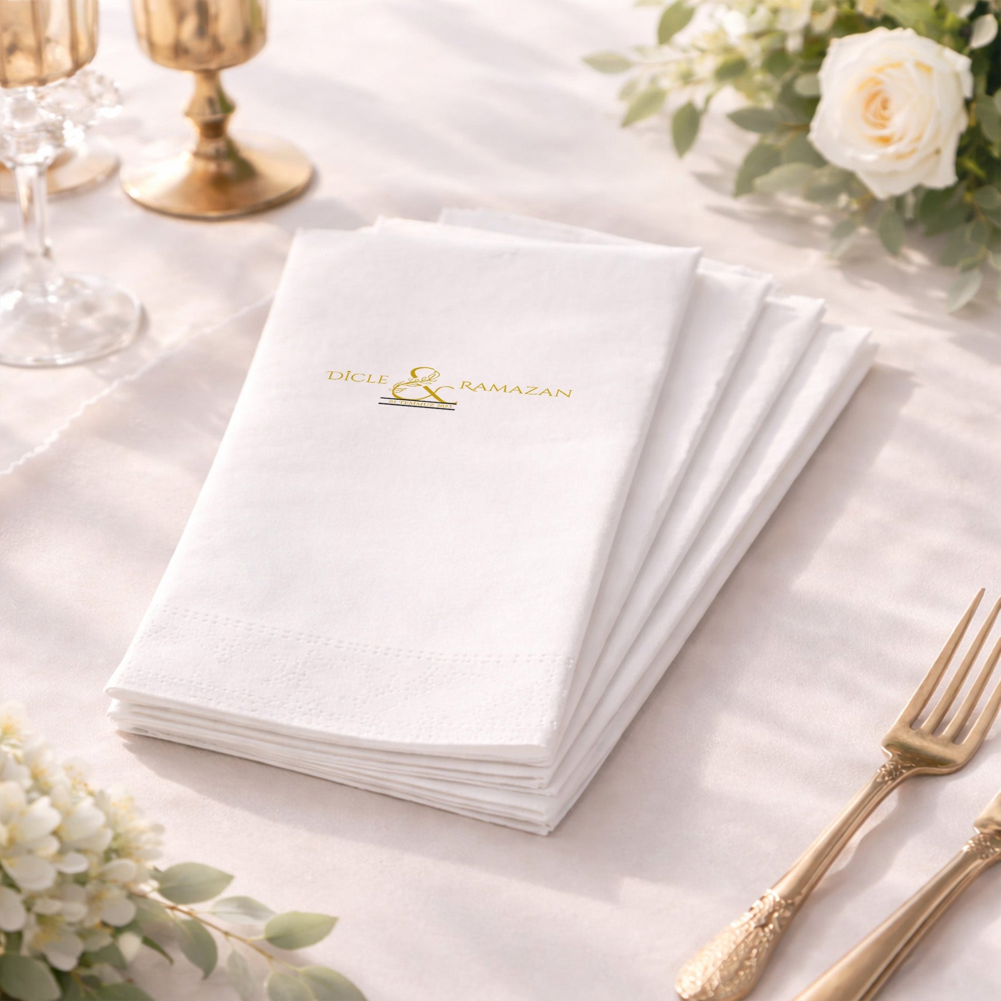 Altın Amblemli Özel Gün Peçetesi – Şık Düğün ve Nişan Tasarımı