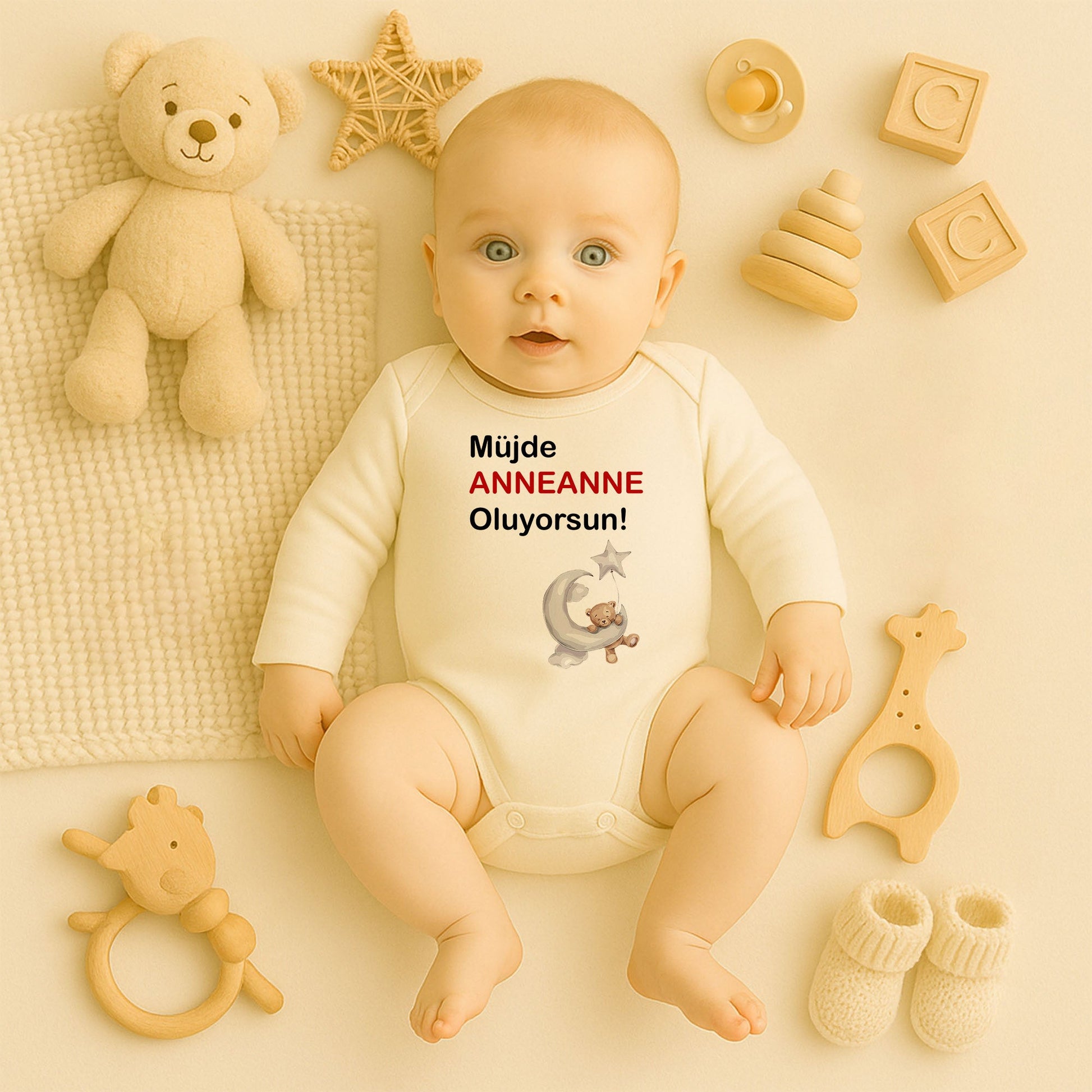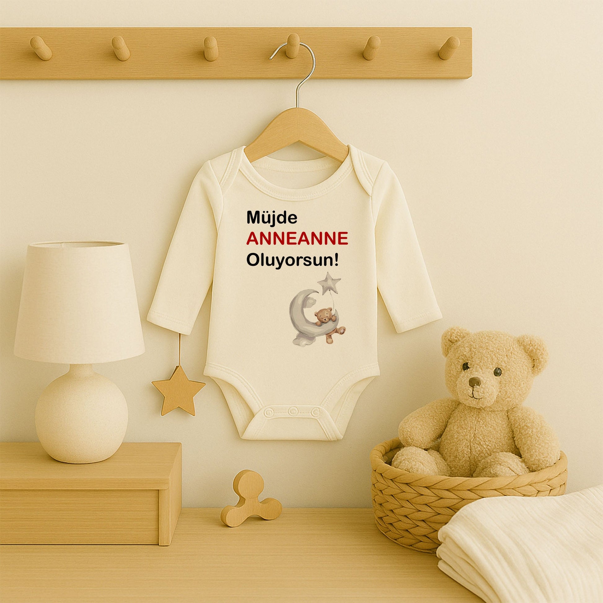 Yıldız tutan uyuyan ayıcık figürü ve üstte yer alan kırmızı “ANNEANNE” yazısı ile hem modern hem duygusal bir görünüm sunar.
