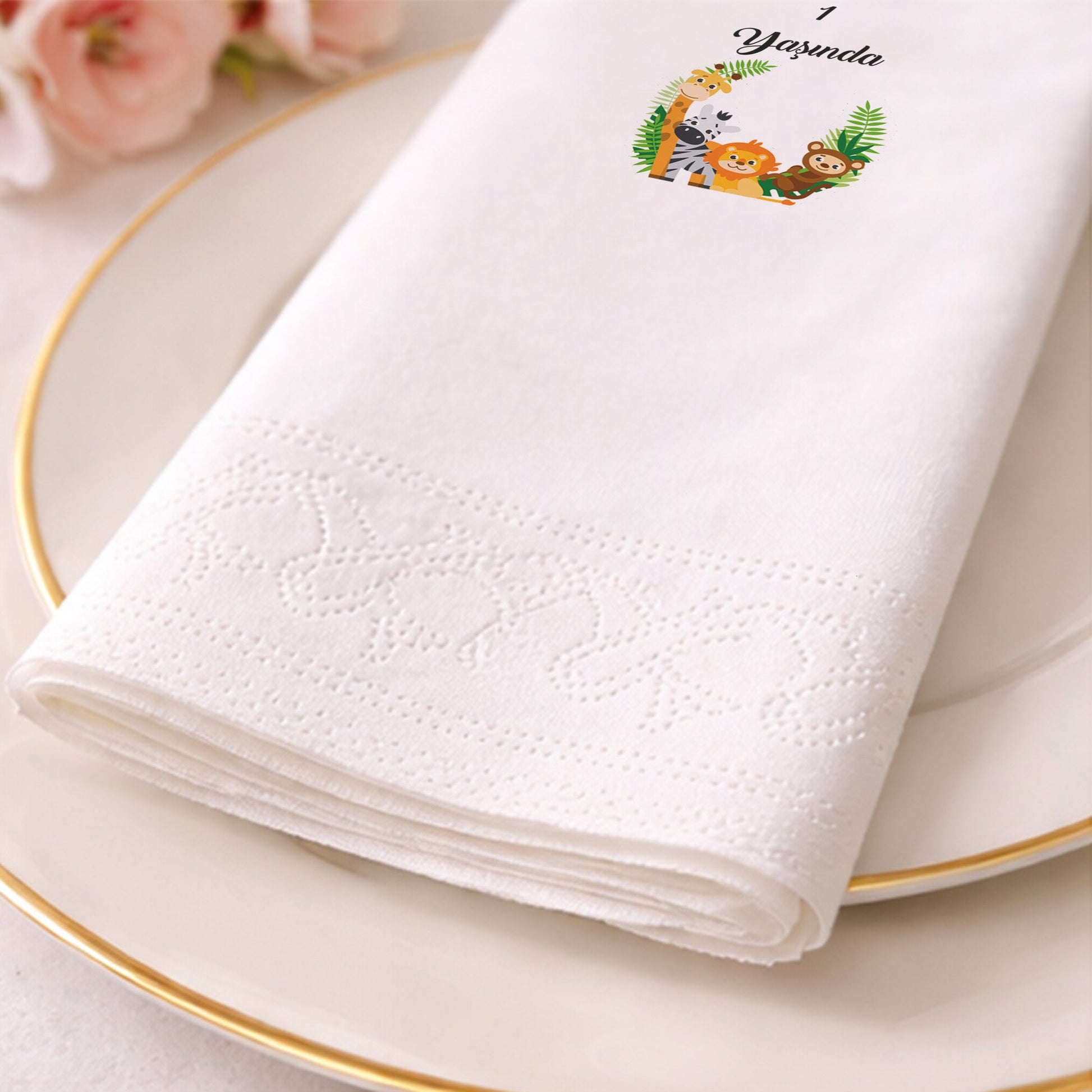 Zürafa, zebra, aslan ve maymun figürlerinden oluşan bu neşeli safari konsepti, Arya’nın ilk yaş gününü vahşi doğanın enerjisiyle kutluyor. Canlı yeşil yapraklar ve sevimli hayvan dostlarımızla hazırlanan bu tasarım, çocukların hayal dünyasına hitap eden dinamik bir atmosfer yaratır. Özellikle macera temalı doğum günü partileri için vazgeçilmez bir parça olan bu peçeteler, sofralara renk ve hareket getirir. Kaliteli kağıt yapısı ve sağlığa zararsız boyalarla üretilen baskısı sayesinde güvenle kullanabilirsiniz. Safari temalı diğer parti malzemeleriyle kombinlendiğinde harika bir görsel bütünlük sağlayan bu ürün, küçük misafirlerinizin de ilgisini çekecek en eğlenceli detaylardan biri olacaktır. Kutlamanızı unutulmaz bir maceraya dönüştürün.