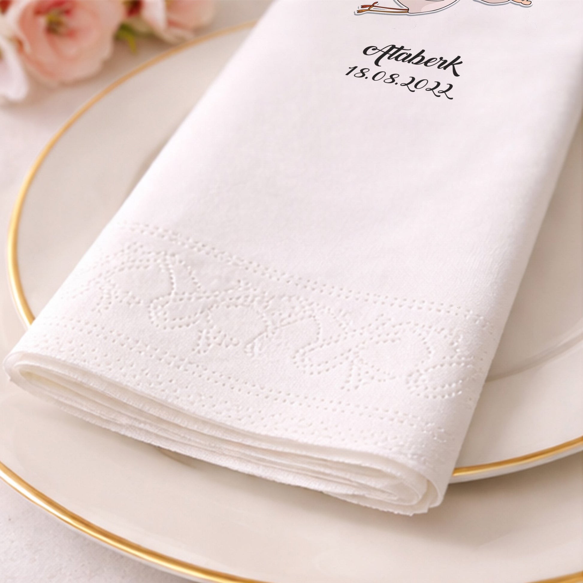 Ataberk bebeğin dünyaya gelişini müjdeleyen bu özel leylek temalı peçete, siyah zemin üzerinde şık ve asil bir duruş sergiler. Gökyüzünde süzülen leylek ve bebek figürü, geleneksel bir hikayeyi modern bir tasarımla sofralarınıza taşır. İsim ve tarih baskısıyla tamamen size özel hale getirilen bu ürün, bebek mevlütleri ve hastane çıkışı kutlamaları için harika bir detaydır. Yumuşak dokusu ve kaliteli kağıt yapısı misafirleriniz için kullanım kolaylığı sağlarken, estetik duruşuyla da beğeni toplar. Ataberk ismine özel hazırlanan bu tasarım, hayatınızın en anlamlı günlerinden birini daha unutulmaz kılar. Gri bulutlar ve zarif fontlarla tamamlanan bu peçete, her türlü konsepte uyum sağlayan özel bir hatıradır.