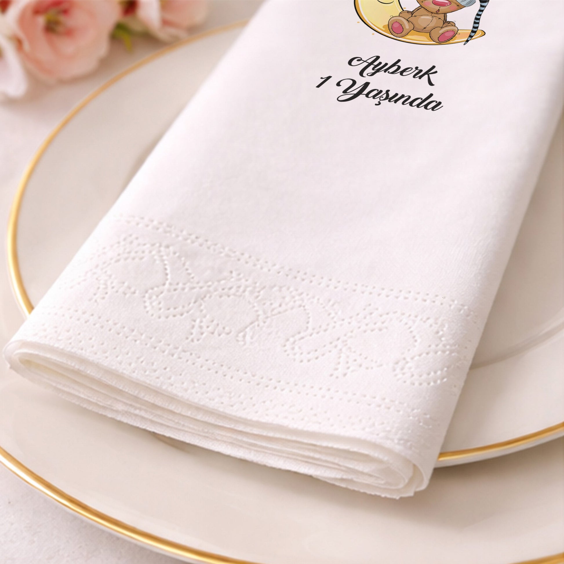 Hilal şeklinde gülen bir ayın üzerine tünemiş, çizgili uyku şapkasıyla sevimli bir ayıcık figürü barındıran bu peçete, Ayberk’in ilk yaş günü için hazırlandı. Pastel sarı ve kahverengi tonlarının huzur veren uyumu, bebek mevliti veya doğum günü sofralarında masalsı bir atmosfer yaratır. Yıldızlarla süslenmiş bu nazik tasarım, çocukların hayal dünyasını yansıtan yumuşak bir estetiğe sahiptir. Kaliteli kağıt yapısı, yumuşak dokusuyla hassas kullanıma uygundur ve yüksek emicilik sağlar. "1 Yaşında" yazısı ve isim özelleştirmesi, kutlamanın ana temasını şık bir şekilde vurgular. Misafirlerinizin içini ısıtacak bu sevimli illüstrasyon, sunumlarınıza samimiyet ve özen katar. Uyku temalı veya gökyüzü temalı partiler için vazgeçilmez bir tamamlayıcı olan bu peçete, Ayberk ve benzeri isimlerle özelleştirilerek kutlamanızı daha anlamlı ve unutulmaz kılar.