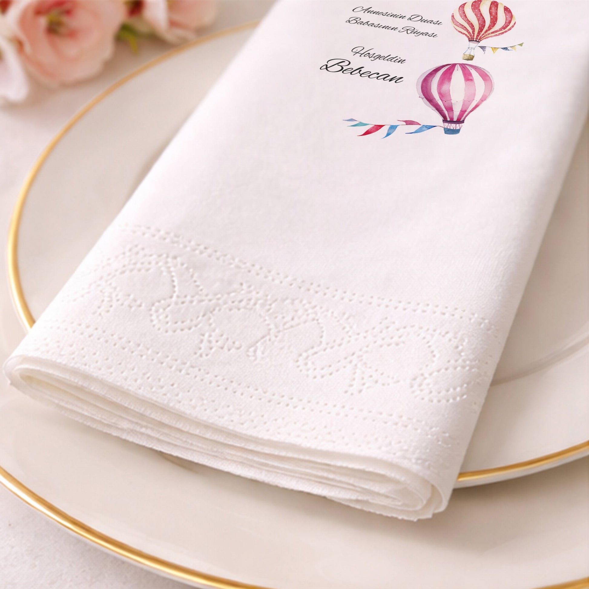 Balon detaylı ayıcık figürü ile hazırlanan bu peçete, erkek bebek yenidoğan ve baby shower organizasyonları için sevimli ve sıcak bir masa düzeni oluşturur. Mavi tonlar ve sade çizgiler, modern ve dengeli bir görünüm sunar. Kişiye özel isim bilgisi eklenerek hazırlanan tasarım, kutlamayı tamamen özgün hale getirir. Çift katlı yapısı sayesinde yumuşak ve dayanıklıdır. Gıda ile temasa uygun baskı teknolojisi kullanılmıştır. Evde yapılan kutlamalar ve aile davetleri için ideal bir masa tamamlayıcısıdır.