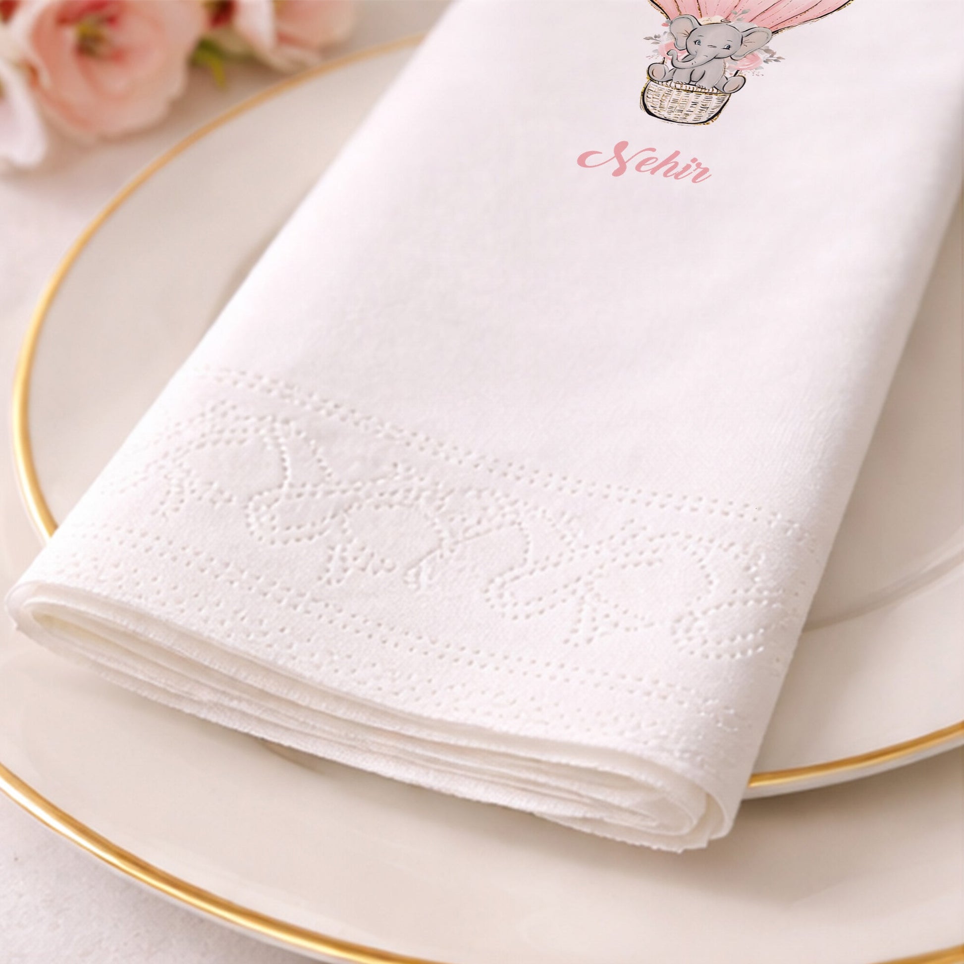Balonlu fil illüstrasyonu ile tasarlanan bu özel gün peçetesi, bebek doğum günü ve baby shower organizasyonları için sevimli ve yumuşak bir atmosfer oluşturur. Kişiye özel isim eklenebilen tasarımı sayesinde masa sunumlarınızı tamamen bebeğinize özel hale getirir. Pastel pembe tonları ve zarif çiçek detayları, özellikle kız bebek konseptlerinde sıcak bir uyum sağlar. Çift katlı ve yumuşak dokulu yapısı, hem estetik hem de pratik kullanım sunar. Gıda ile temasa uygun baskı tekniği kullanılarak üretilmiştir. Pasta, ikram ve tatlı sunumlarında konsepti destekleyen şık bir tamamlayıcıdır. Evde yapılan samimi kutlamalardan profesyonel organizasyonlara kadar rahatlıkla tercih edilebilir.