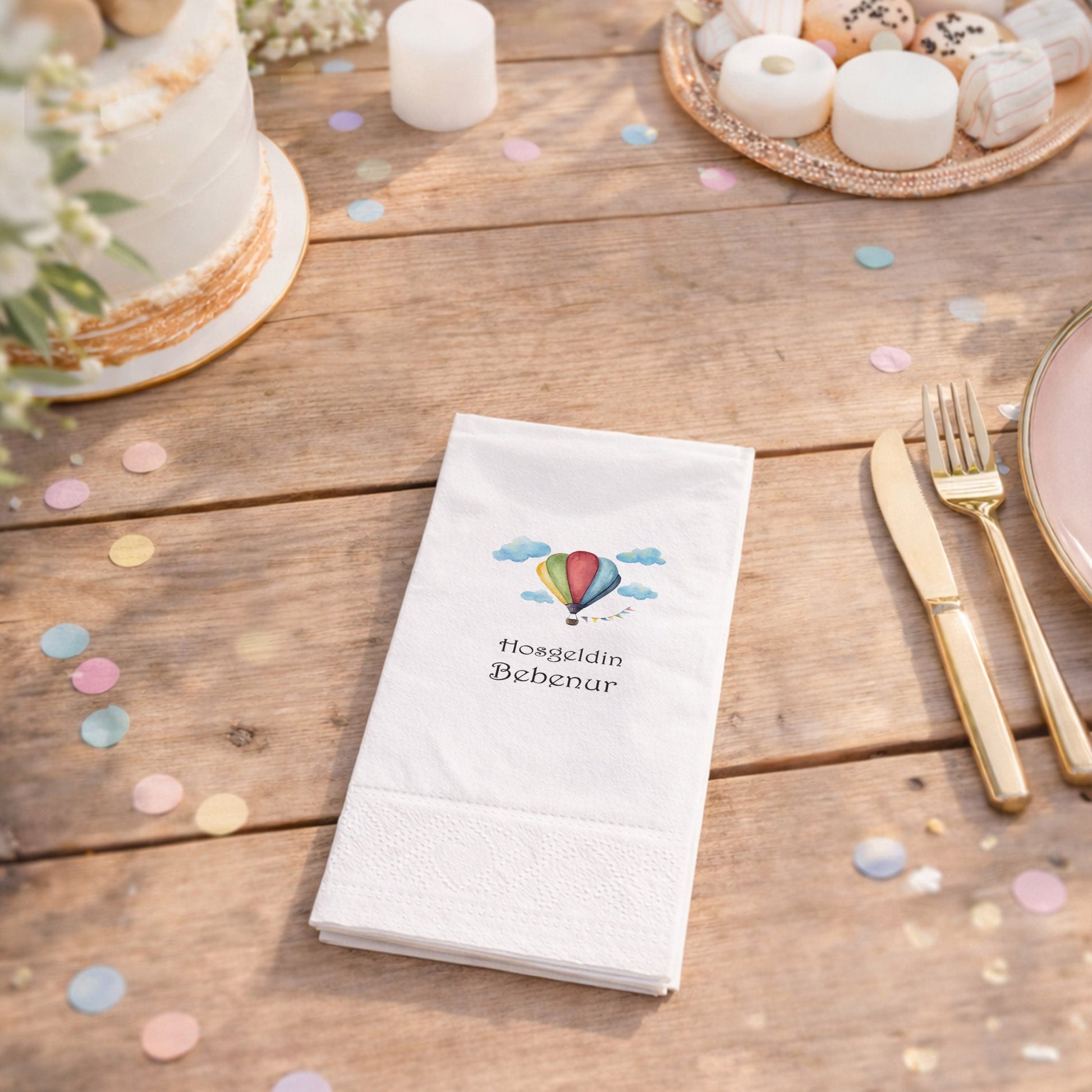 Balonlu Fil Temalı Kişiye Özel Kız Bebek Hoş Geldin Peçetesi
