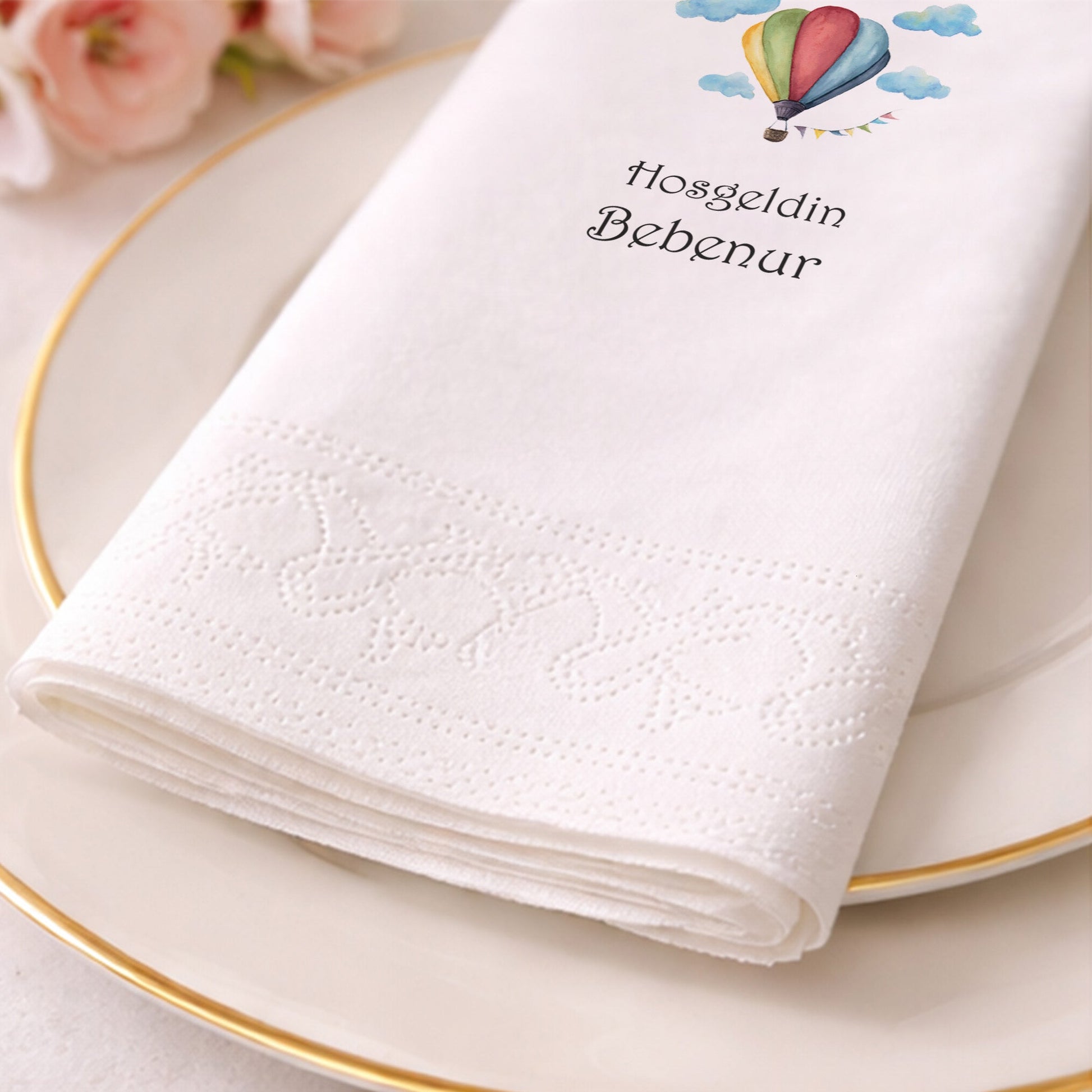 Balon tutan fil figürü ve yumuşak pastel renkleriyle tasarlanan bu peçete, kız bebek yenidoğan ziyareti ve baby shower organizasyonları için zarif ve sevimli bir masa düzeni sunar. Minimal tasarımı sayesinde masa üzerinde sade bir şıklık oluşturur. Kişiye özel isim bilgisi eklenerek hazırlanan ürün, organizasyonu tamamen özgün hale getirir. Çift katlı yapısı sayesinde dayanıklı ve yumuşak bir kullanım sağlar. Gıda temasına uygun baskı teknolojisi kullanılmıştır. Evde yapılan samimi kutlamalar ve özel davetler için ideal bir masa tamamlayıcısıdır.