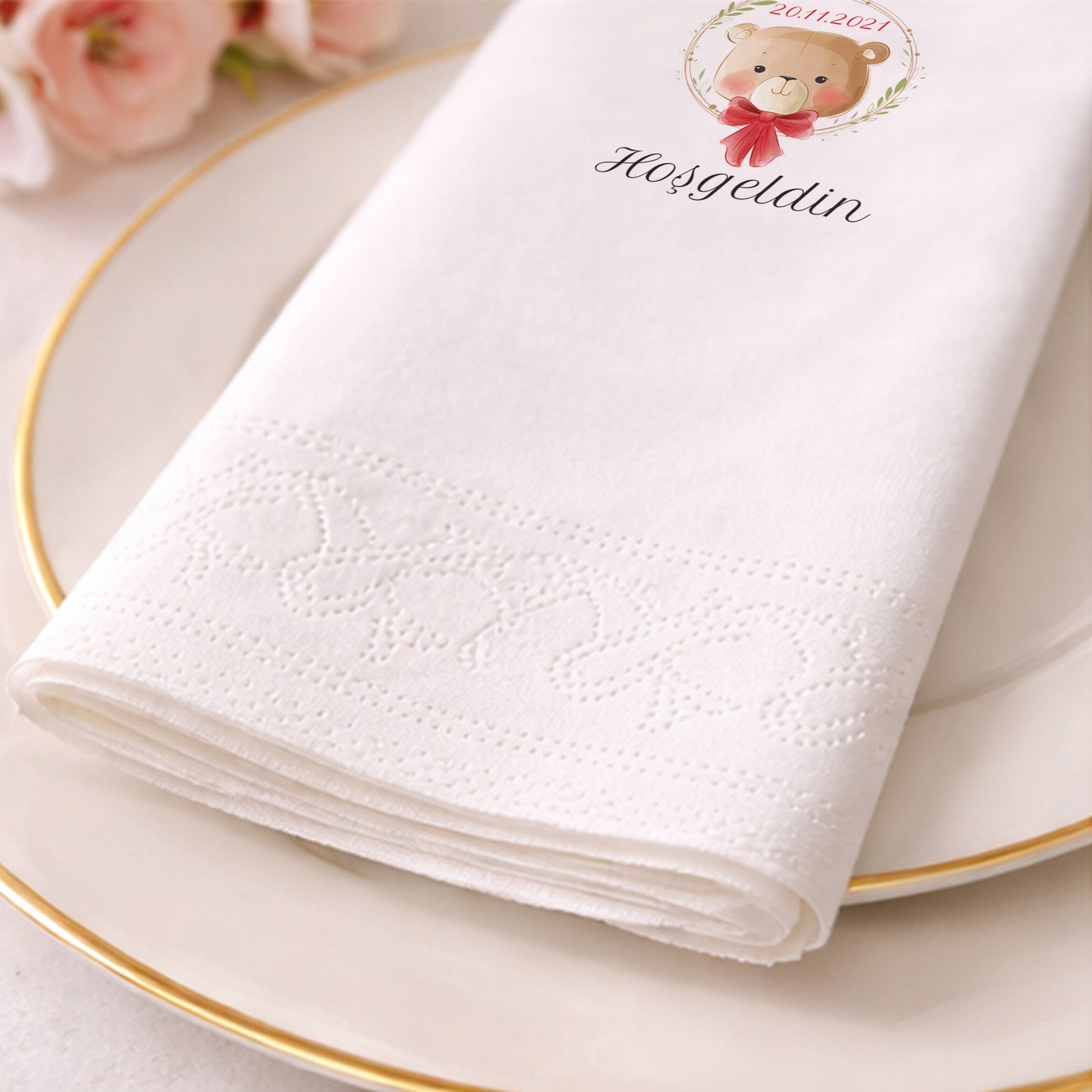 Sıcak bir gülümseme ve kırmızı bir fiyonk ile "Bebecan Hoşgeldin" diyen bu ayıcık temalı peçete, klasik bebek kutlamalarının modern yorumudur. Üzerinde doğum tarihinin yer alabileceği özel alanı ve çiçekli çelenk detayıyla tam bir hatıra ürünü niteliğindedir. Gri zemin üzerindeki soft renkler, her türlü masa dekorasyonuna uyum sağlar. Baby shower, mevlid veya hastane çıkışı kutlamalarında misafirlerinize sunabileceğiniz en şık detaylardan biridir. Emiciliği yüksek ve yumuşak dokulu kağıdı sayesinde kullanım konforu sunar. Sevimli ayıcık illüstrasyonu, masanıza sıcaklık ve samimiyet katar. Özel baskı teknolojisi ile renkler akma yapmaz ve canlılığını korur. Bebeğinizin ilk günlerini kutlarken, bu sevimli ve kaliteli peçetelerle misafirlerinizi en iyi şekilde ağırlayın.