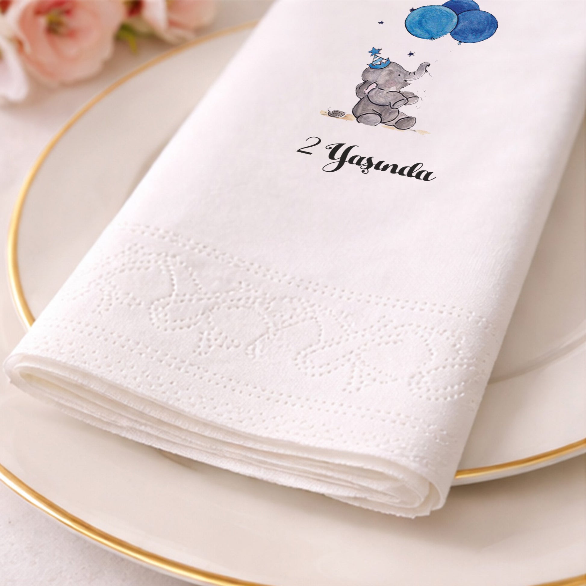 Bebecan'ın ikinci yaş sevincini yansıtan bu tasarım, mavi balonlarıyla gökyüzüne süzülen sevimli bir fil illüstrasyonuna sahip. Siyah arka plan üzerinde parlayan yıldızlar ve canlı mavi tonları, doğum günü masanıza enerjik bir hava katar. "2 Yaşında" ibaresiyle bu önemli dönüm noktasını kutlayan ürün, özellikle erkek çocuk partileri için en çok tercih edilen modeller arasındadır. Kaliteli baskısı sayesinde renkler canlılığını korurken, yumuşak dokusu misafirlerinize konforlu bir kullanım sunar. Filin masumluğunu ve balonların neşesini bir araya getiren bu peçete, doğum günü pastası sunumunda harika bir eşlikçi olacaktır. Bebeğinizin büyüme yolculuğundaki bu özel adımı, en sevilen figürlerle süslenmiş bir masa düzeniyle kutlamak için bu şık ve eğlenceli tasarımı tercih edebilirsiniz.