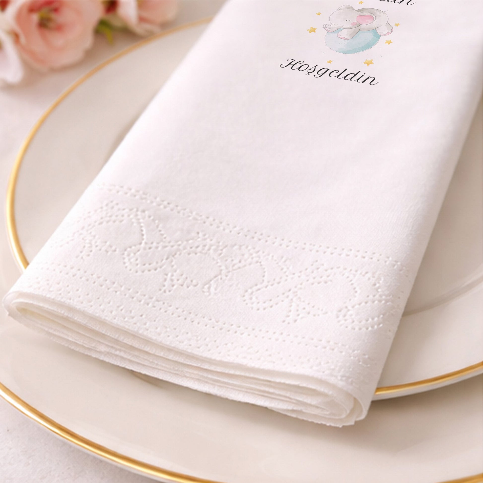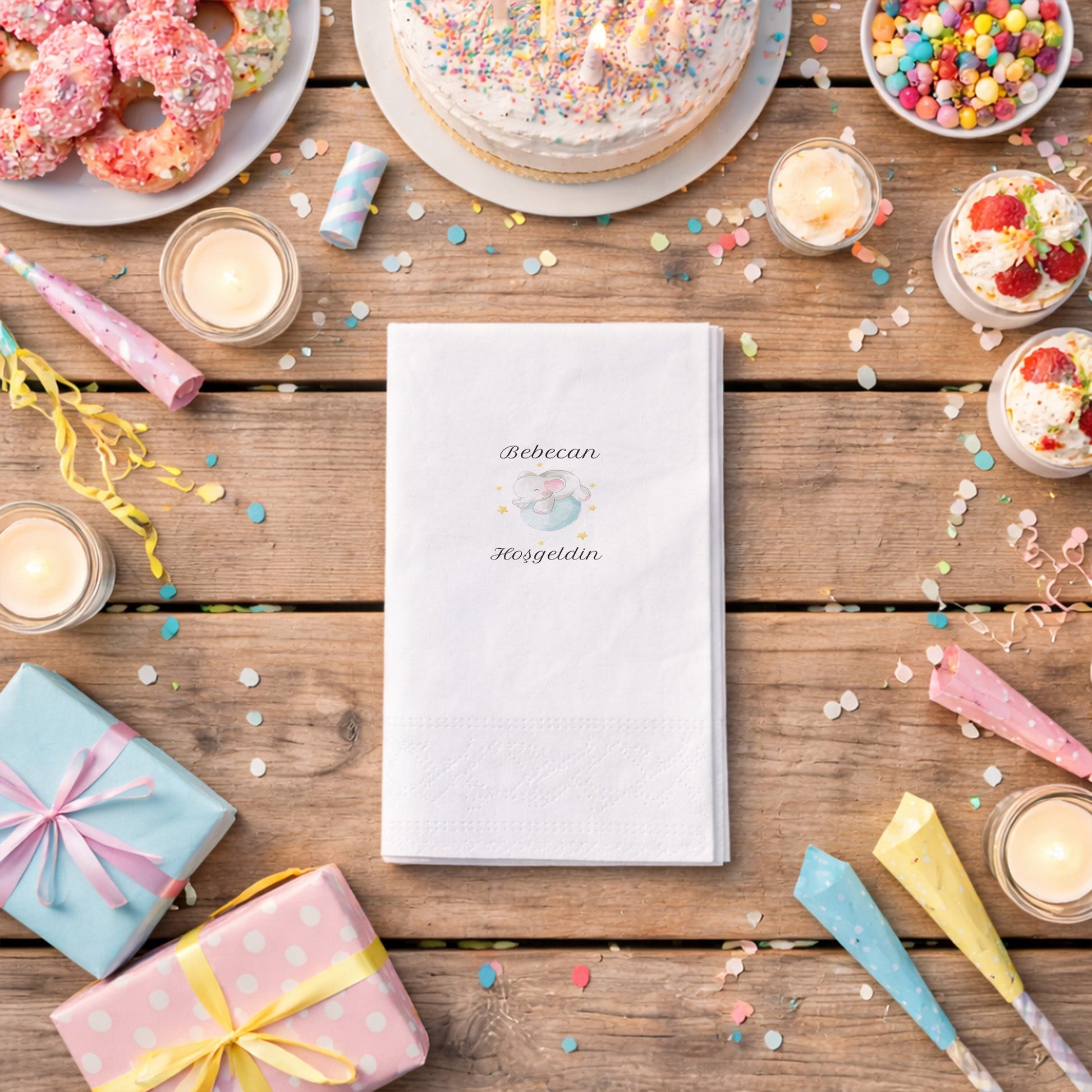 Gökyüzü temalı bu özel peçete, "Bebecan Hoşgeldin" mesajı ve yıldızlarla çevrili uyuyan fil figürüyle kalpleri eritiyor. Siyah zemin üzerine yerleştirilen bu sevimli grafik, gece gökyüzünün büyüleyici etkisini masanıza yansıtır. Hastane odası süslemelerinde veya yenidoğan kutlama yemeklerinde fark yaratmak isteyenler için tasarlanmıştır. Yüksek kaliteli baskı tekniği ile yıldızlar ve ay dede figürü tüm netliğiyle görünür. Peçetenin dokusu cildinize zarar vermeyecek kadar yumuşak, ikramlarınızı taşıyacak kadar dayanıklıdır. Bebek hediyelikleri ve süslemeleriyle uyum içerisinde olan bu parça, modern ebeveynlerin ilk tercihi arasındadır. Partinize masalsı bir derinlik katmak ve misafirlerinize unutulmaz bir deneyim yaşatmak için bu tasarımı tercih edebilirsiniz. Şıklığın ve sevimliliğin buluştuğu bu ürünle ilk adımlarınızı kutlayın.