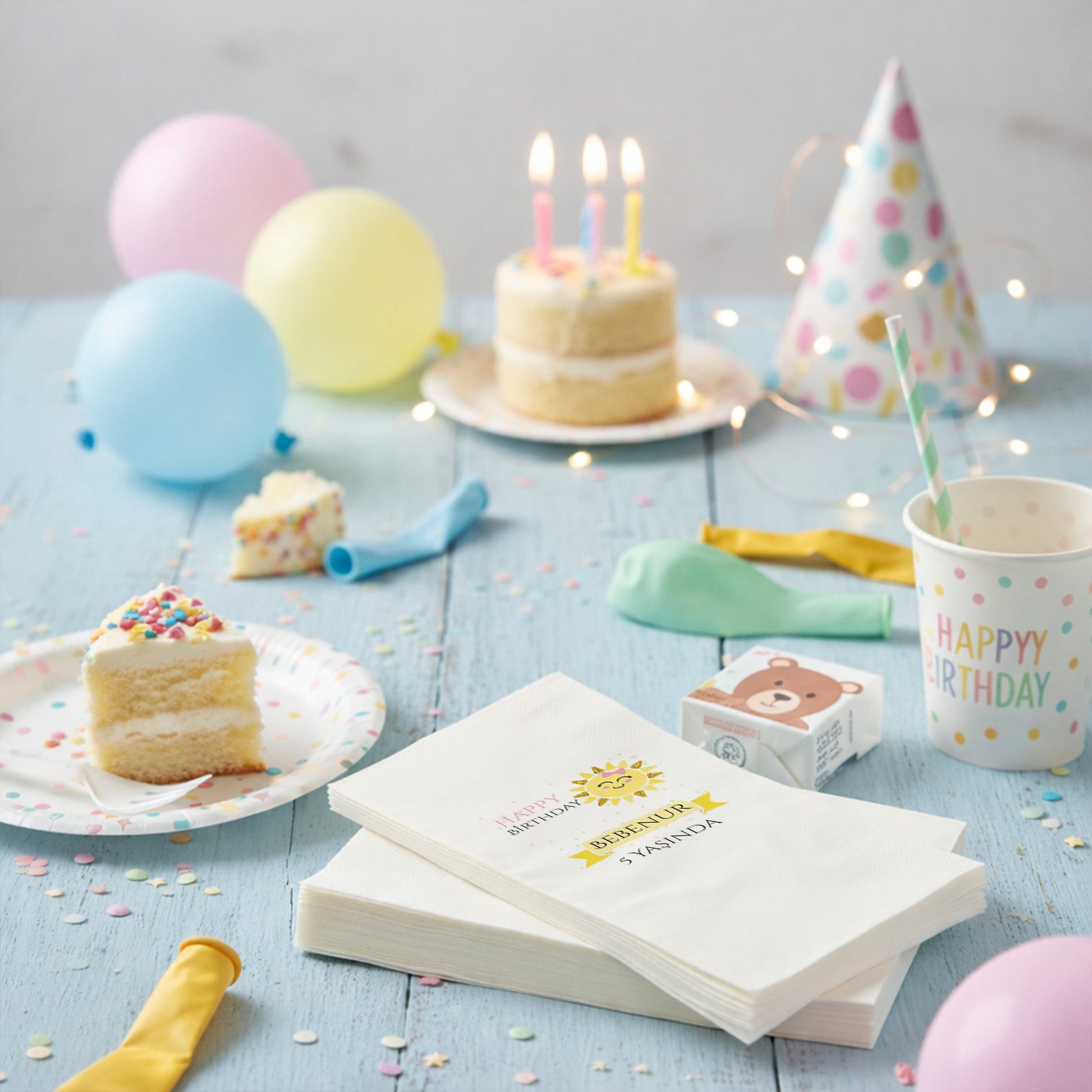Enerji dolu ve neşeli bir kutlama için tasarlanan bu peçete, parıltılı gülen güneş figürüyle sofralara ışık saçar. Bebenur’un 5. yaş günü için hazırlanan bu sarı ve siyah kontrastlı tasarım, modern ve canlı bir görünüm sunar. Yıldızlarla süslenmiş arka planı ve şık isim bandıyla partinizin temasını güçlendirir. Çocukların enerjisini yansıtan bu tasarım, her yaş grubundan davetlinin ilgisini çekecek estetik detaylara sahiptir. Yumuşak dokusu ve sağlam yapısı sayesinde pratik bir kullanım sunarken, görsel olarak masalarınızı zenginleştirir. Özel baskı tekniği ile renkler canlılığını korur ve kutlamanız boyunca şıklığından ödün vermez.