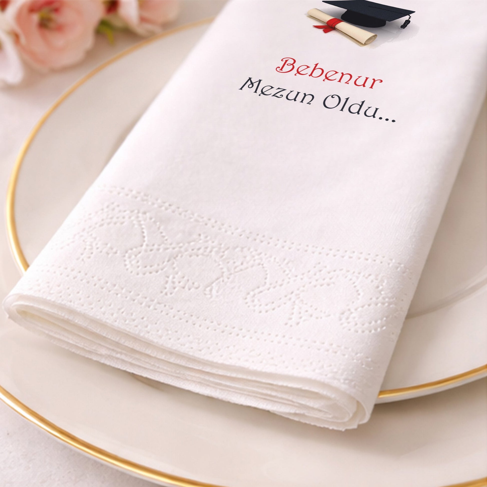 Eğitim hayatının en önemli dönüm noktalarından biri olan mezuniyet törenleri için tasarlanan bu peçete, siyah zemin üzerine kep ve diploma figürleriyle asil bir duruş sergiler. "Bebenur Mezun Oldu" yazısıyla kişiselleştirilen tasarım, kutlama sofralarına resmi ve gurur verici bir atmosfer katar. Yüksek emicilik gücü ve şık görsel sunumuyla mezuniyet partilerinin vazgeçilmez bir parçasıdır. Modern yazı tipi ve kontrast renkleriyle masalarda dikkat çekici bir odak noktası oluşturur. Mezuniyet balosu veya aile içi küçük kutlamalar için mükemmel olan bu ürün, bu özel başarıyı taçlandırmak için üretilmiştir. Hem estetik hem de dayanıklı yapısıyla kaliteyi sofralarınıza taşır.