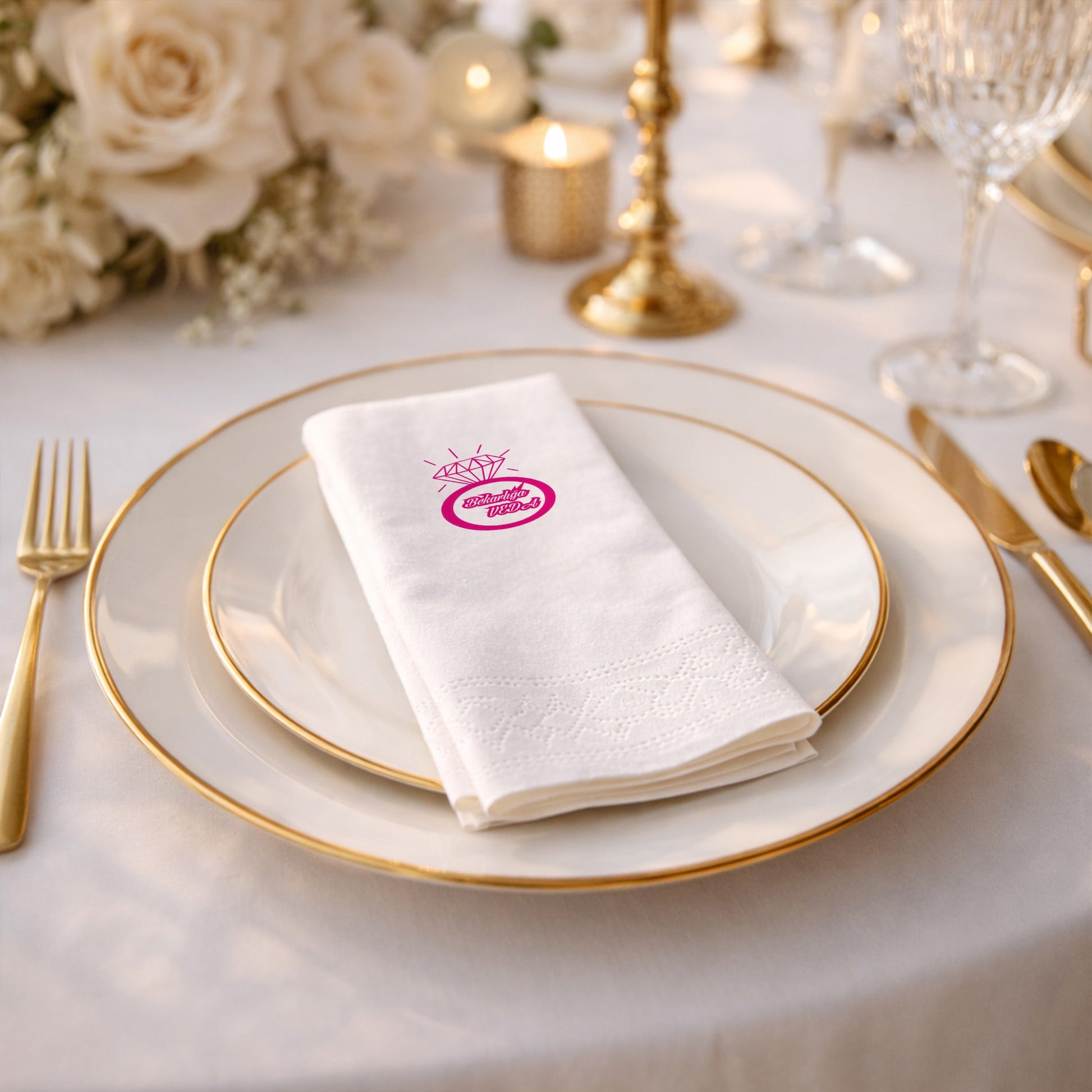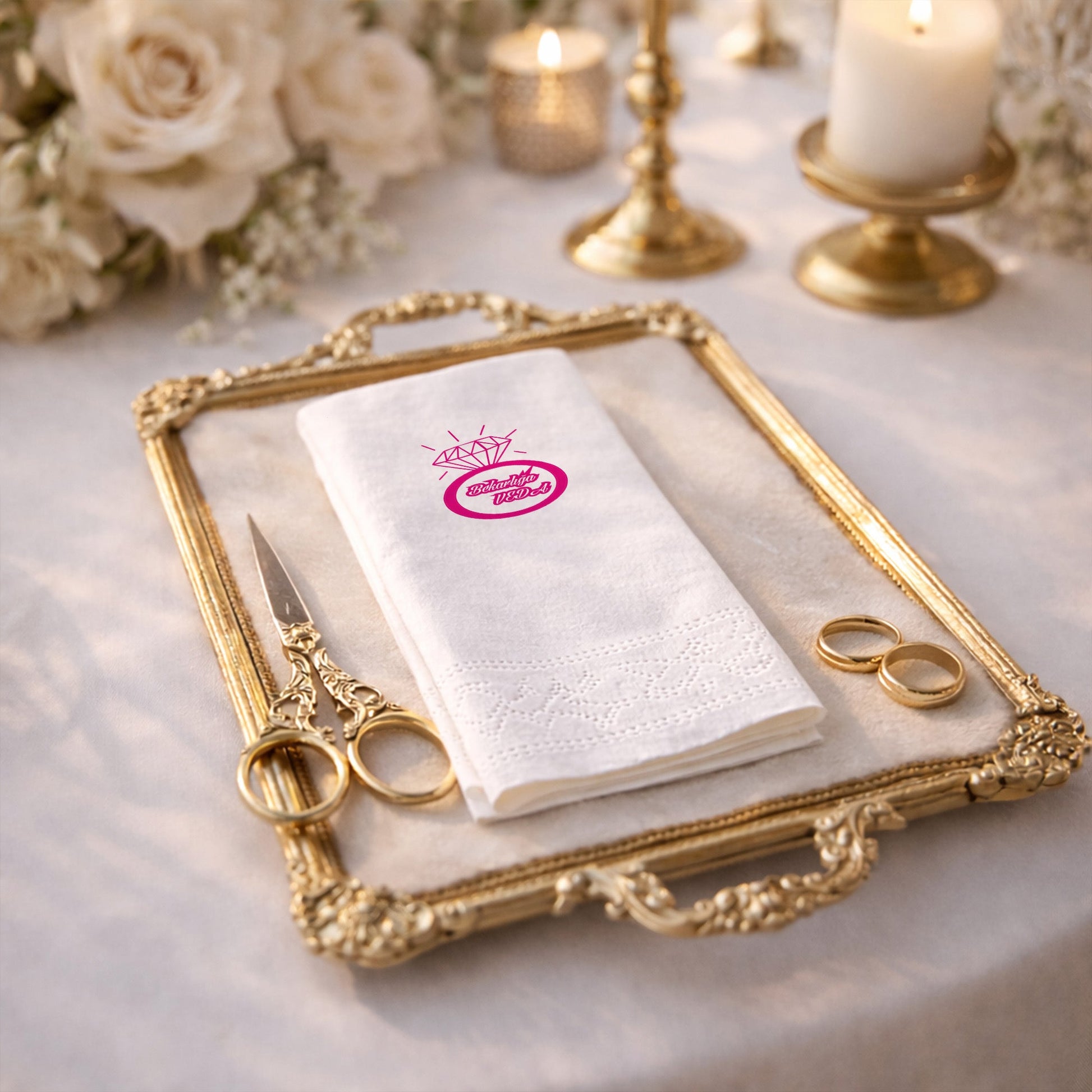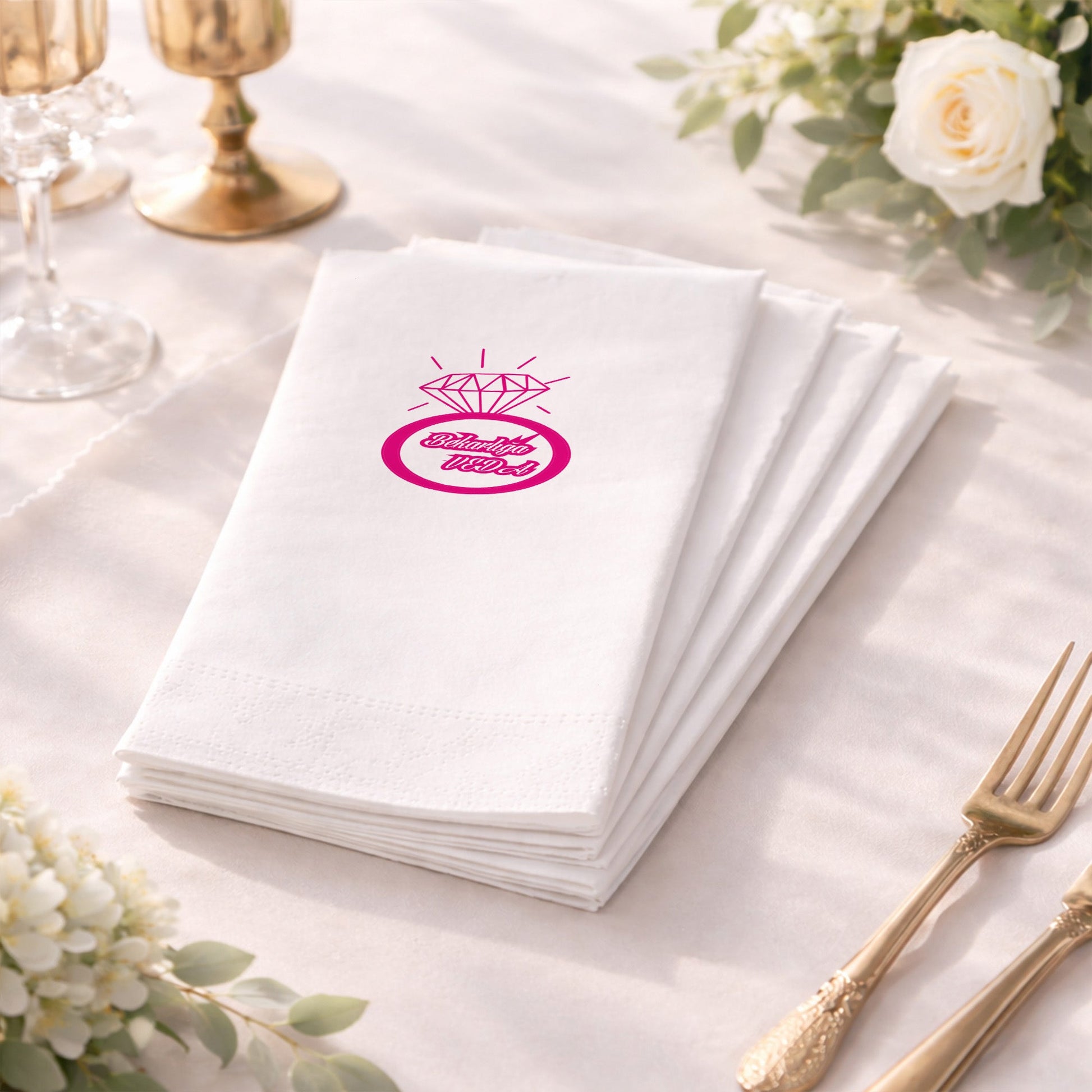 Yüzük figürüyle tasarlanan bu baskılı peçete, bekarlığa veda ve kına gecesi organizasyonlarına modern bir şıklık kazandırır. Bekarlığa Veda yazısı ve kişiye özel isim alanı sayesinde özel gün peçetesi olarak güçlü bir anlam taşır. Organizasyon peçetesi olarak masa düzenini tamamlayan bu tasarım, eğlenceli ama zarif bir duruş sergiler. Kına peçetesi olarak gelinin özel gecesini vurgular. Baskılı peçete kalitesi yüksek olup çizgiler net ve okunaklıdır. Modern konseptli organizasyonlar için profesyonel ve güven veren bir alternatiftir.