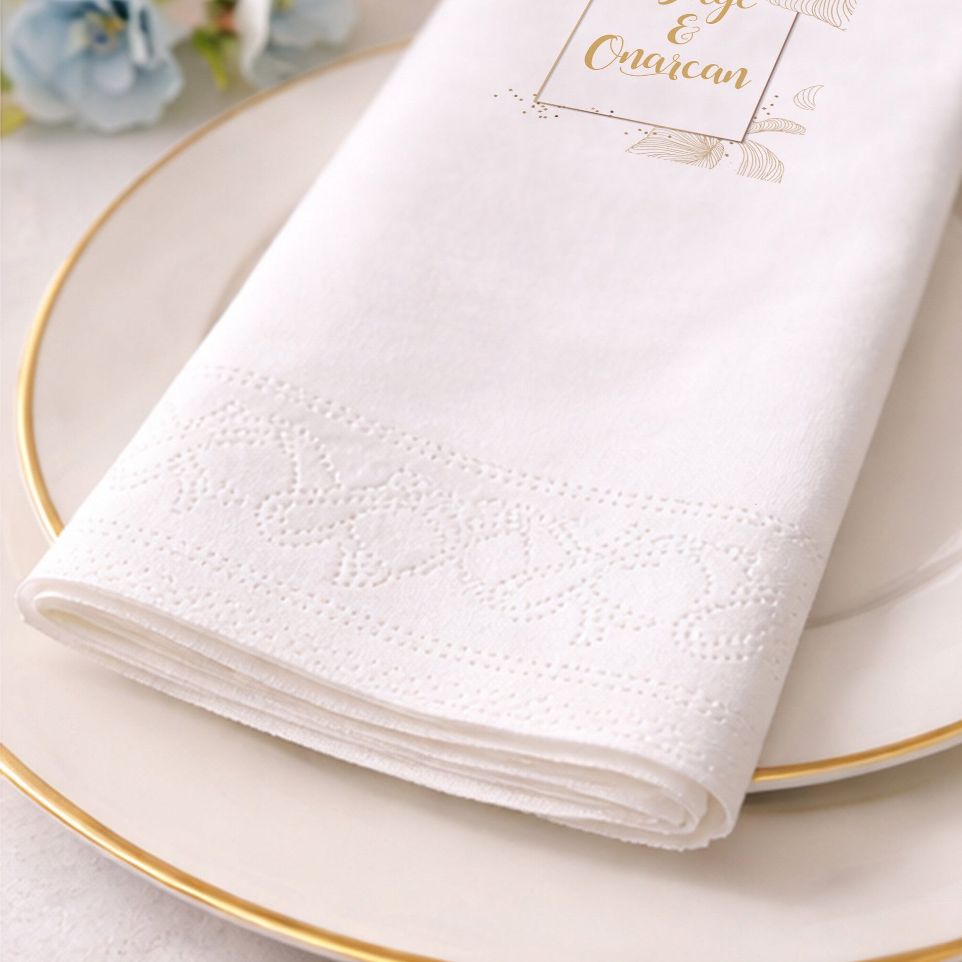 Bilge ve Onurcan için tasarlanan gold detaylı baskılı peçete, düğün ve nişan organizasyonlarına sofistike bir dokunuş kazandırır. İnce altın tonları ve modern çerçeve detayı, masa dekorasyonunda zarafet ve bütünlük sağlar. Özel gün peçetesi olarak davetin genel konseptiyle uyum içinde, lüks ama sade bir görünüm sunar. Organizasyon peçetesi tercih eden çiftler için prestijli bir seçenektir. Baskılı peçete tasarımı, davetliler için estetik bir hatıra niteliği taşır. Düğün peçetesi ve nişan peçetesi olarak kullanılabilir, özel günlerde ince zevki ve özeni yansıtır.