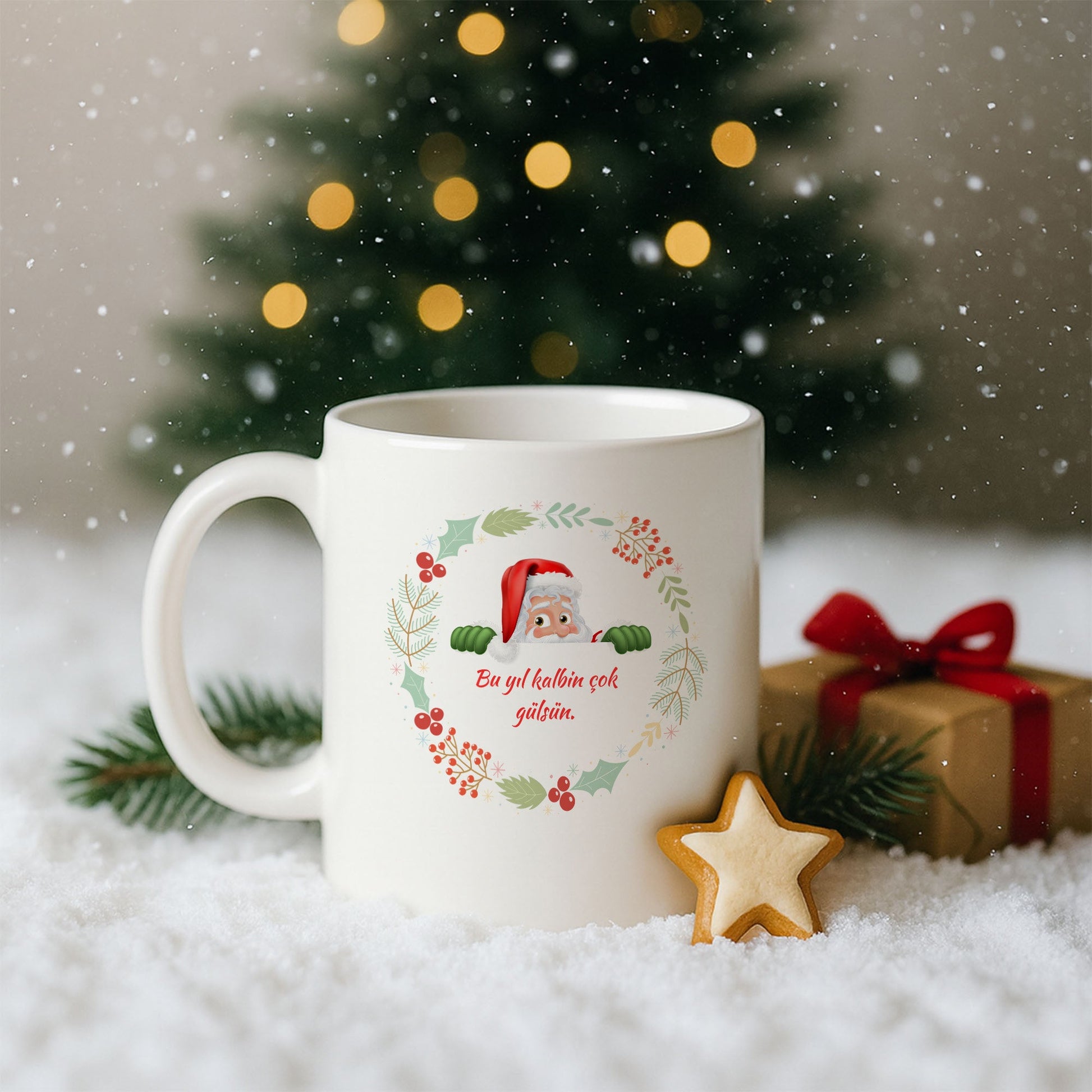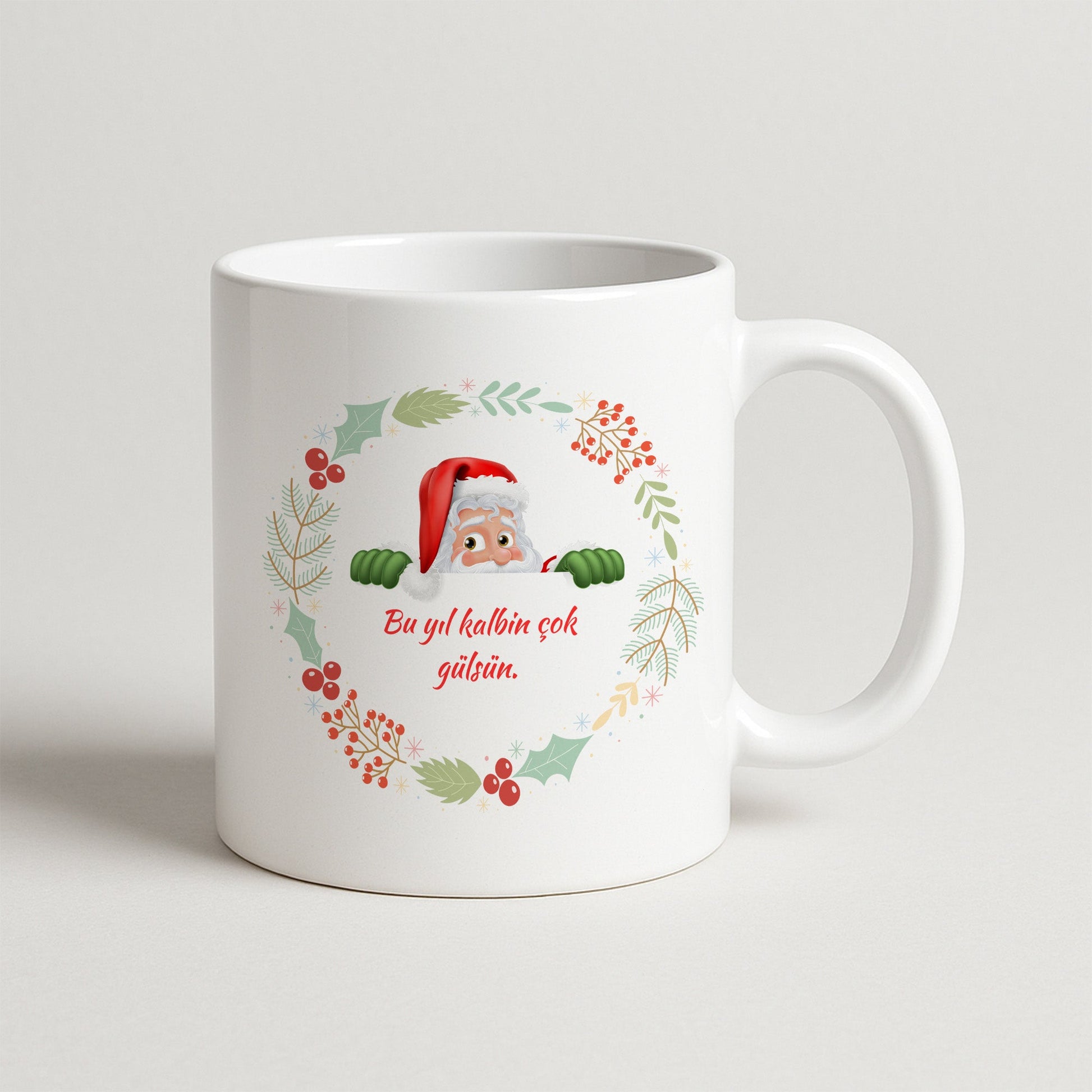 Bu özel tasarım kupa, yeni yılın umut dolu ve içten duygularını sade bir mesajla buluşturur. Çelenk detayları arasından bakan Noel Baba figürü, tasarıma sıcak ve samimi bir hava katarken, ortadaki “Bu yıl kalbin çok gülsün.” yazısı hediyeyi daha da anlamlı hâle getirir.