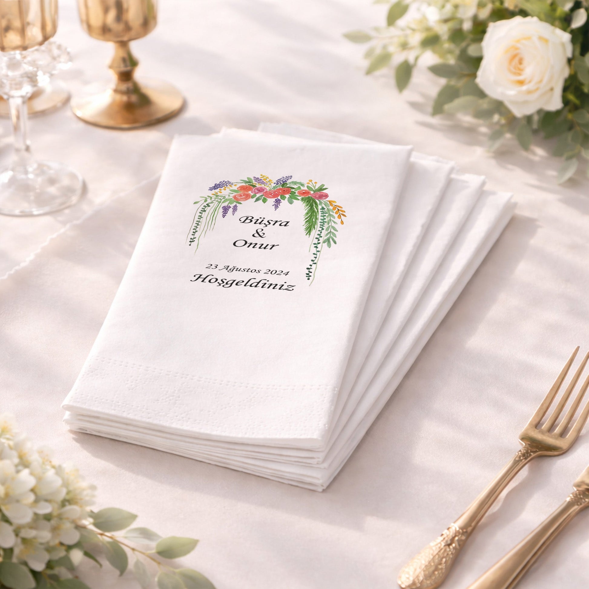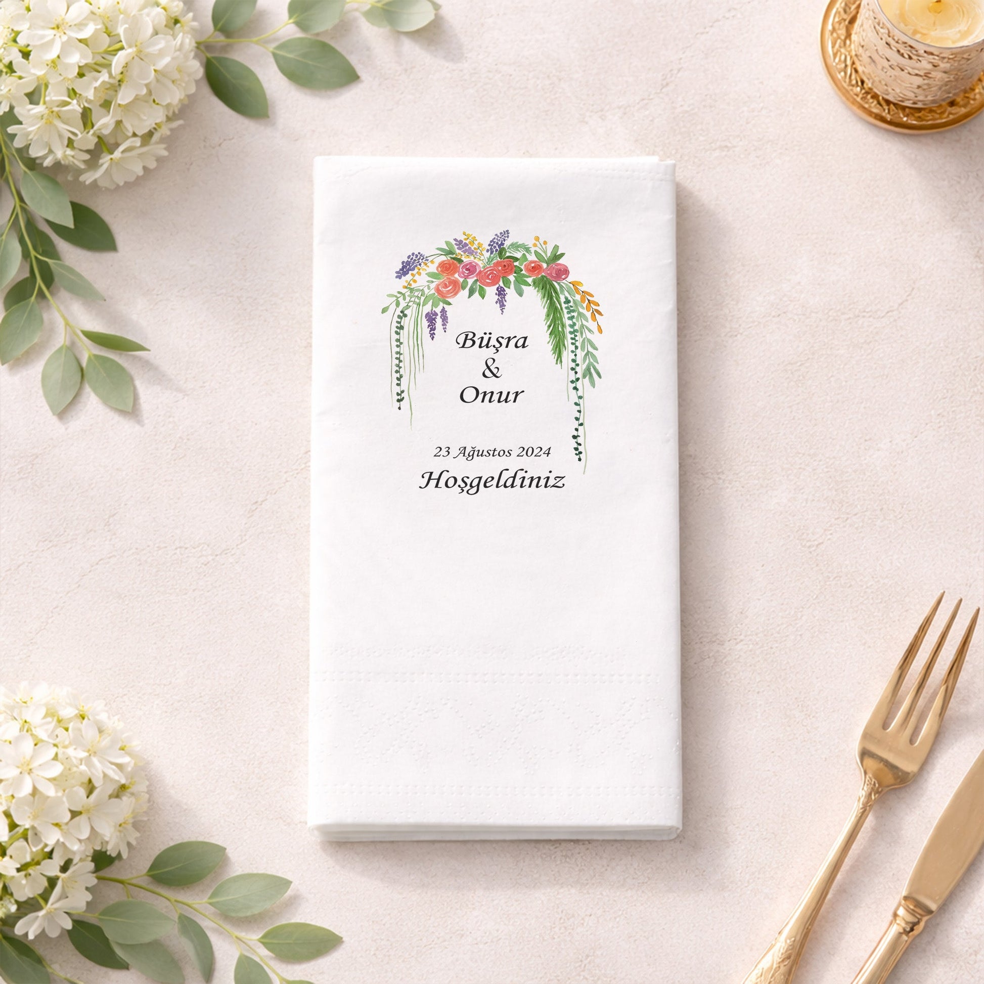 Doğanın soft renklerini masalarınıza taşıyan bu baskılı düğün peçetesi, pastel tonlardaki çiçek buketi illüstrasyonu ile huzurlu bir hava yaratır. Yaz düğünleri ve bahçe konseptli organizasyonlar için mükemmel bir seçim olan bu tasarım, ferah bir masa düzeni sağlar. İsimlerinizin ve özel tarihinizin yer aldığı baskı, davetinizin kişiselliğini vurgular. Yüksek kaliteli kağıt yapısı, yumuşak dokunuşuyla misafirlerinizden tam not alır. "Hoşgeldiniz" mesajı ile sıcak bir karşılama sunan bu peçeteler, sunum tabaklarınızın yanında estetik bir tamamlayıcıdır. Her detayı özenle düşünülmüş bu ürün, organizasyonunuzun genel temasıyla bütünlük sağlar. Dayanıklı yapısı sayesinde servis boyunca formunu korur. Romantik ve sade bir şıklık arayan çiftler için özel olarak üretilen bu model, en özel gününüzün unutulmaz bir parçası olacaktır.