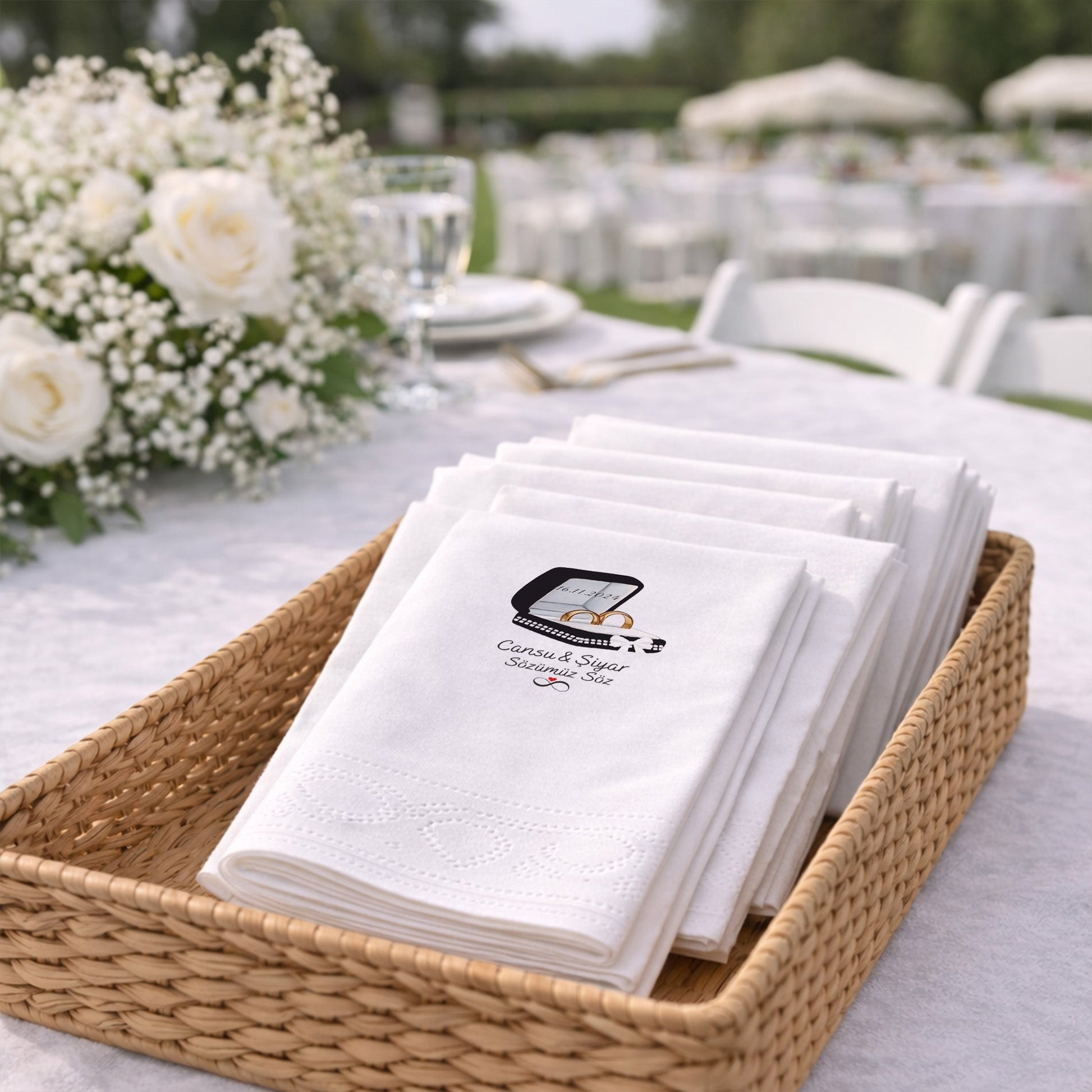 Cansu ve Şiyar için hazırlanan söz hatırası temalı baskılı peçete, özel anları zarif bir şekilde yansıtır. Yüzük illüstrasyonu ve anlamlı metin detayı, söz ve nişan organizasyonlarına romantik bir hava katar. Özel gün peçetesi olarak masa düzeninde şıklık ve duyguyu bir arada sunar. Organizasyon peçetesi arayan çiftler için hem nişan peçetesi hem de düğün peçetesi olarak kullanılabilecek çok yönlü bir üründür. Baskılı peçete, davetlilere hatıra değeri taşırken organizasyonun bütüncül ve özenli görünmesini sağlar.