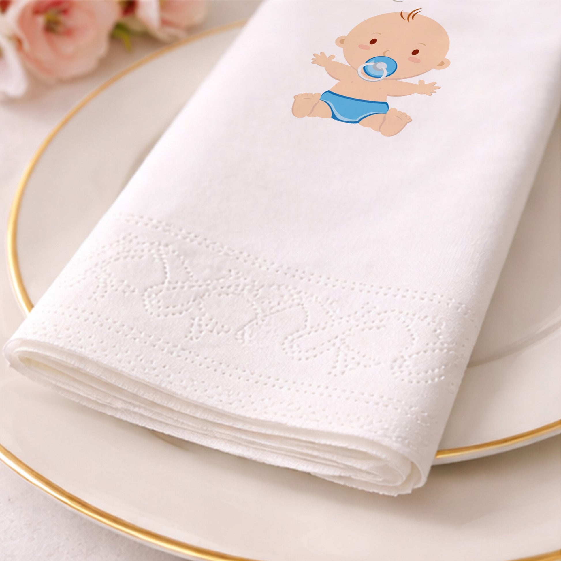 Cenk bebeğin ilk yaşına özel olarak tasarlanan bu mavi bulut temalı peçete, masumiyeti ve neşeyi temsil eder. Mavi bir bulutun içinde yer alan "1 Yaşında" ibaresi ve gülen bebek illüstrasyonu ile doğum günü masalarınızda masalsı bir hava yaratır. Yumuşak geçişli renkleri ve şık fontuyla dikkat çeken bu ürün, isme özel baskısıyla kişisel bir dokunuş kazandırır. Yüksek emiciliğe sahip kağıt kalitesi hem estetik hem de fonksiyonel bir kullanım sunar. Erkek bebek konseptlerine tam uyum sağlayan bu tasarım, kutlamanızın temasını güçlendirir. Cenk’in bu özel gününde sofranızdaki her detayın kusursuz olmasını sağlayacak bu peçeteler, kaliteli baskısıyla uzun süre kalıcı bir hatıra olarak saklanabilir.