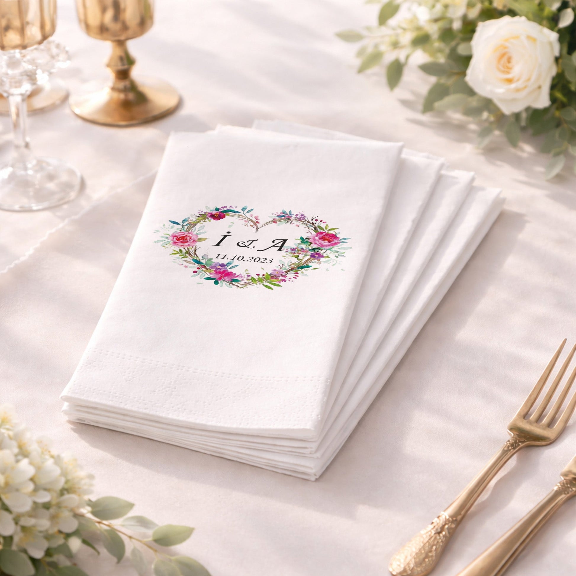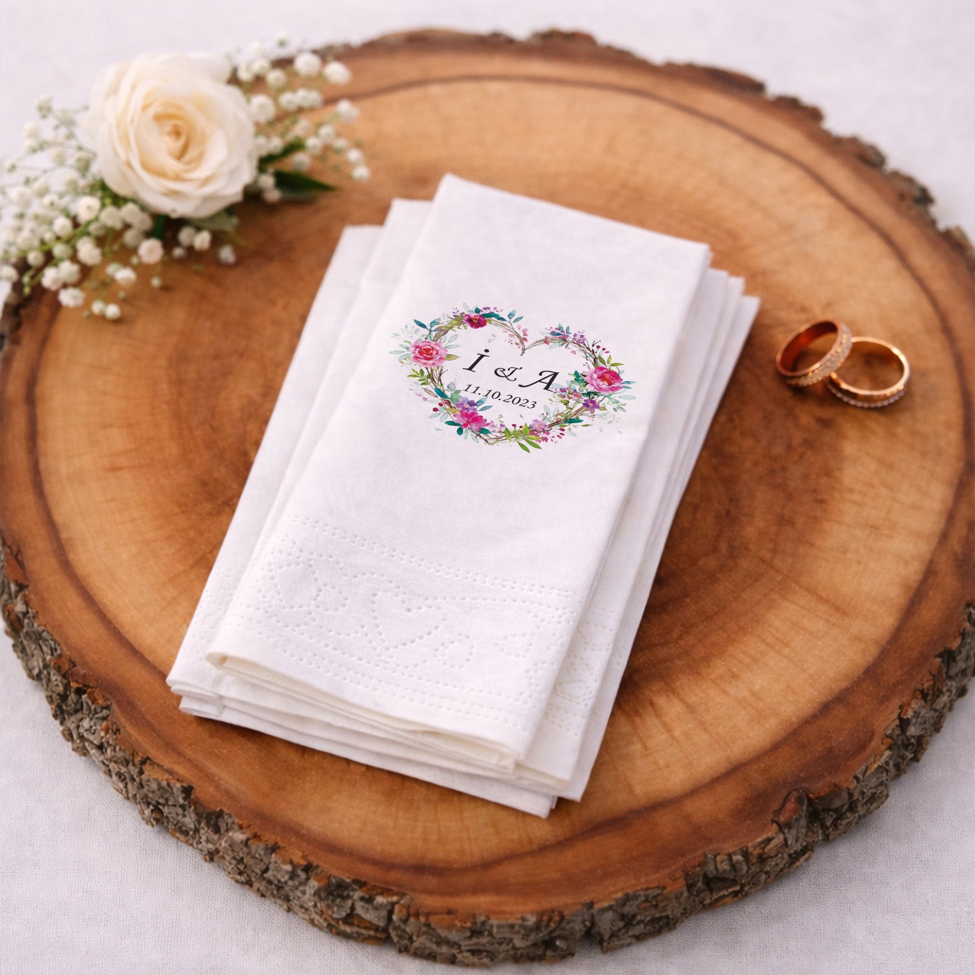 Çiçek Kalp Çerçeveli İsimli Nişan ve Düğün Baskılı Peçete