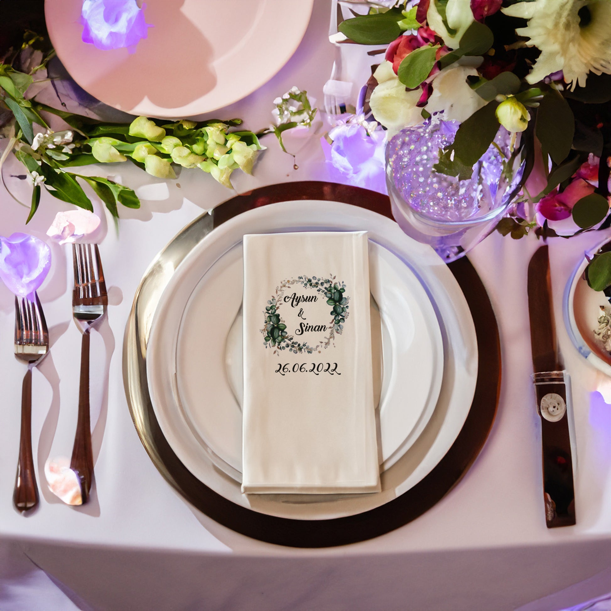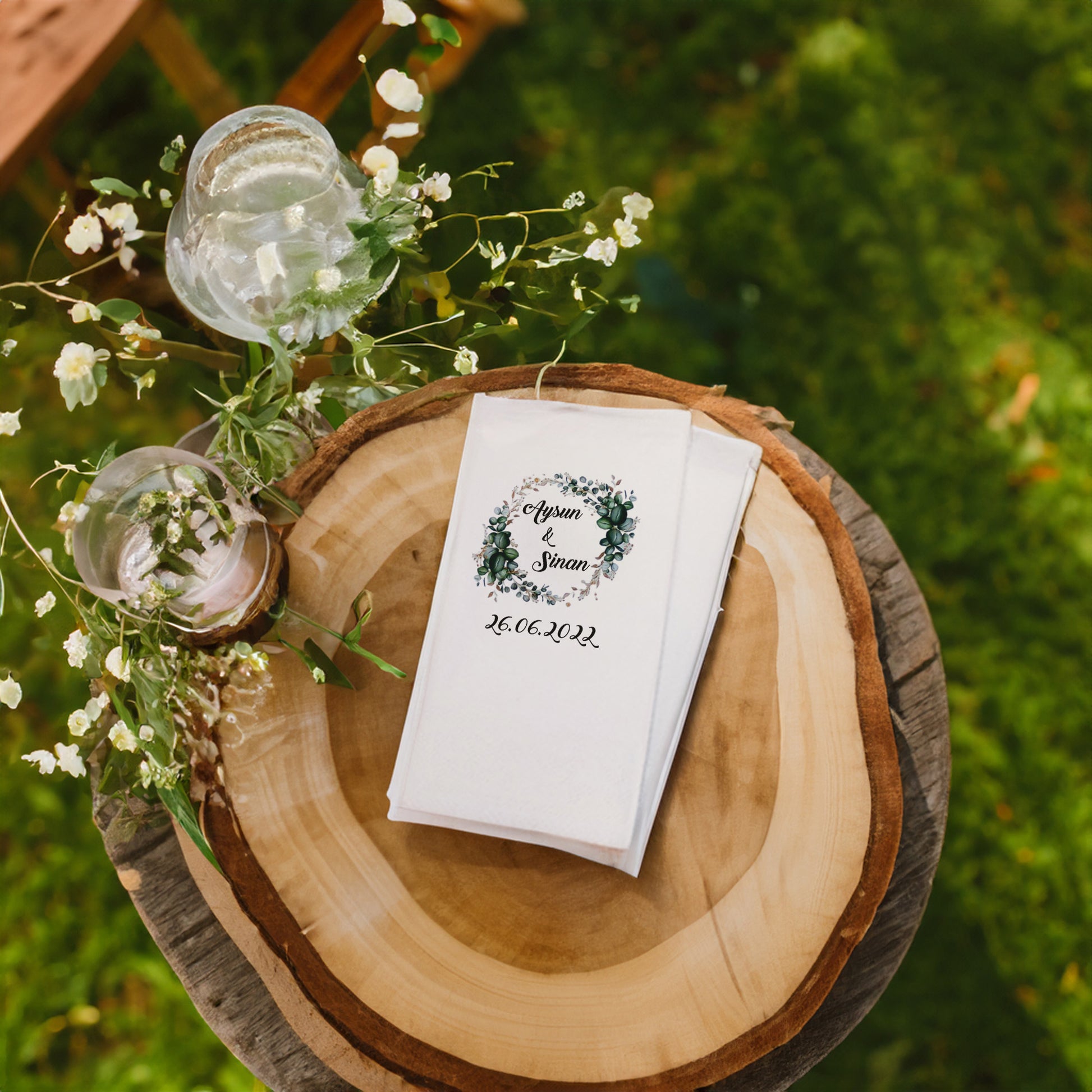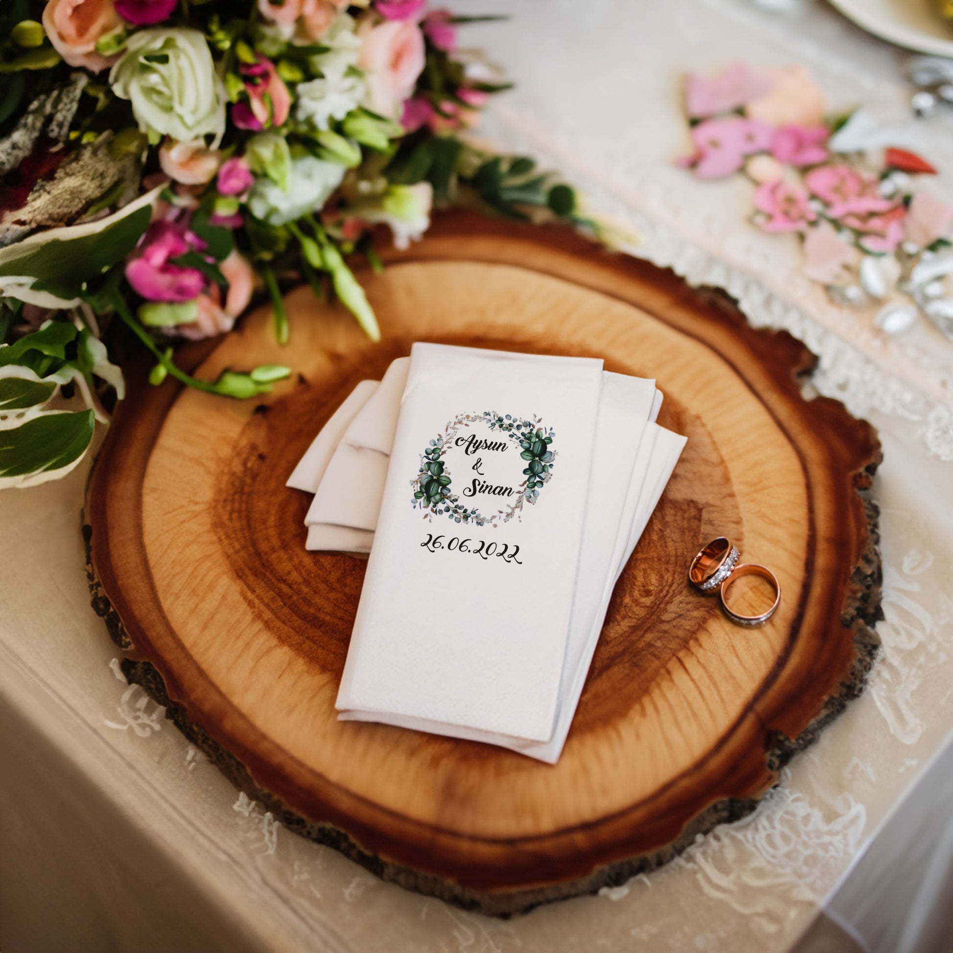 Özel günlerinizi unutulmaz kılacak zarif bir dokunuş: Yuvarlak Yaprak Çerçeveli Düğün, Nişan, Söz ve Kına Peçetesi Seti!