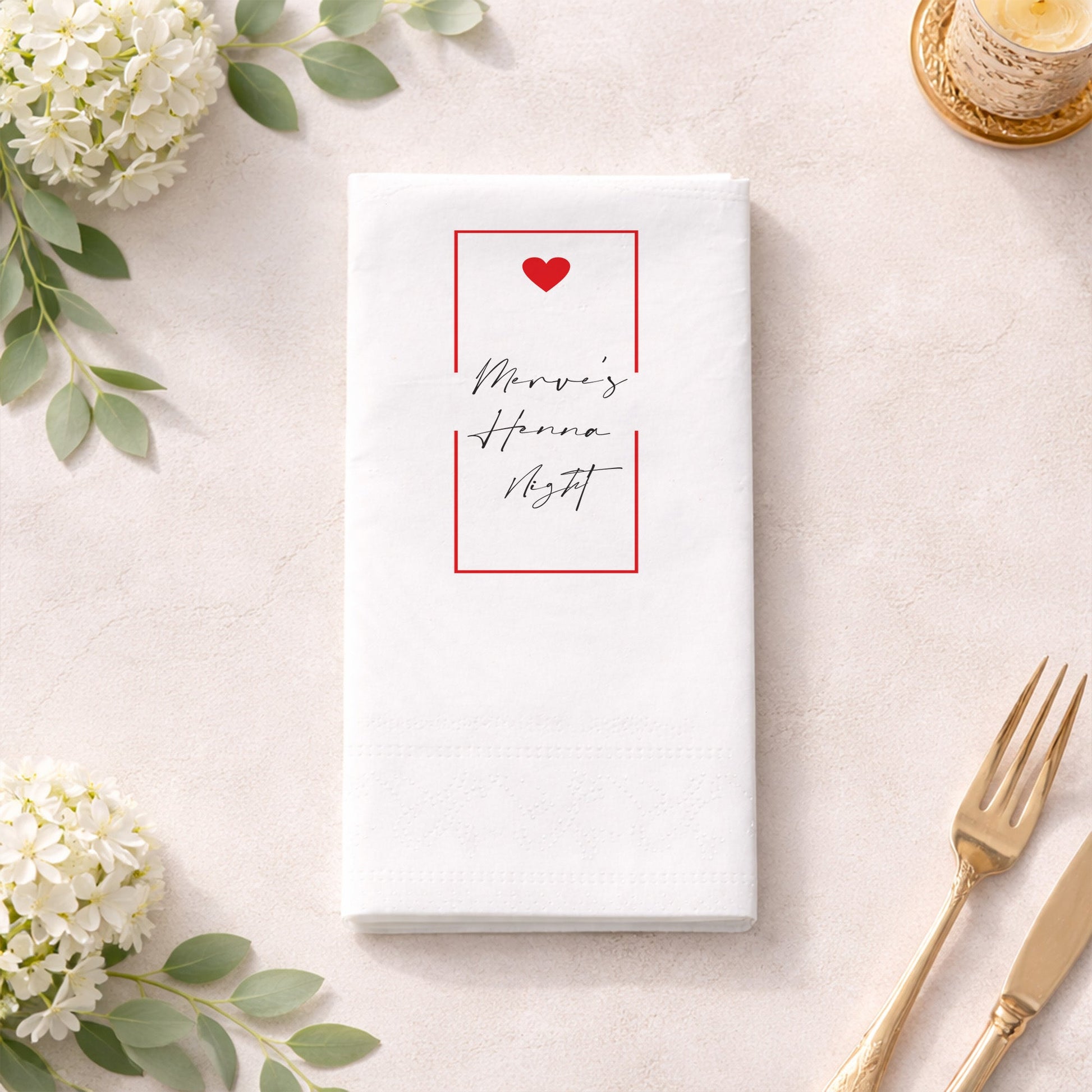 Düğün peçetesi olarak kullanıldığında, özellikle modern düğünler, nikah sonrası yemekler, sade masa düzenleri ve after party organizasyonları için ideal bir tamamlayıcıdır. Kırmızı çerçeve detayı sayesinde masa üzerinde güçlü bir kontrast oluşturur ve davetlilerin dikkatini çeker. Gelin ve damadın isimleriyle kişiselleştirilen tasarım, organizasyona özgün bir kimlik kazandırır.