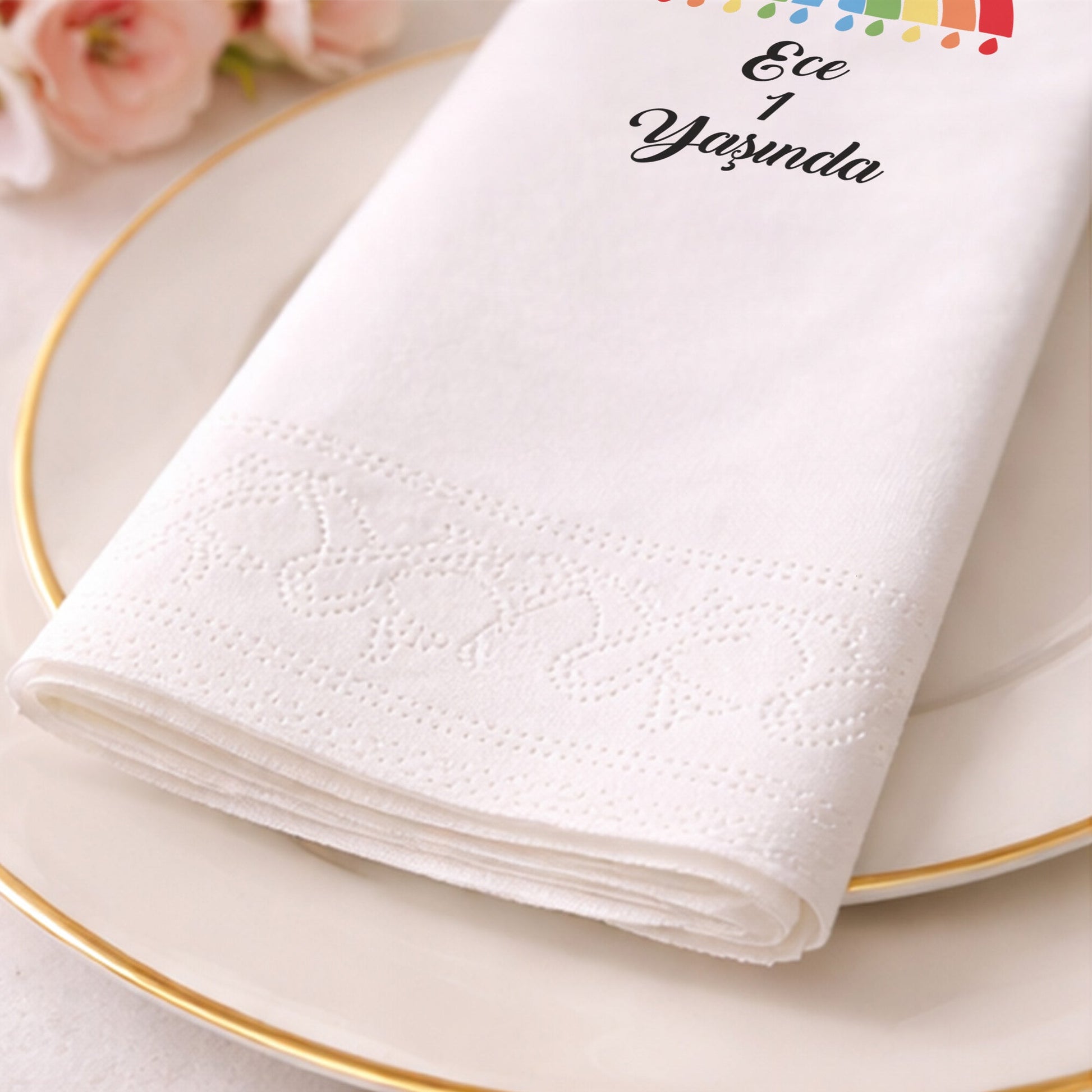 Ece’nin ilk yaşına özel hazırlanan bu tasarım, pastel gökkuşağının altından süzülen renkli damlalarla huzurlu bir hava estiriyor. Siyah zemin üzerine uygulanan canlı renkler, modern bir sanatsal dokunuş hissi verir. Sade ama etkileyici bir masa düzeni oluşturmak isteyenler için birebirdir. Yumuşak dokusu ve dayanıklı yapısı sayesinde hem pratik bir kullanım sunar hem de görsel bir aksesuar görevi görür. Ece ismiyle özelleştirilen bu ürün, doğum günü hatıralarınızda zarif bir yer tutacak. Yenidoğan veya diş buğdayı organizasyonlarında da sıklıkla tercih edilen bu stil, partinizin zarafetini tamamlayan en önemli unsurlardan biri olur.