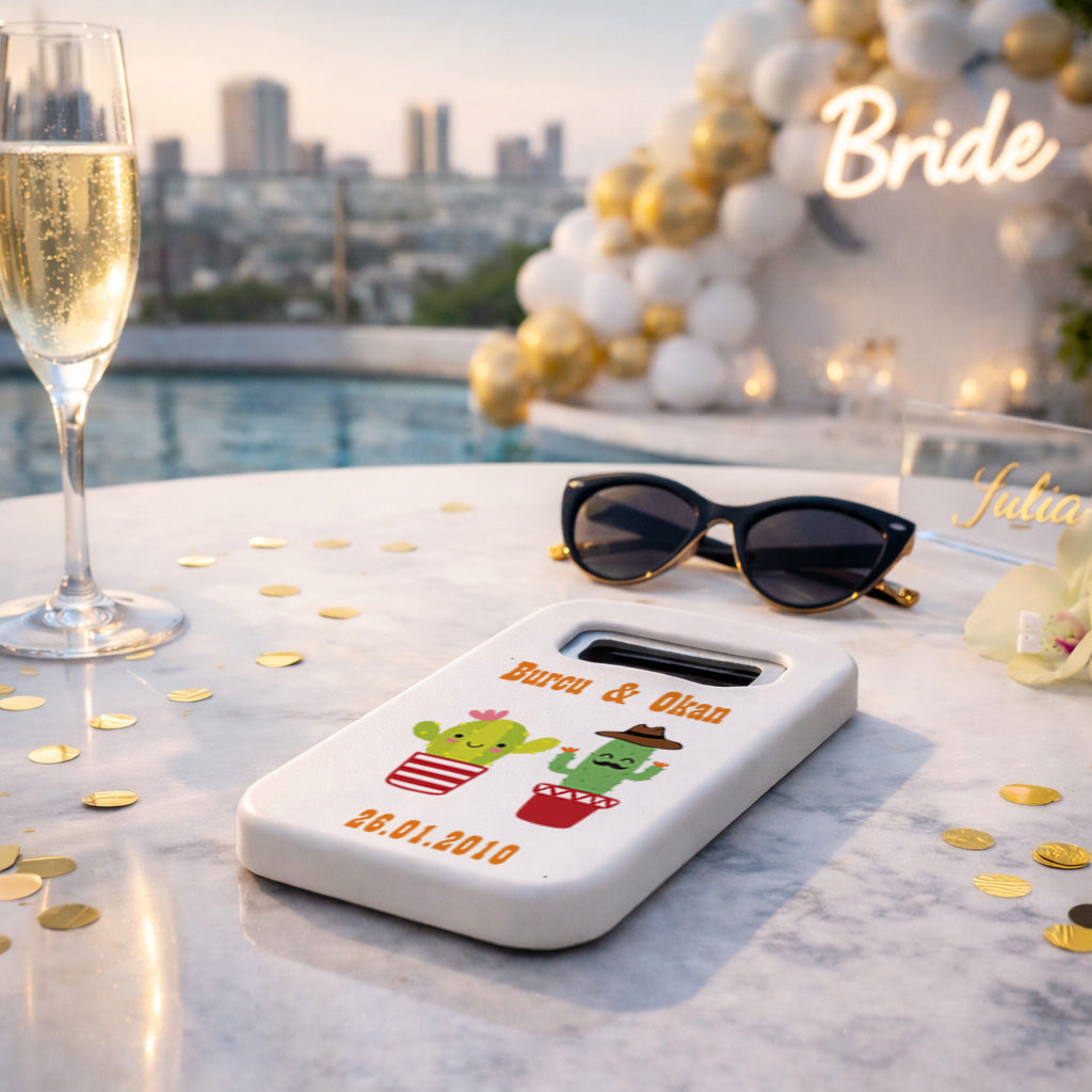 Eğlenceli ve farklı tasarımları seven çiftler için hazırlanan bu kaktüs temalı magnet açacak, sevimli detayları ile özel günlerinize neşe katar. Karakterli kaktüs figürleri ve kişiye özel isim tasarımı ile klasik düğün konseptlerinden farklı, samimi ve enerjik bir hatıra sunar.