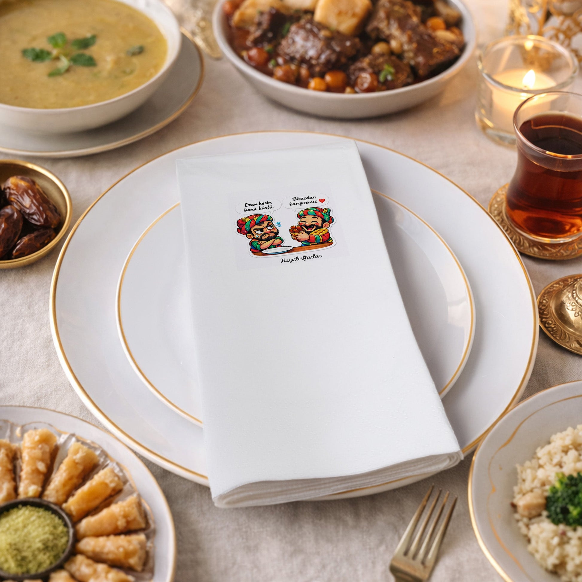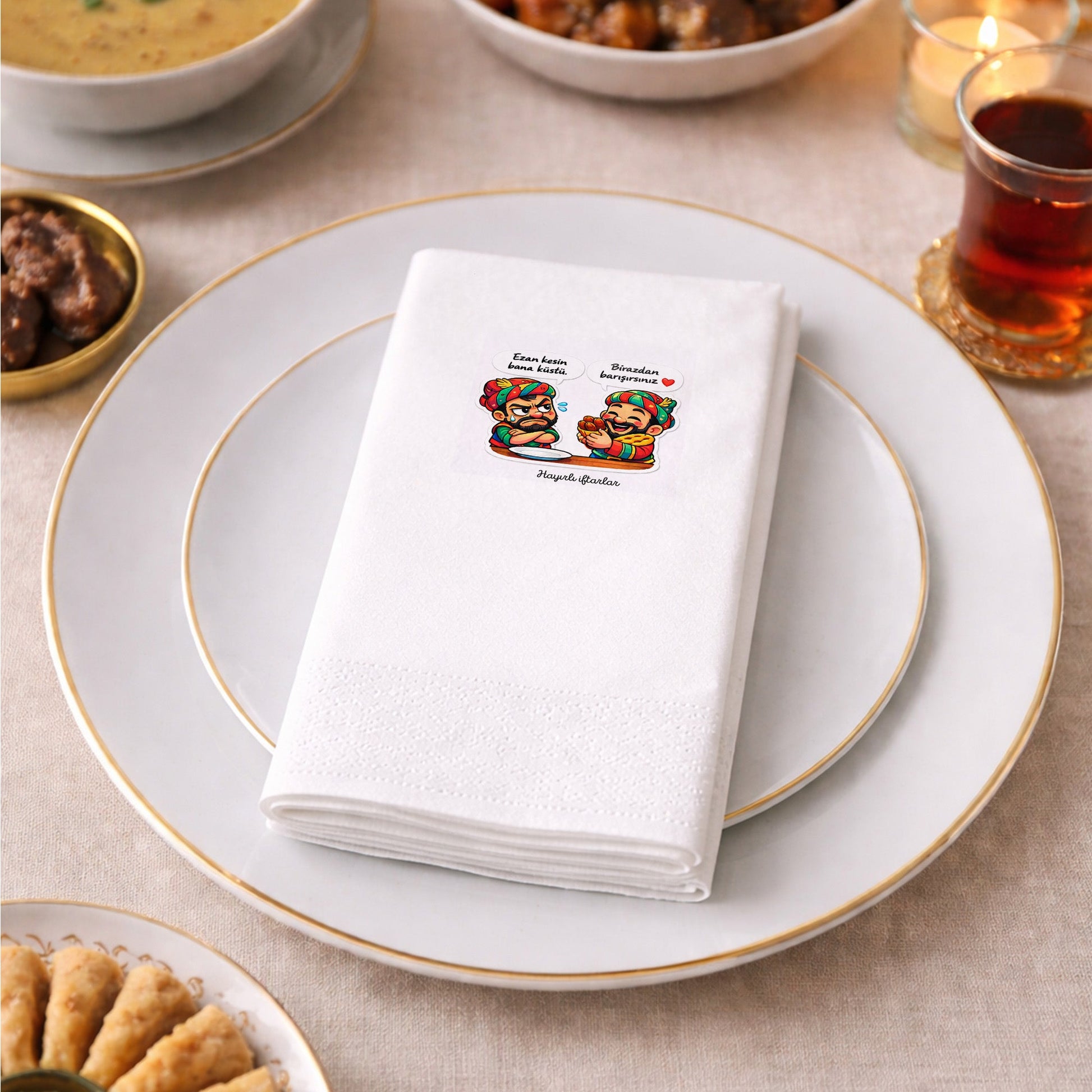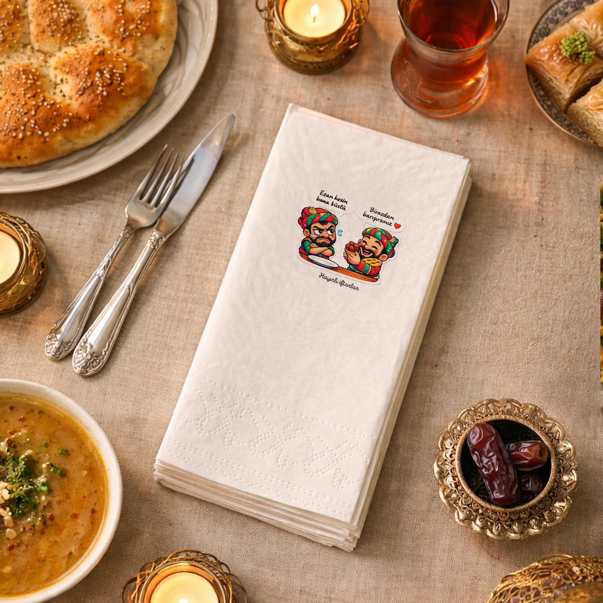 Karagöz–Hacivat esintili renkli ve eğlenceli karakter illüstrasyonları ile tasarlanan bu Ramazan Desenli Baskılı Peçete, özellikle çocuklu iftar sofraları için keyifli bir masa detayı sunar.