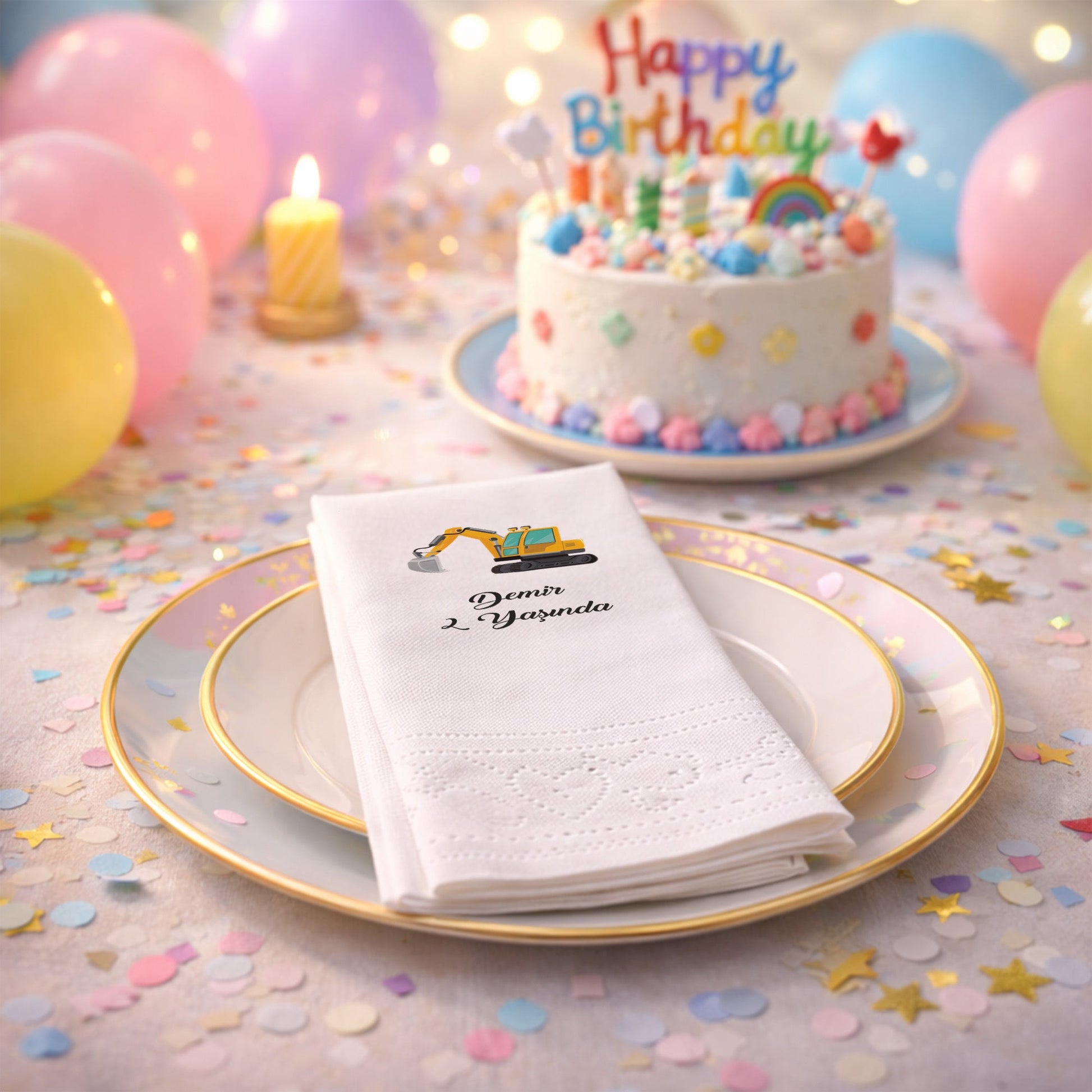 Ekskavatör illüstrasyonu ile tasarlanan bu peçete, inşaat araçlarını seven çocuklar için eğlenceli bir masa detayı sunar. Kişiye özel isim ve yaş bilgisi eklenerek hazırlanan tasarım, doğum günü organizasyonunu daha anlamlı hale getirir. Yumuşak dokulu, çift katlı yapısı sayesinde kullanımı rahattır. Gıda temasına uygun baskı ile üretilmiştir. Pasta ve ikram sunumlarında konsepti güçlendirir. Evde yapılan kutlamalardan temalı organizasyonlara kadar geniş bir kullanım alanına sahiptir. Erkek çocuk doğum günleri için enerjik ve uyumlu bir masa görünümü oluşturur.