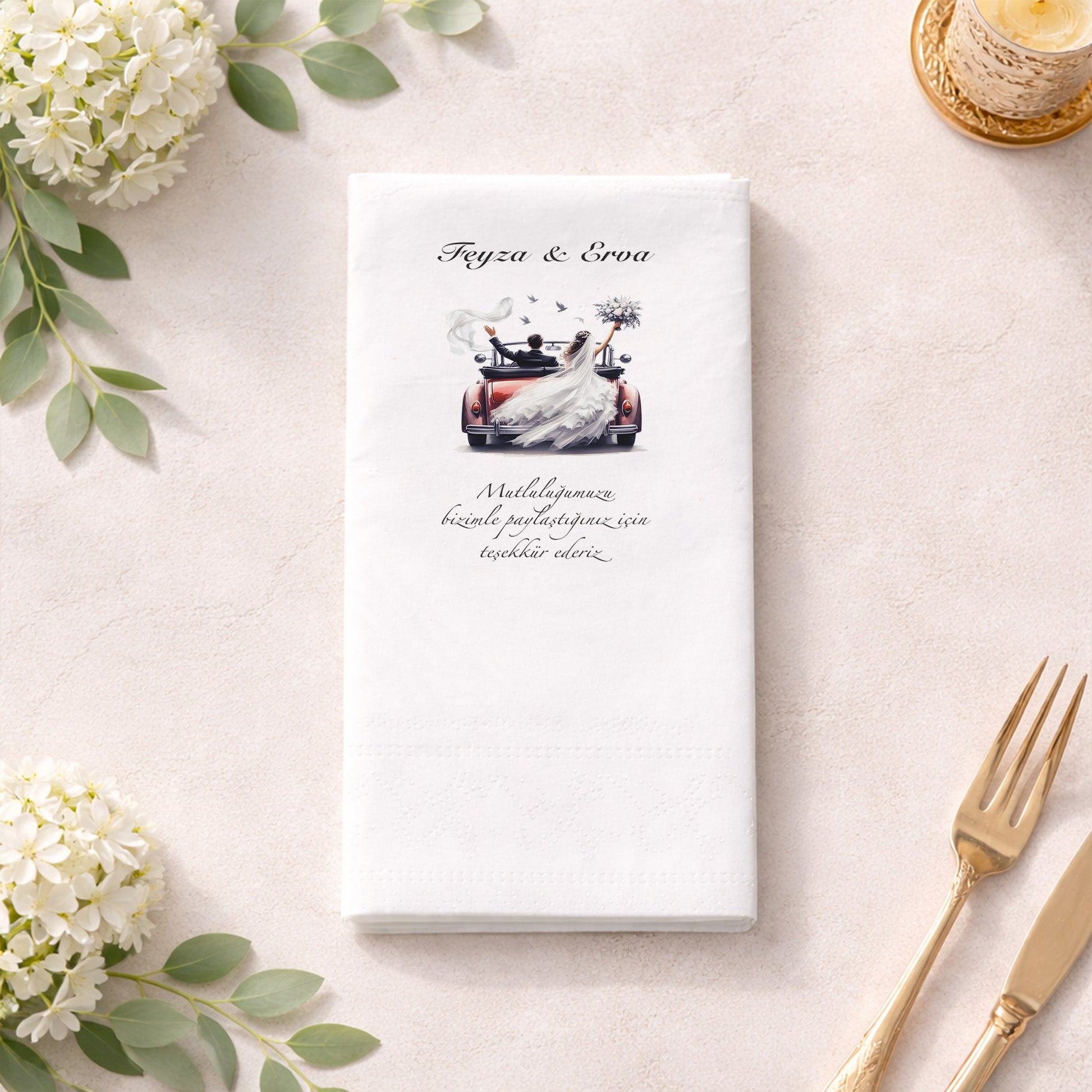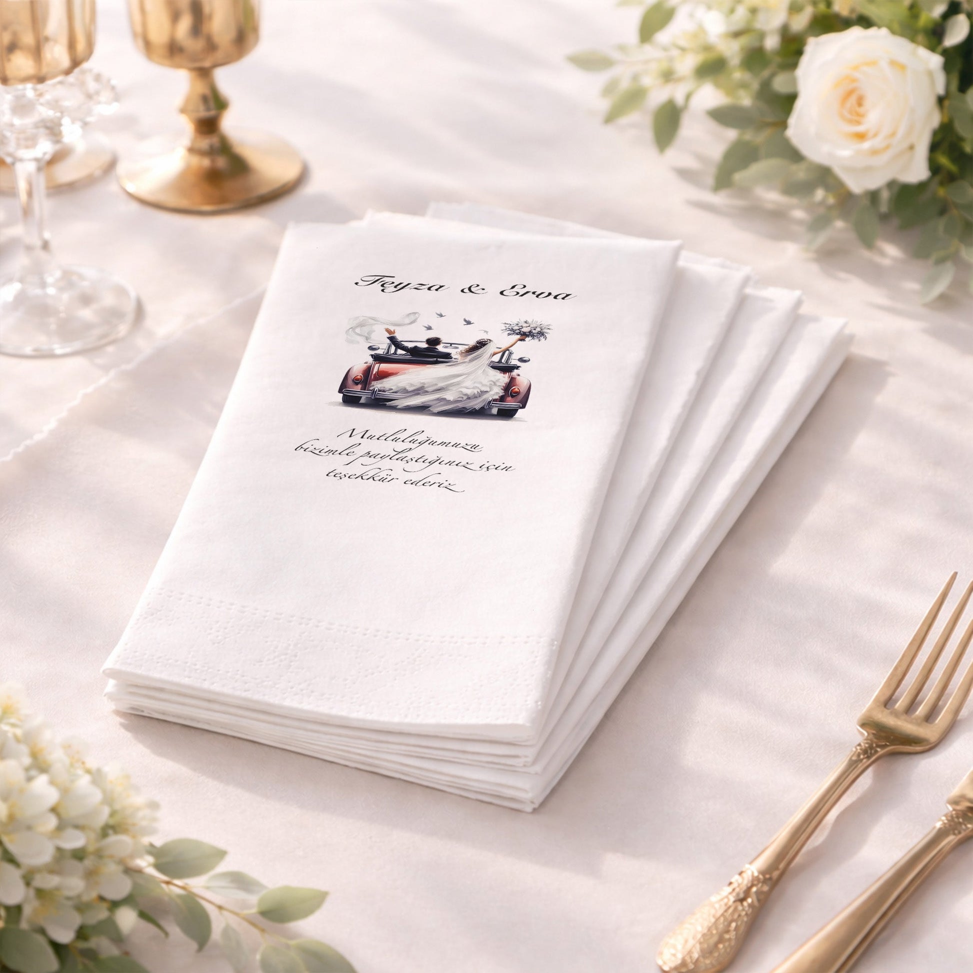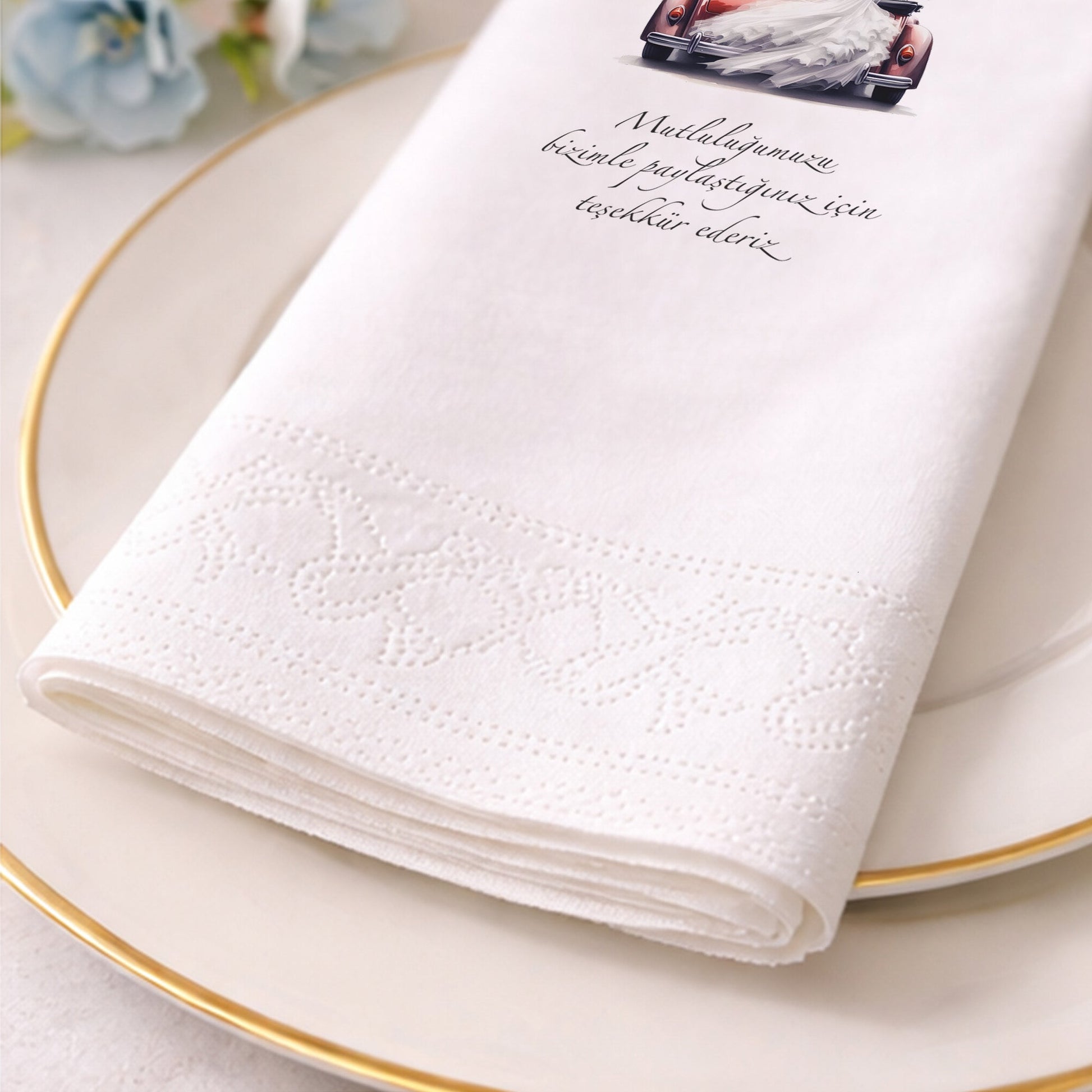 Feyza ve Erva için tasarlanan teşekkür mesajlı baskılı peçete, düğün organizasyonlarında zarif bir veda ve teşekkür ifadesi sunar. Romantik illüstrasyon ve akıcı yazı stili, davetlilere samimi bir mesaj iletmenin şık bir yoludur. Özel gün peçetesi olarak masa düzenini tamamlar ve organizasyona duygusal bir derinlik katar. Organizasyon peçetesi tercih eden çiftler için profesyonel ve estetik bir alternatiftir. Baskılı peçete, düğün peçetesi konseptini güçlendirirken davetliler için kalıcı bir hatıra niteliği taşır.