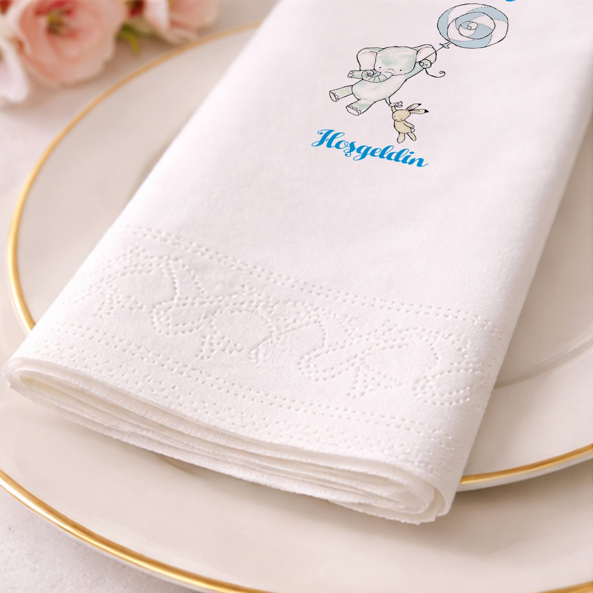 Pembe balon detaylı fil illüstrasyonu ile hazırlanan bu peçete, kız bebek doğum günü, baby shower ve yenidoğan organizasyonları için zarif bir masa düzeni sunar. Yumuşak pastel tonlar, romantik ve sakin bir atmosfer oluşturur. Kişiye özel isim bilgisi eklenerek hazırlanan tasarım, kutlamanızı daha anlamlı hale getirir. Çift katlı ve yumuşak dokulu yapısı ile konforlu bir kullanım sağlar. Gıda temasına uygun baskı ile üretilmiştir. Pasta ve ikram sunumlarında konsepti destekleyen şık bir masa detayıdır.