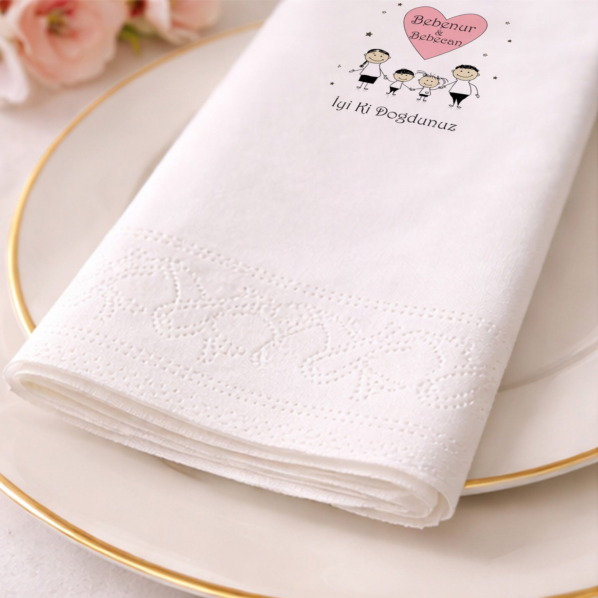 Flamingo illüstrasyonu ve şiirsel metniyle tasarlanan bu peçete, yenidoğan ve baby shower organizasyonları için zarif ve modern bir sunum sağlar. Minimal tasarımı sayesinde masa düzenine sade bir şıklık kazandırır. Kişiye özel isim bilgisi eklenerek hazırlanan tasarım, organizasyonu daha anlamlı hale getirir. Çift katlı ve yumuşak dokulu yapısı ile konforlu bir kullanım sunar. Gıda temasına uygun baskı teknolojisi ile üretilmiştir. Şiirsel ve estetik detayları seven aileler için ideal bir masa aksesuarıdır.
