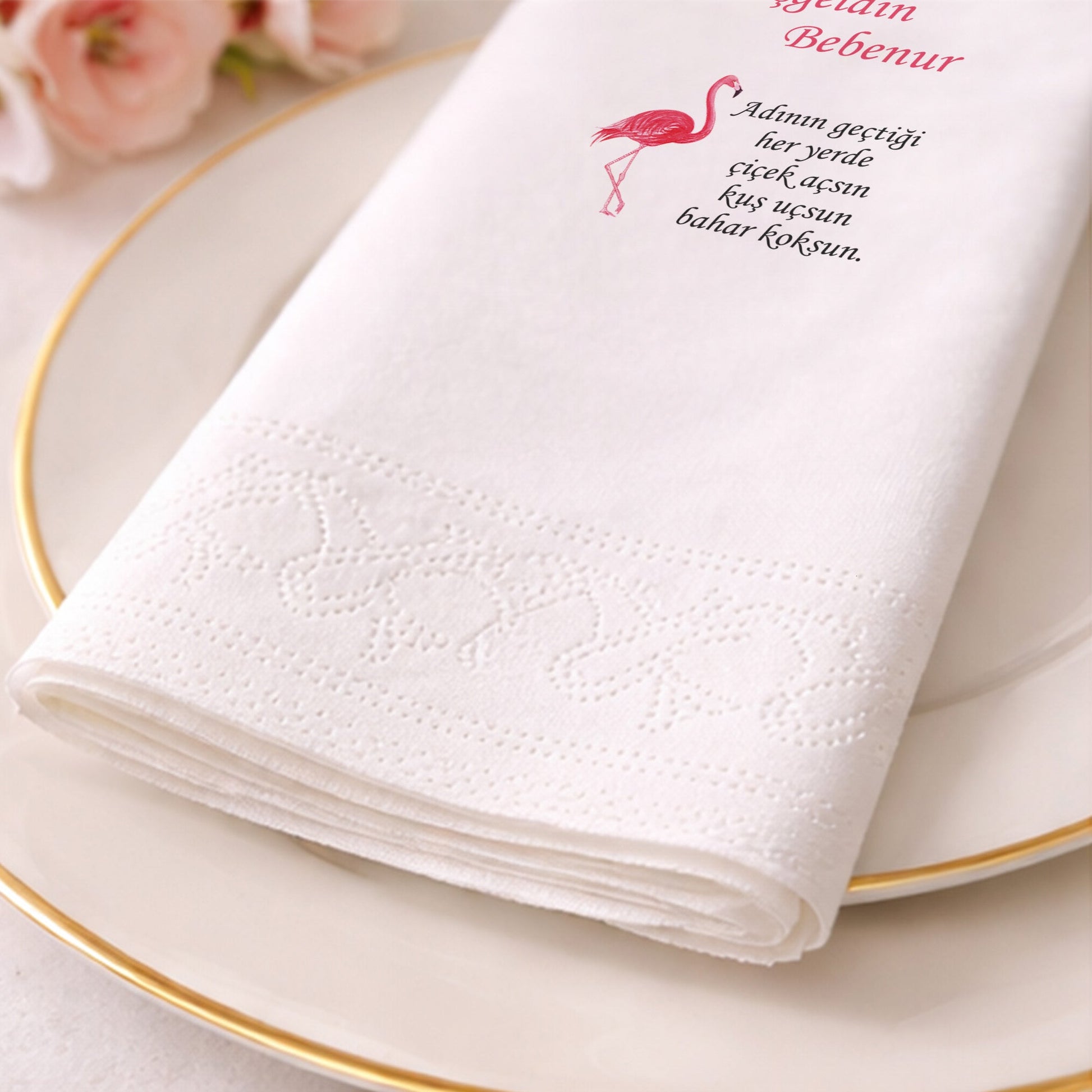 Flamingo illüstrasyonu ve zarif yazı stiliyle hazırlanan bu peçete, kız bebek için düzenlenen hoş geldin bebek ve mevlit organizasyonlarına modern bir dokunuş katar. Kişiye özel isim veya mesaj eklenebilmesi sayesinde organizasyon tamamen size özel hale gelir. Pastel pembe tonları masa düzenine ferah ve şık bir görünüm kazandırır. Çift katlı ve yumuşak dokulu yapısı ile hem estetik hem de kullanışlıdır. Gıda temasına uygun baskı ile üretilmiştir. Bebek ziyaretleri, baby shower partileri ve ev davetlerinde ikram sunumlarını tamamlayan zarif bir detay olarak tercih edilebilir.