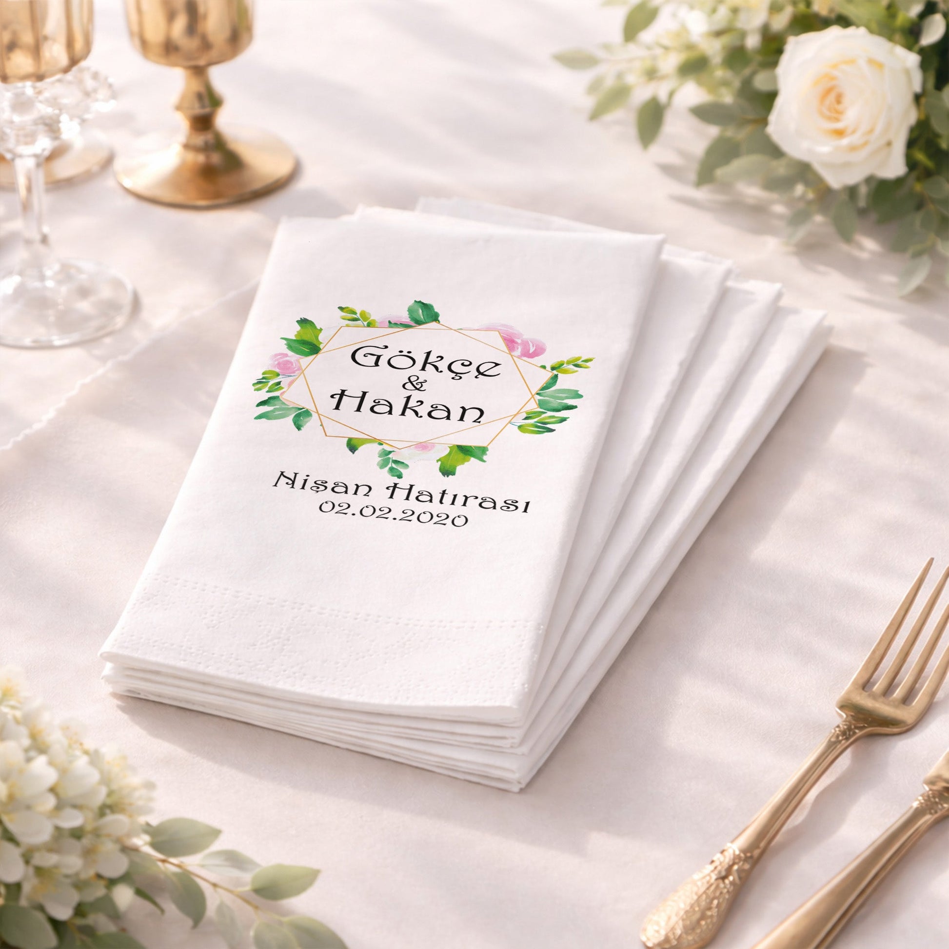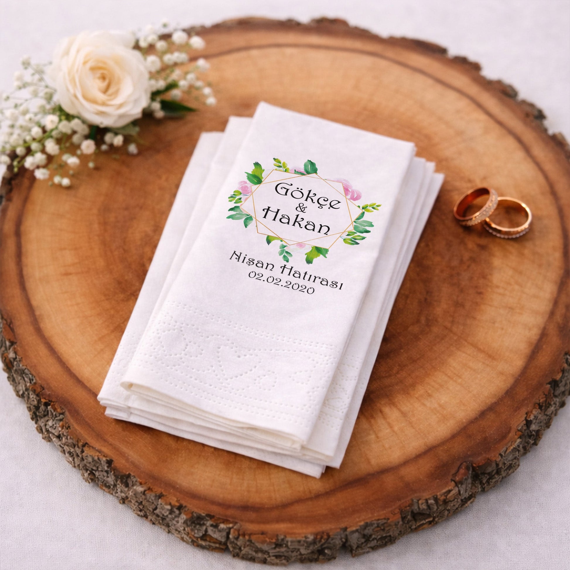 Altın geometrik çerçeve ve yeşil yaprak detaylarıyla tasarlanan bu baskılı peçete, nişan organizasyonları için modern ve zarif bir görünüm sunar. İsim ve tarih bilgisiyle kişiselleştirilen tasarım, özel gün peçetesi olarak davetin anlamını güçlendirir. Organizasyon peçetesi olarak masa düzenine dengeli ve şık bir bütünlük kazandırır. Nişan peçetesi kullanımına uygun olan ürün, baskılı peçete kalitesi sayesinde net yazı ve canlı renkler sunar. Minimal ama güçlü tasarımıyla hem klasik hem modern konseptlerle uyum sağlar. Hatıra değeri yüksek, güven veren ve profesyonel bir sunum arayan çiftler için ideal bir tercihtir.