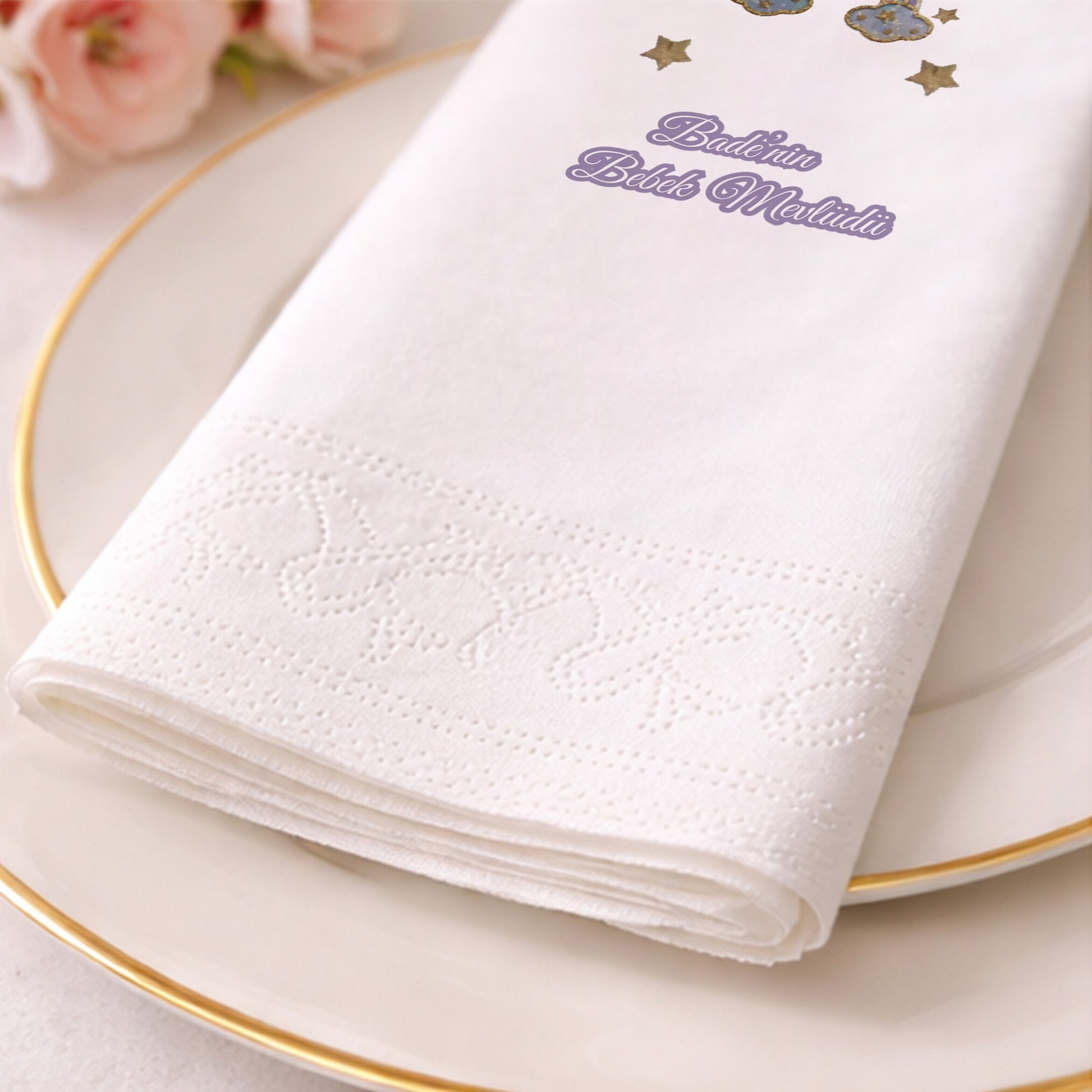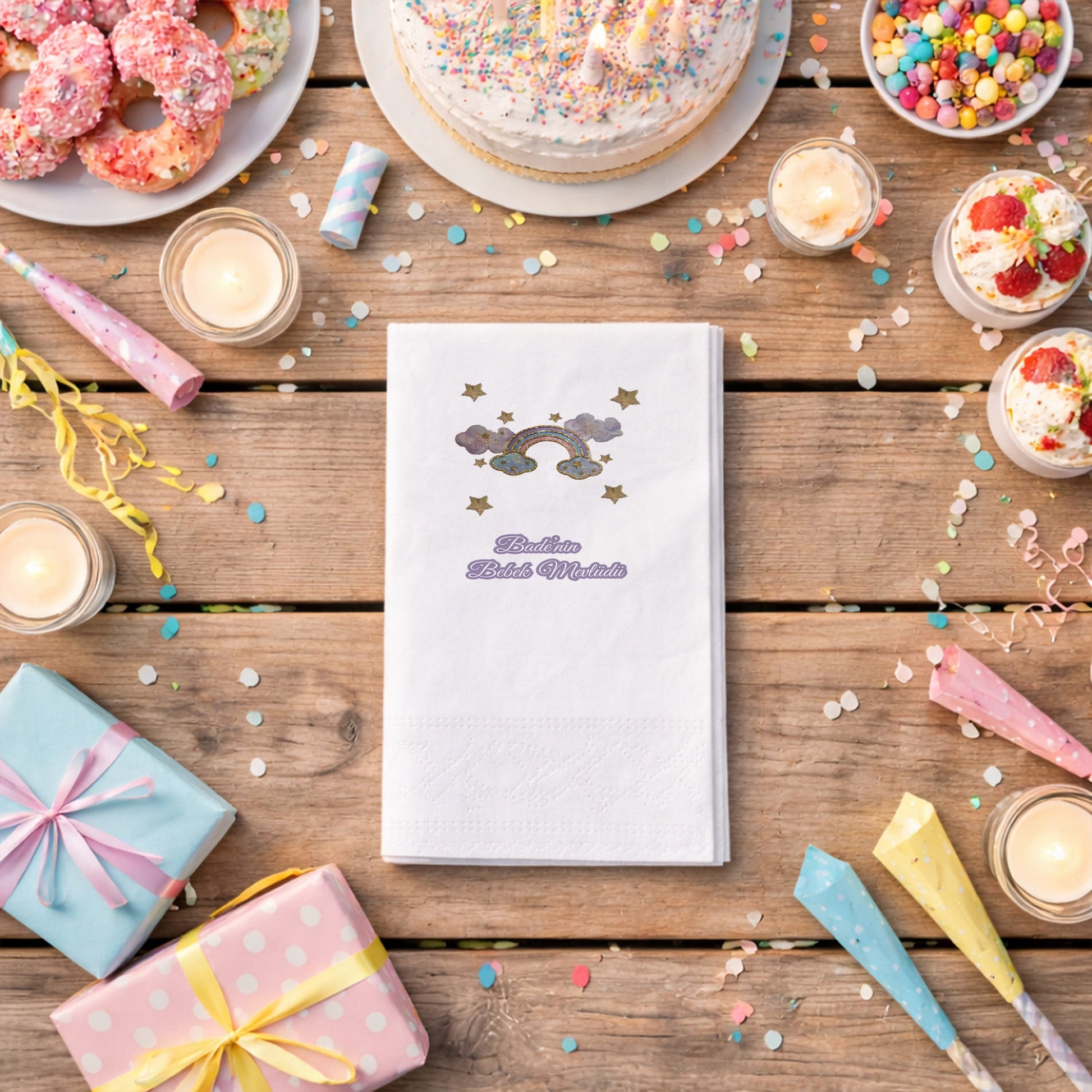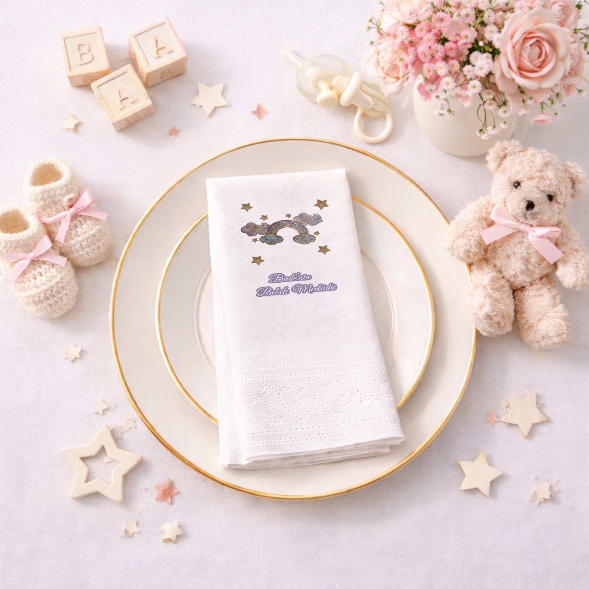 Gökkuşağı ve yıldız detaylarıyla tasarlanan bu peçete, bebek mevlidi ve baby shower organizasyonları için yumuşak ve huzurlu bir atmosfer sunar. Kişiye özel isim bilgisi ile hazırlanarak organizasyonunuzu anlamlı hale getirir. Pastel renk paleti sayesinde masa düzenine uyum sağlar. Çift katlı yapısı ile dayanıklı ve kullanışlıdır. Gıda temasına uygun baskı teknolojisi ile üretilmiştir. Bebek mevlidi, hoş geldin bebek ve diş buğdayı organizasyonlarında tercih edilebilir. Zarif ve sıcak bir masa sunumu oluşturmak isteyenler için ideal bir üründür.