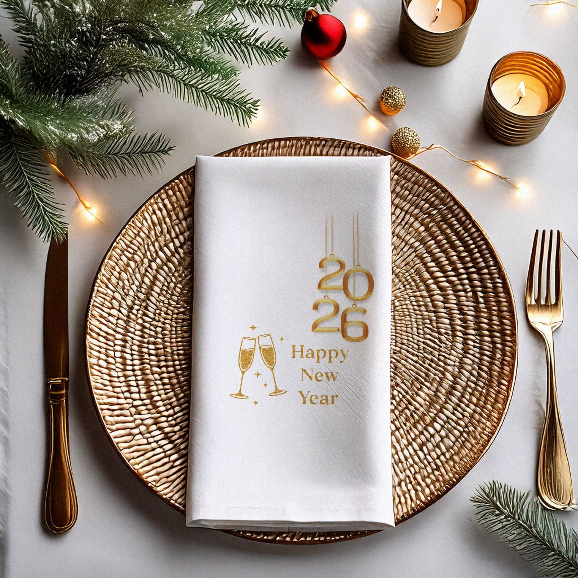 Altın tonlarında hazırlanmış 2026 yazısı, parıltılı şampanya kadehleri ve modern Happy New Year tipografisiyle tasarlanan bu özel peçete; yılbaşı sofralarına lüks, zarif ve kutlama havası katan premium bir üründür.