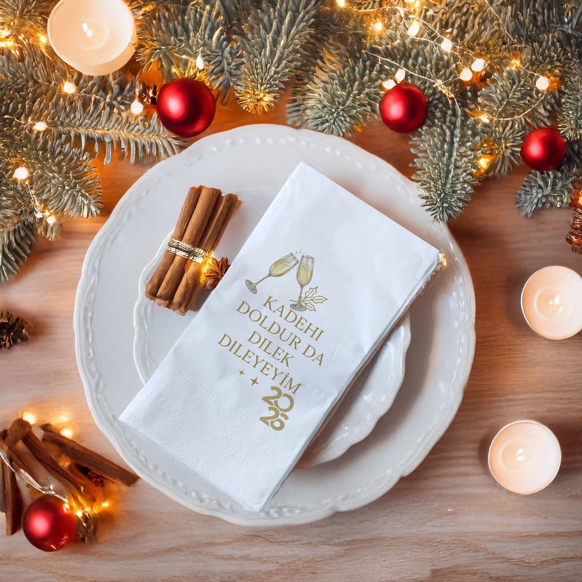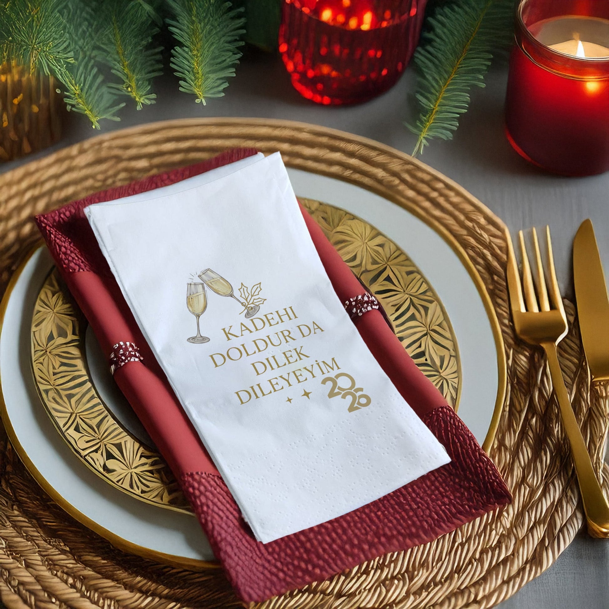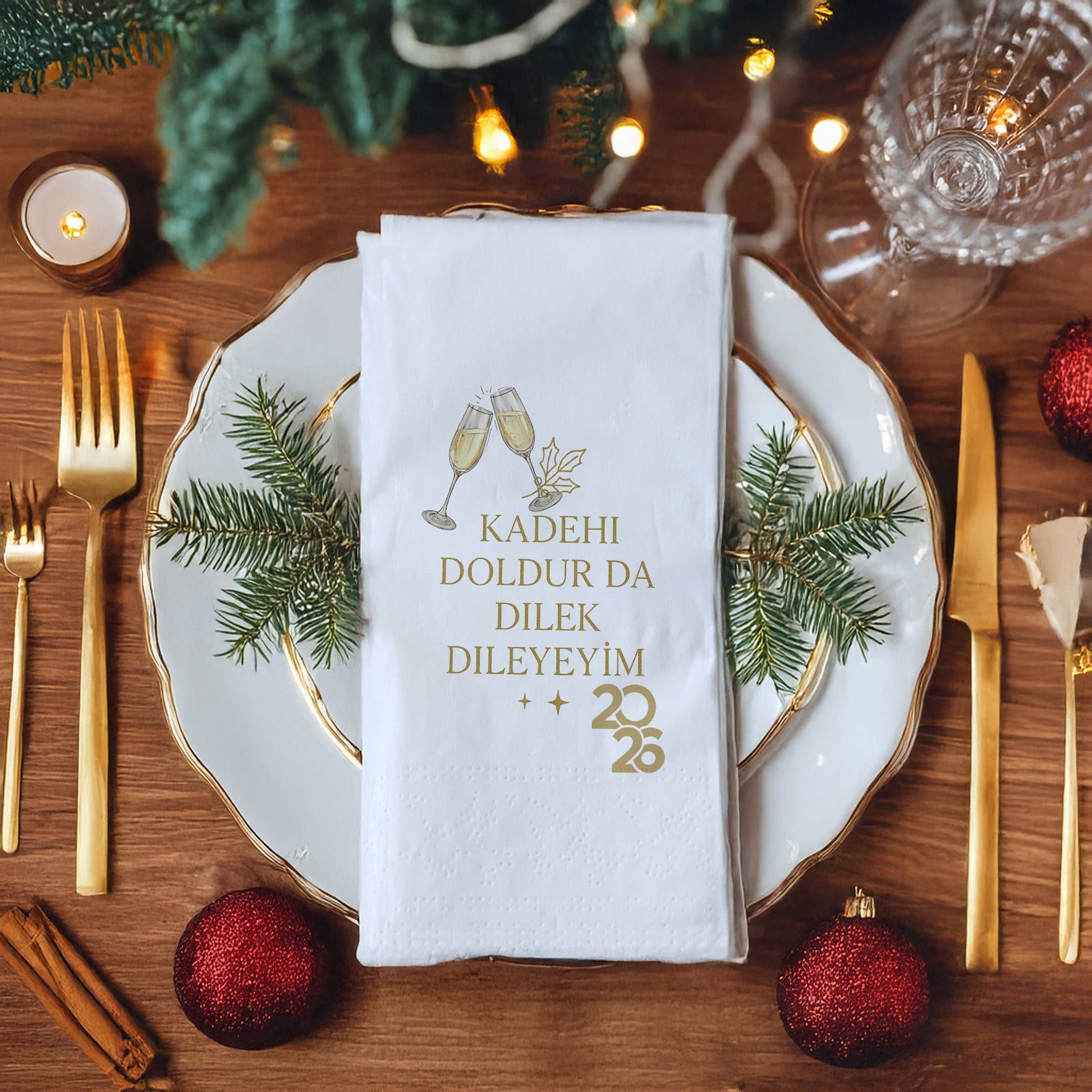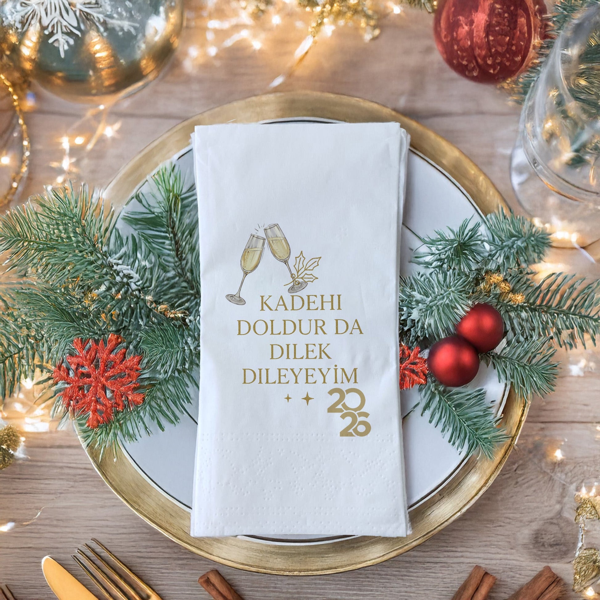 Yılbaşı sofranıza zarafet ve eğlenceli bir dokunuş katacak bu gold şampanya kadehi tasarımlı, modern tipografisiyle “Kadehi Doldur Da Dilek Dileyeyim” yazısı bulunan özel yılbaşı peçetesi; yetişkin yılbaşı partileri, davet sofraları ve şık masa düzenleri için ideal bir seçenektir.