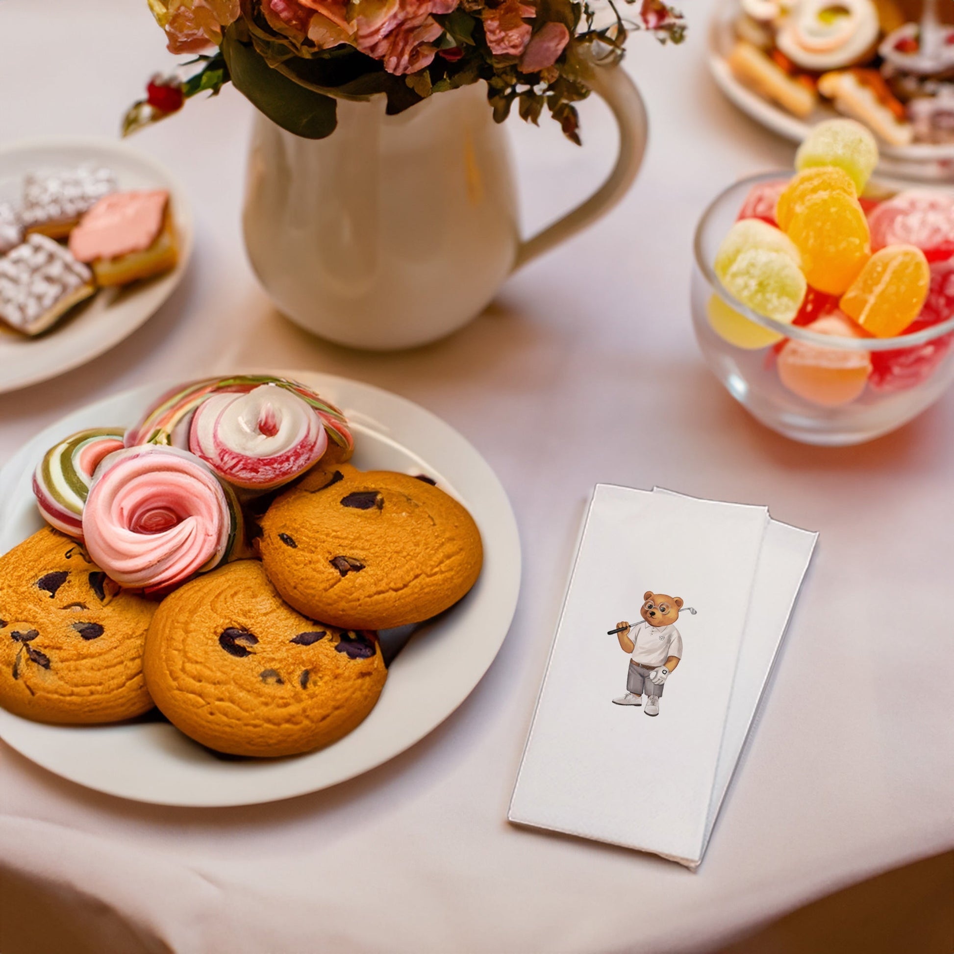 Her anınıza anlam katan ve duygularınızı yansıtan özel bir dokunuş: "Golf oynayan Ayıcık" Baskılı Peçeteler! Çay keyfinizi daha anlamlı hale getirecek ve sevdiklerinizle paylaşacağınız samimi anları renklendirecek.