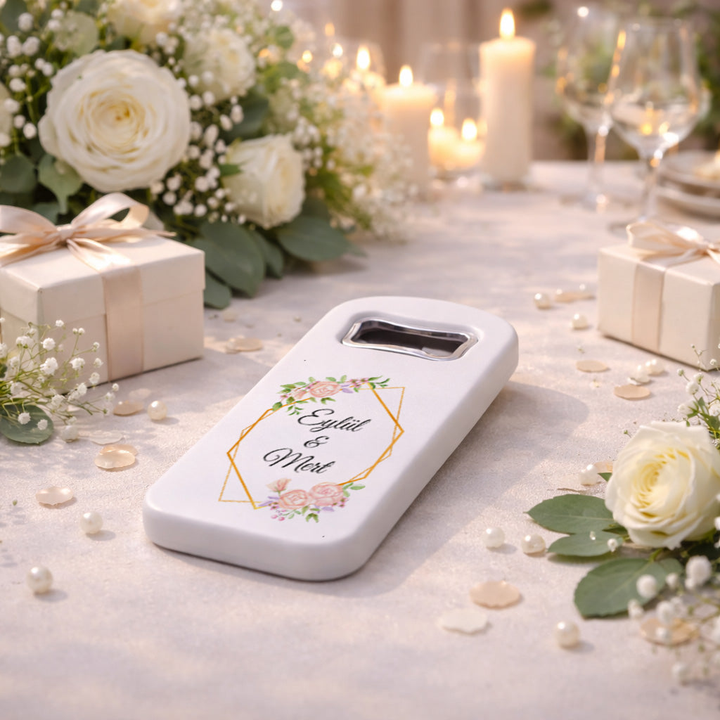 Düğün, nişan, söz ve kına gecesi gibi özel organizasyonlarda misafirlerinize sunabileceğiniz bu şık magnet açacak, klasik hediyelik anlayışının ötesine geçerek hem kullanışlı hem de unutulmaz bir hatıra alternatifi sunar. Zarif tasarımı ile masa düzeninize uyum sağlar ve davetinizin genel konseptini tamamlar. Misafirlerinizin her kullanımda sizi hatırlayacağı bu özel ürün, anlamlı ve kalıcı bir hediye arayanlar için ideal bir seçimdir.