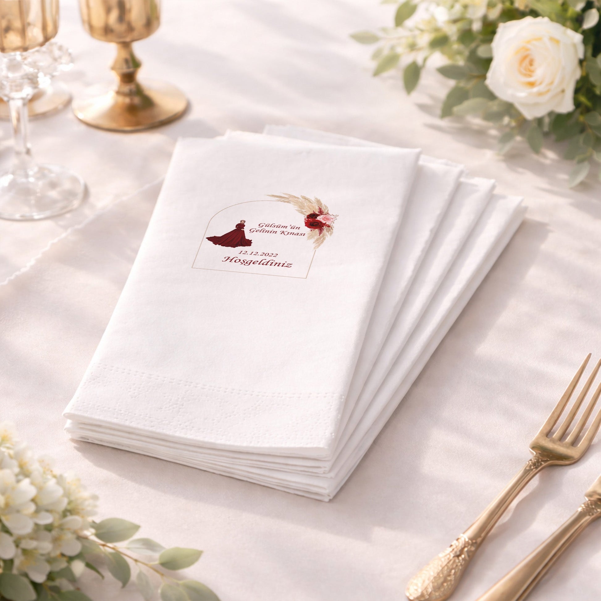 Özel günlerinize zarafet katan bu baskılı peçete, Gülsüm’ün Gelin Kınası için özel olarak tasarlanmıştır. Modern kemer tasarımı ve sonbahar esintili pampas otu detaylarıyla süslenen ürün, bordo abiyeli gelin figürüyle kına gecenizin konseptini tamamlar. Yüksek kaliteli baskı teknikleri kullanılarak üretilen bu organizasyon peçetesi, masalarınızda estetik bir görünüm sergilerken misafirlerinize kendilerini özel hissettirir. Düğün ve kına hazırlıklarında detaylara önem veren gelin adayları için ideal bir seçimdir. Dayanıklı yapısı ve yumuşak dokusu sayesinde hem dekoratif hem de işlevseldir. Kına gecesi süslemeleri arasında fark yaratacak bu özel tasarım peçete ile en mutlu anlarınızı kalıcı birer hatıraya dönüştürebilirsiniz. Davetlilerinizin hafızasında yer edecek şık bir sunum için bu ürünü tercih edebilirsiniz.