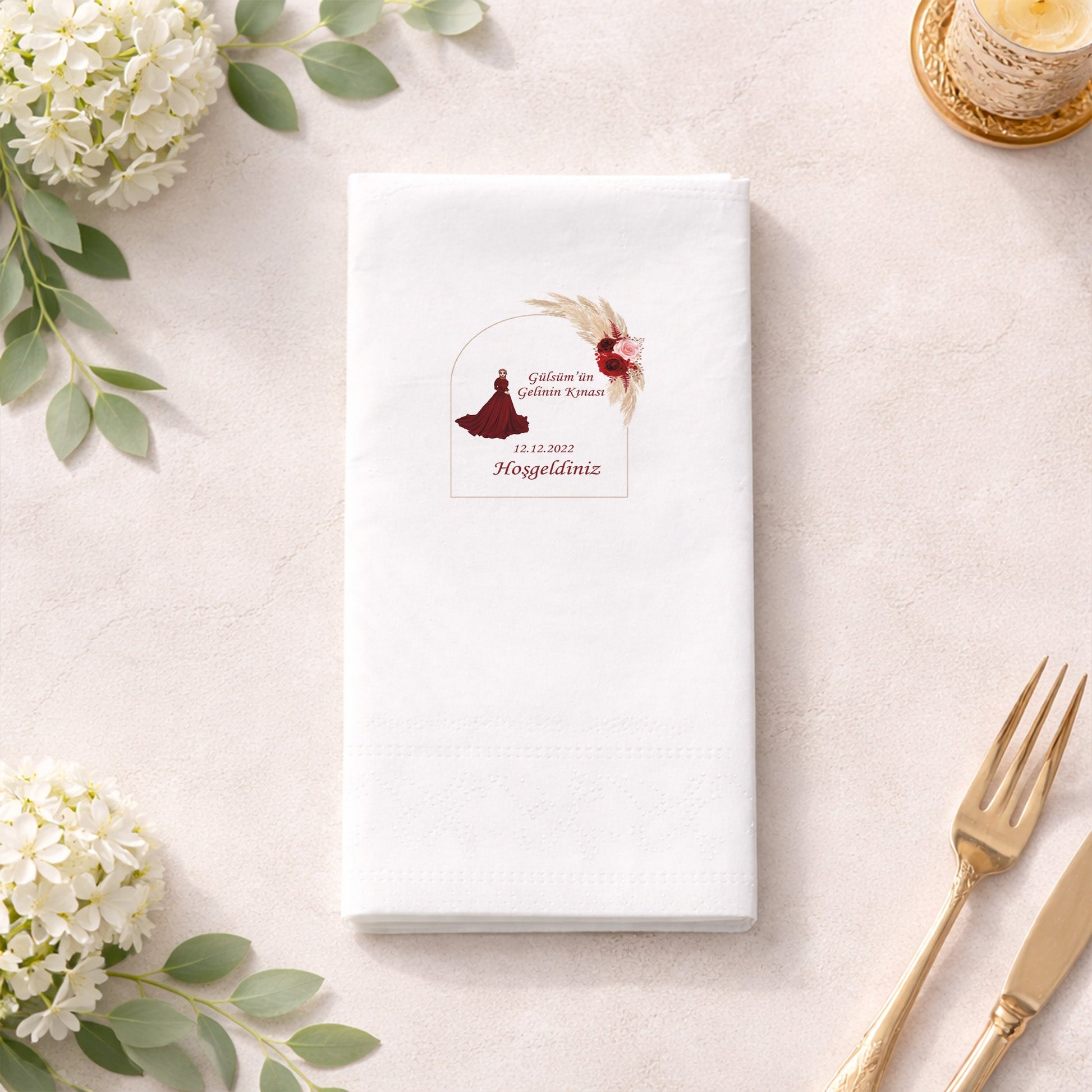 Gülsüm’ün Gelin Kınası için tasarlanan bu model, kabarık etekli bordo elbise illüstrasyonu ile kına gecesi ihtişamını masalara taşıyor. Arşivsel kemer tasarımı ve köşedeki çiçek buketi detayları, baskılı peçete ürününü görsel bir şölene dönüştürür. Organizasyonlarınızda kullanacağınız bu özel gün peçetesi, hem hijyenik bir çözüm sunar hem de dekoratif bir obje işlevi görür. Üstün kaliteli kağıt malzemesi üzerine uygulanan canlı renkler, temanızın bütünlüğünü korur. "Hoşgeldiniz" ibaresiyle misafirlerinizi nezaketle karşılayan bu tasarım, davetinizin kalitesini vurgular. Düğün, nişan ve kına gibi törenlerde fark yaratmak isteyenlerin tercihi olan bu peçete, kişiselleştirilmiş içeriğiyle anlam kazanır. Siz de bu şık tasarım ile kına masalarınızı taçlandırabilirsiniz.