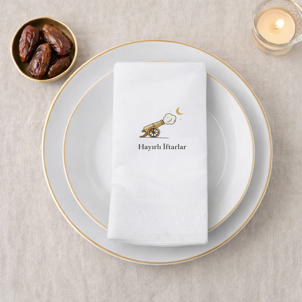 Geleneksel iftar topu ve hilal motifiyle tasarlanan bu Hayırlı İftarlar yazılı baskılı peçete, Ramazan’ın ruhunu sade ve zarif bir dille sofralara taşır.