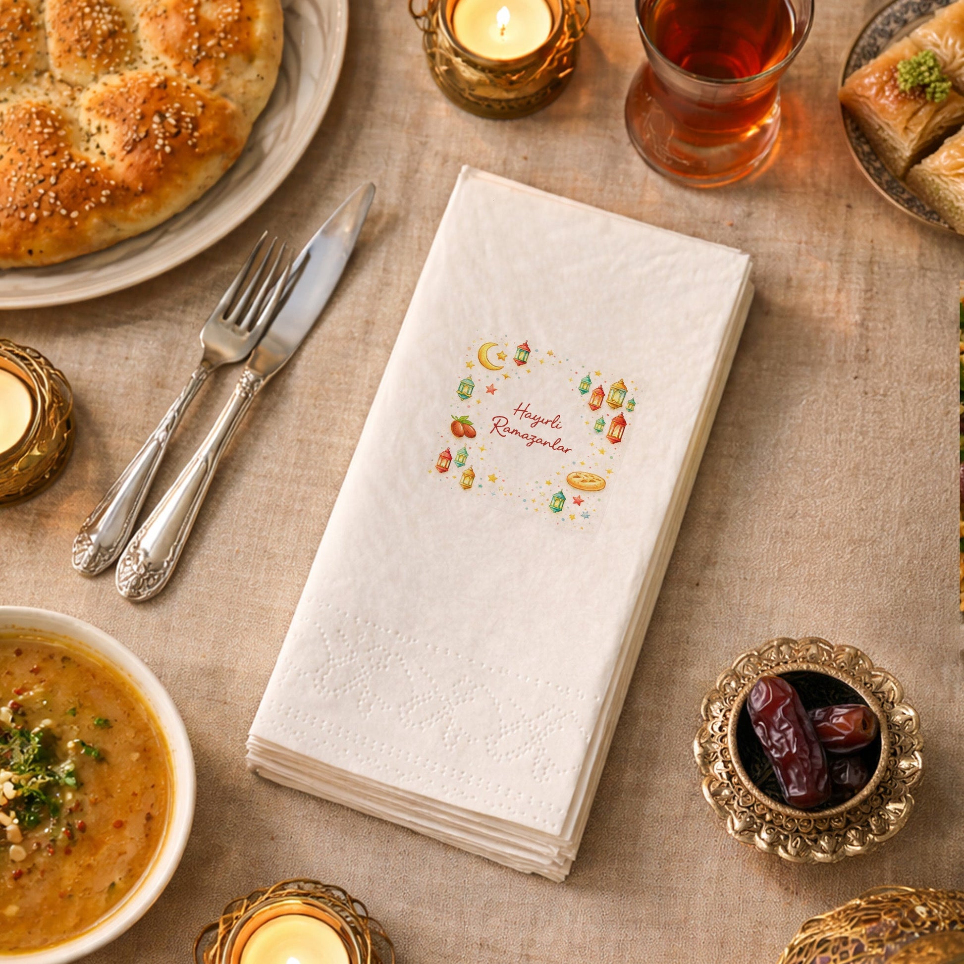 “Hayırlı Ramazanlar” yazılı bu Ramazan Desenli Baskılı Peçete, iftar sofralarına sıcak ve davetkâr bir atmosfer katar.