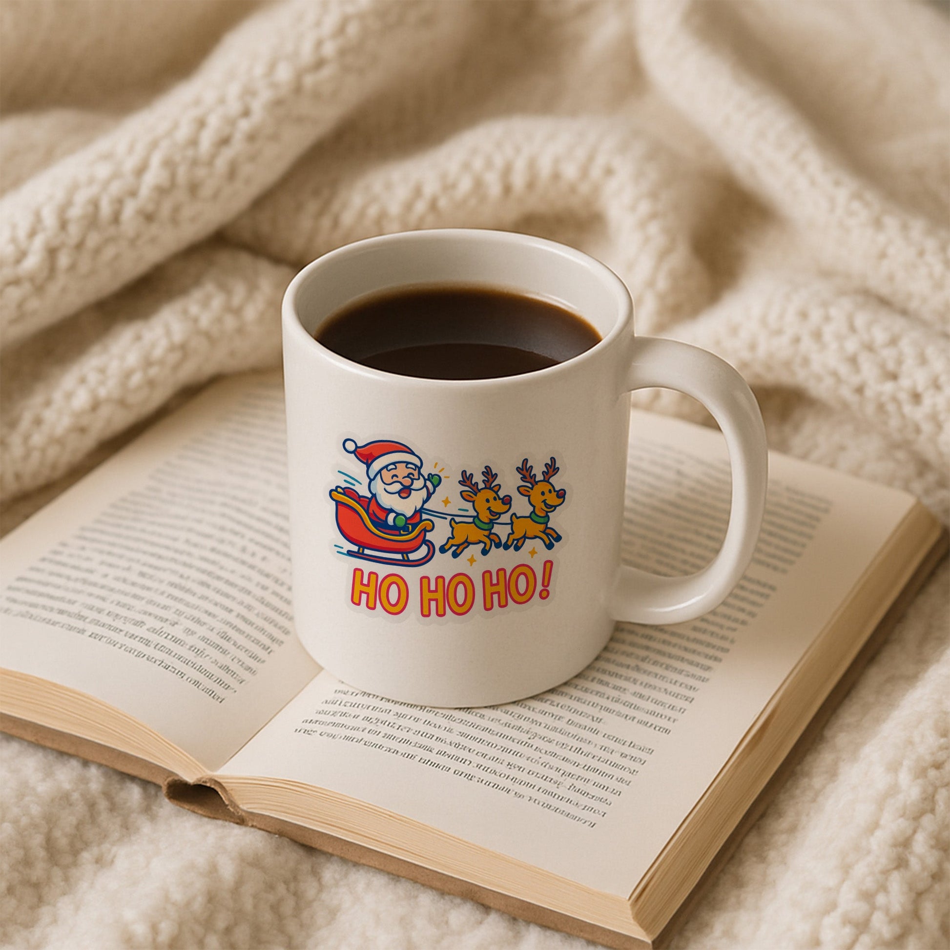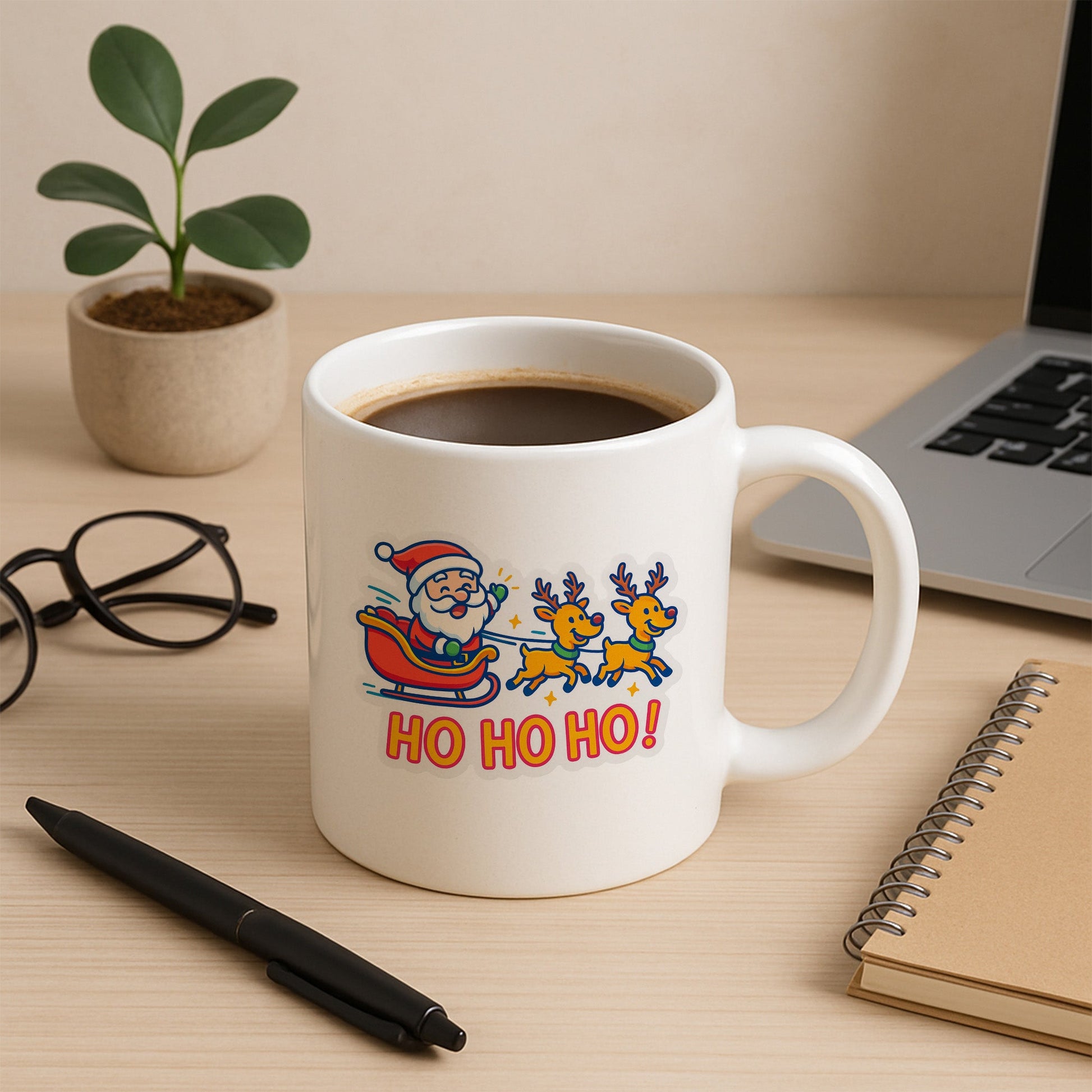 Bu tasarım kupa, Noel Baba’nın kızağı ve sevimli geyik figürleriyle yılbaşı neşesini sade ama enerjik bir şekilde yansıtır. “Ho Ho Ho!” yazısı, kupaya klasik Noel atmosferini tamamlayan eğlenceli bir dokunuş katar.