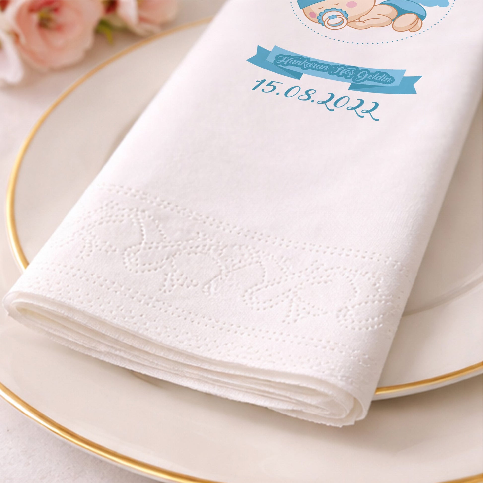 Uyuyan bebek illüstrasyonu ile tasarlanan bu özel peçete, yenidoğan ve hoş geldin bebek organizasyonları için zarif bir seçenektir. Kişiye özel isim ve tarih bilgisi eklenerek hazırlanabilir. Yumuşak pastel tonları ile masa düzenine sakin ve şık bir hava katar. Çift katlı yapısı sayesinde dayanıklı ve kullanışlıdır. Gıda temasına uygun baskı teknolojisi ile üretilmiştir. Bebek mevlidi, baby shower ve ev ziyaretleri için idealdir. Misafirlerinize özenli ve anlamlı bir sunum yapmanızı sağlar.