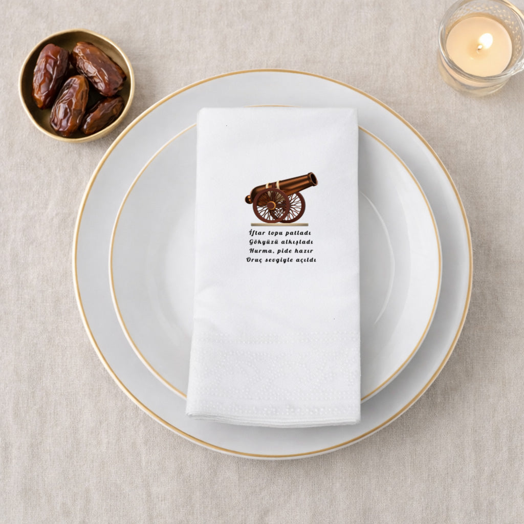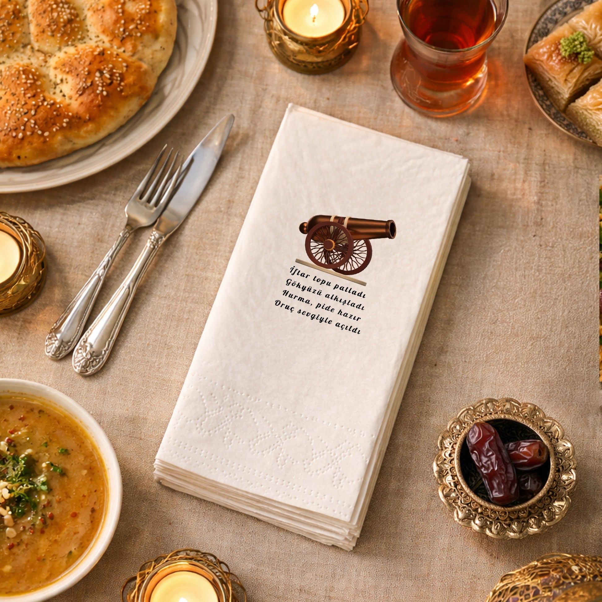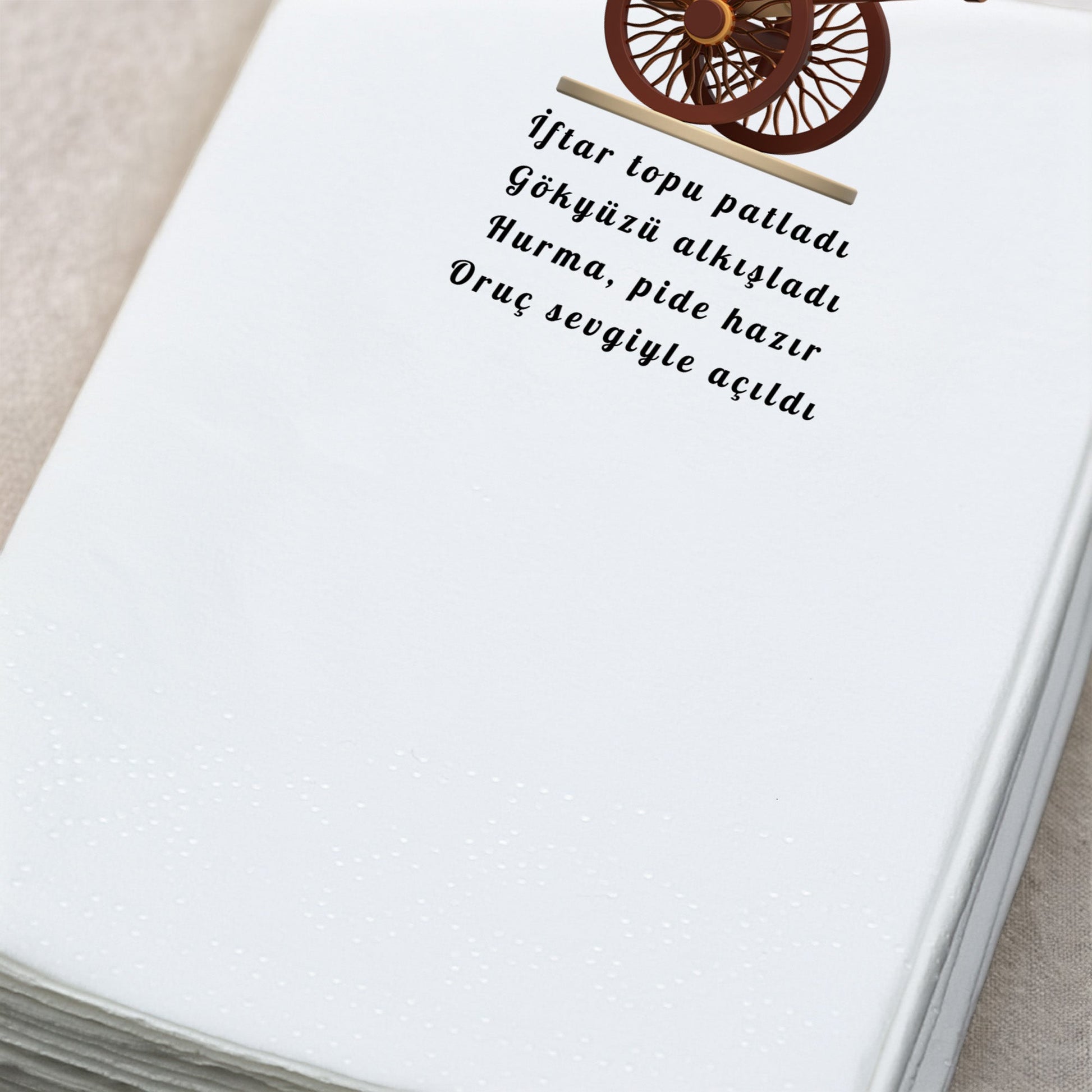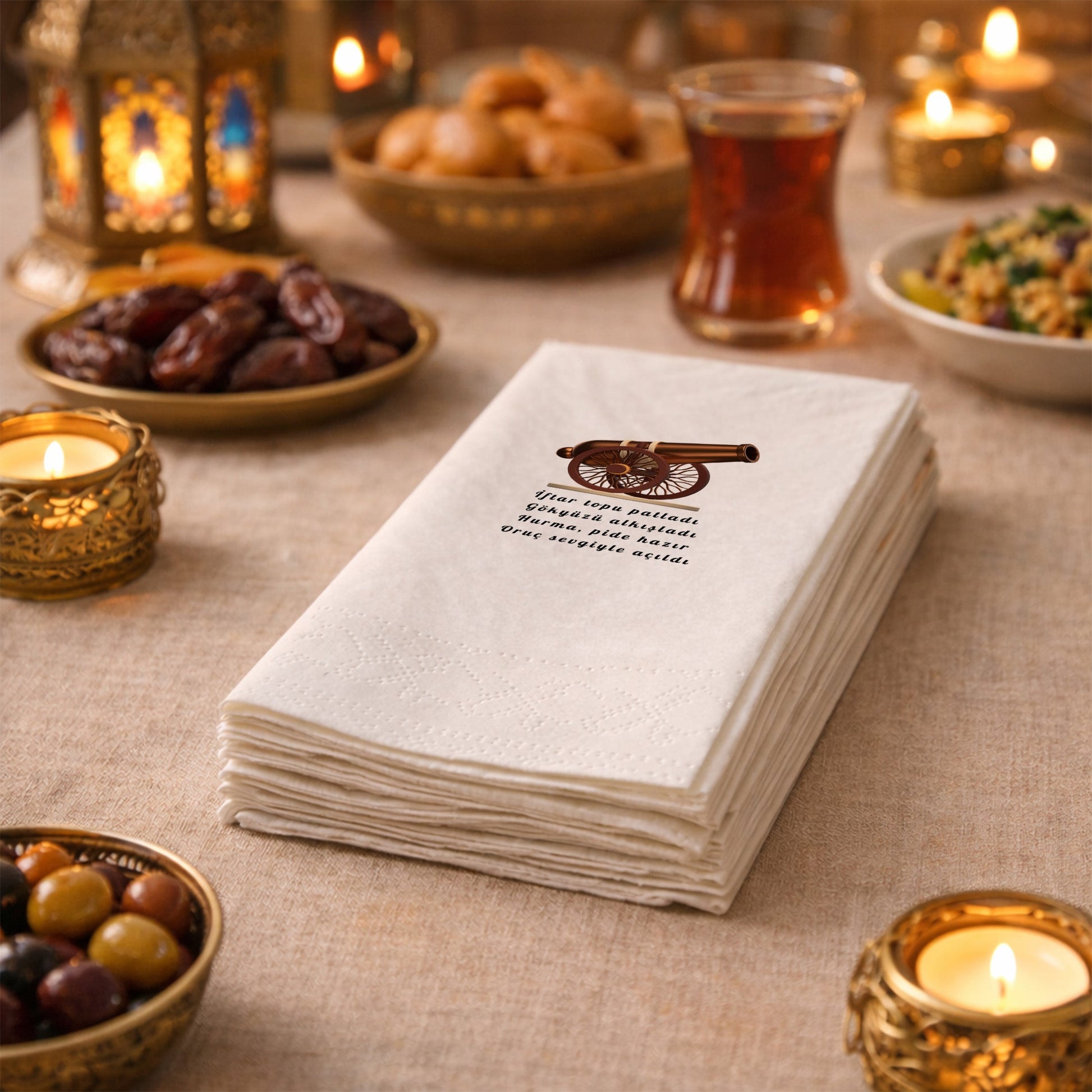 Üzerinde iftar topu illüstrasyonu ve geleneksel mani bulunan bu Ramazan Desenli Baskılı Peçete, nostaljik Ramazan akşamlarını sofraya taşır.